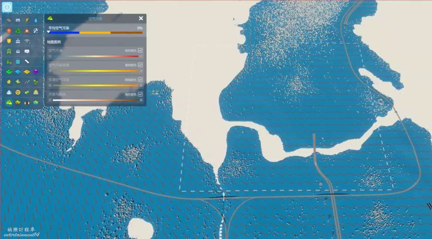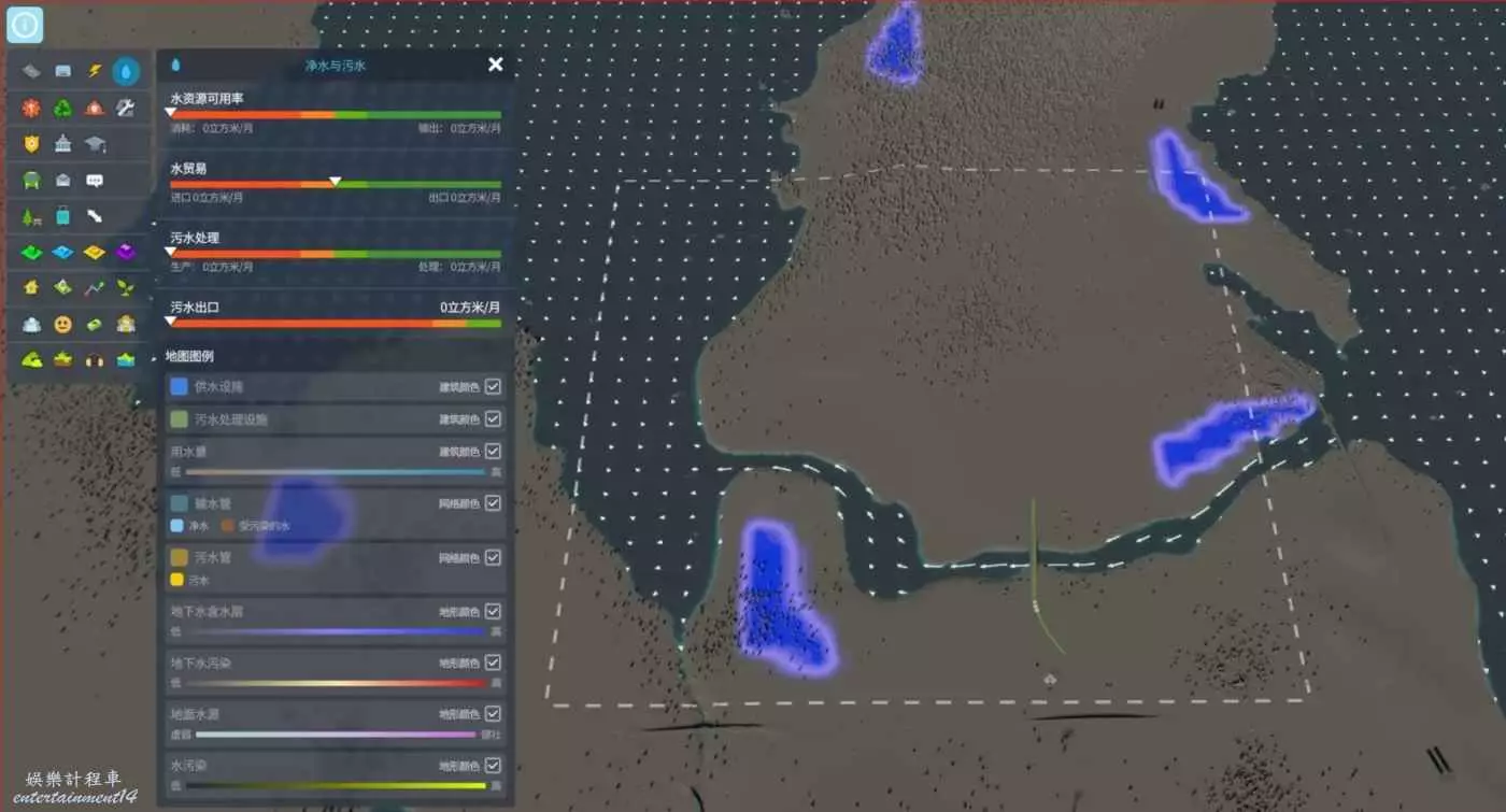 觀察完這兩種資訊我們根據風向決定工業區的位置(地圖右下角),而抽水站可以放置在地圖紅右上的小入水口,排污口放置於左側,就能夠保證開局的各種污染不會影響到住宅區降低幸福度,同時還能減少市民患病幾率。