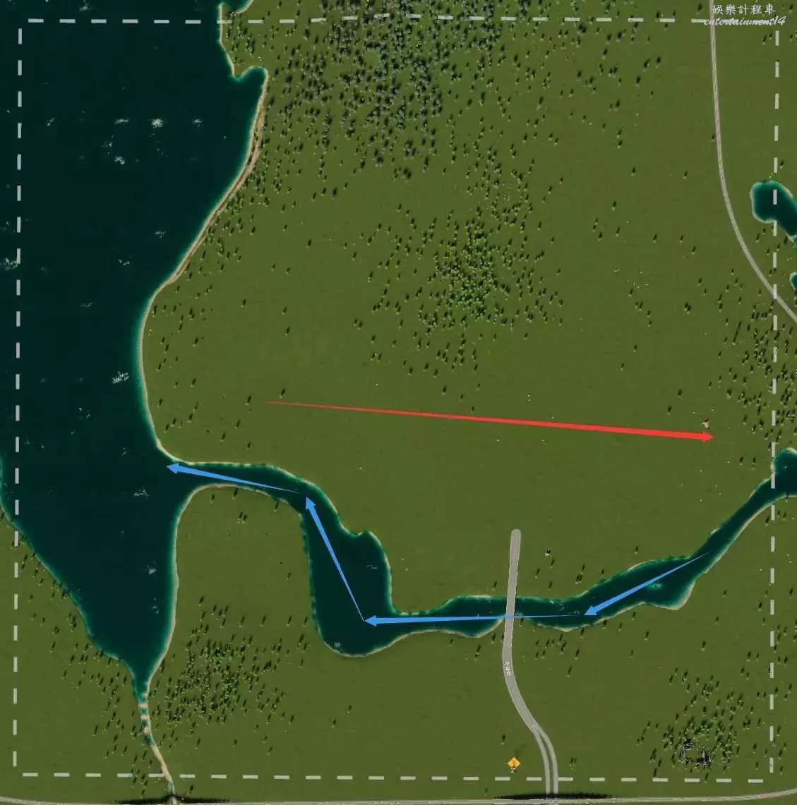 天際線因為有不少的系統,所以在開局就構思好整體佈局非常重要,初始的佈局如果不夠合理如工業區位於上風向,抽水口在下游會導致整個城市容易患病同時幸福度較低,影響我們的後續發展。所以開局我們需要先確定水流方向以及風向。