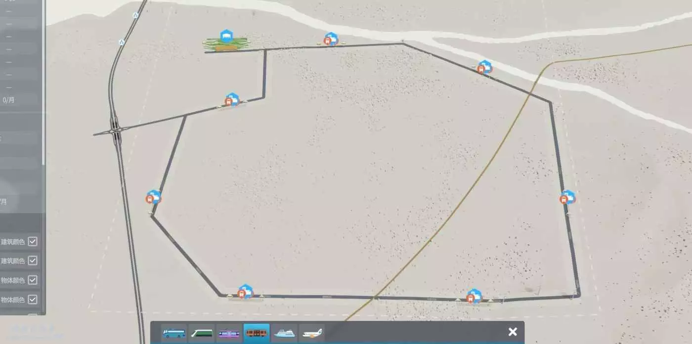 連接完全部地鐵站之後線路1就完成了(下圖將默認的綠色線修改為了紅色醒目一點)。但是此時並沒有通車,我們還需要將地鐵總站接入線路,使用軌道連接總站其中一個軌道口和地鐵站即可,接通後總站會派出地鐵進入環線,我們的地鐵線路就完成。
