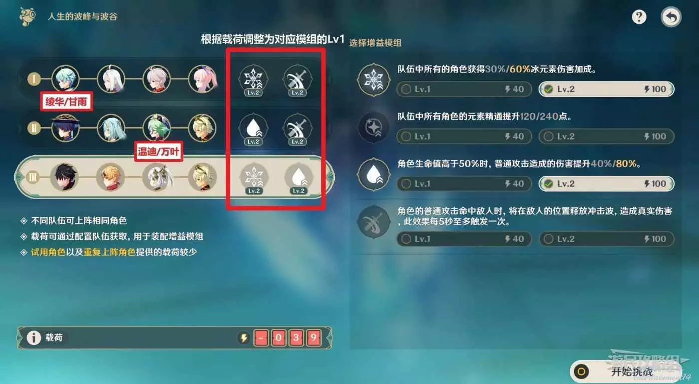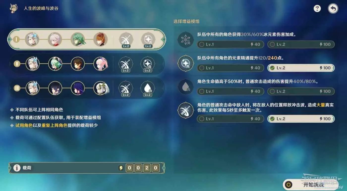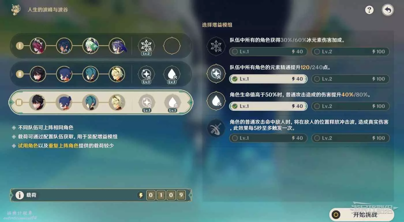 注意載荷不會影響最終的得分,只是用來兌換增益模組的,上陣的不同角色越多,載荷越大,就能選擇消耗載荷更多的增益模組,不會影響最終得分。但載荷量與角色等級有關,例如上陣90級的香菱和50級的香菱,所獲得的的載荷量是不一樣的。