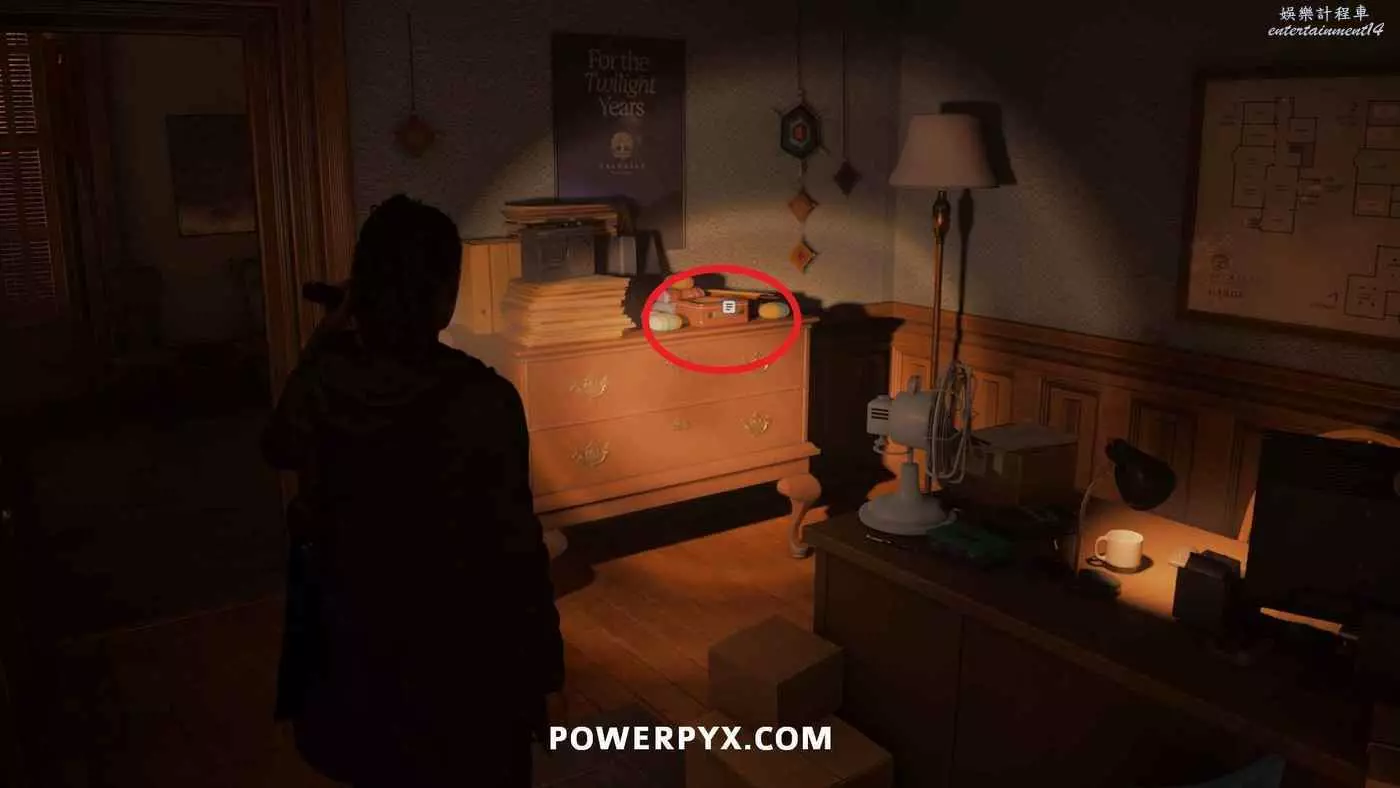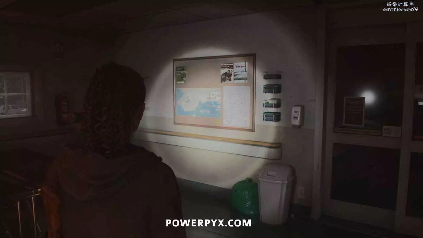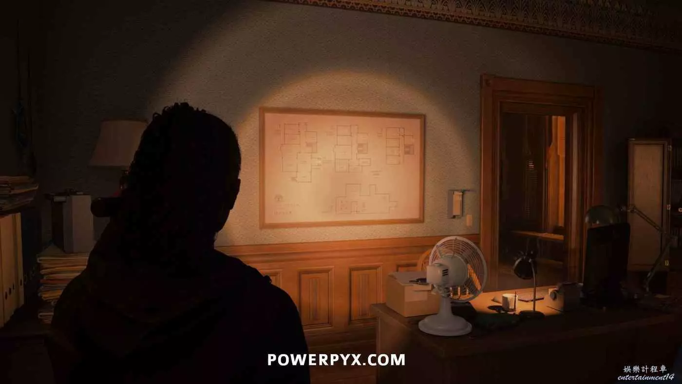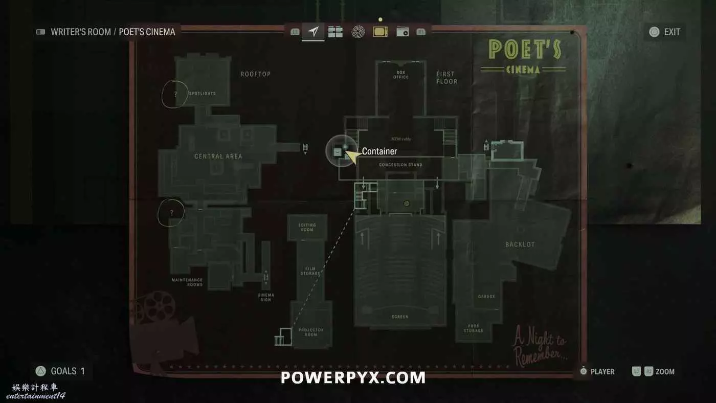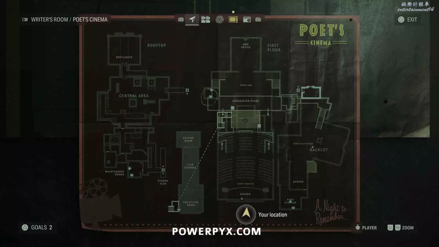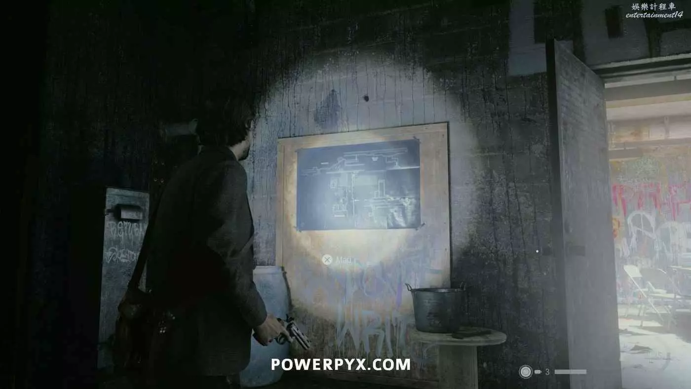 離開酒店後需要先穿過東南邊的洗車場才能到達詩人電影院,與售票處互動使用電影票開門,進入詩人電影院後,進入一層售貨亭後面一扇寫著【STAFF ONLY】的門,進入房間即可在牆上找到這張地圖。