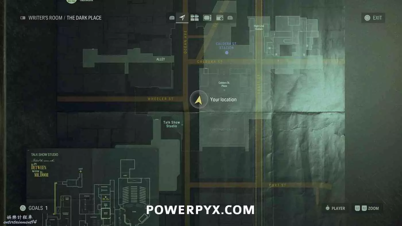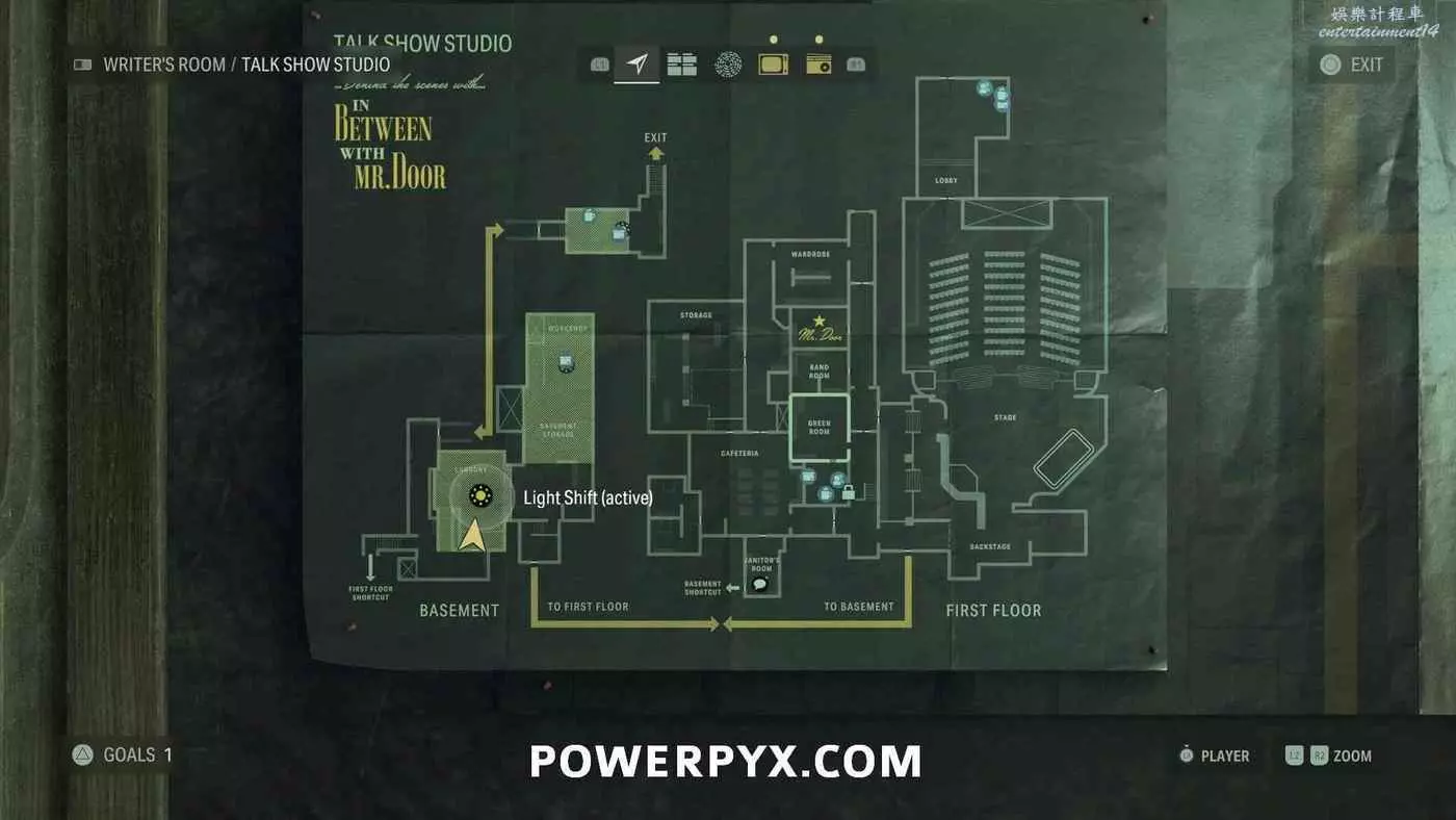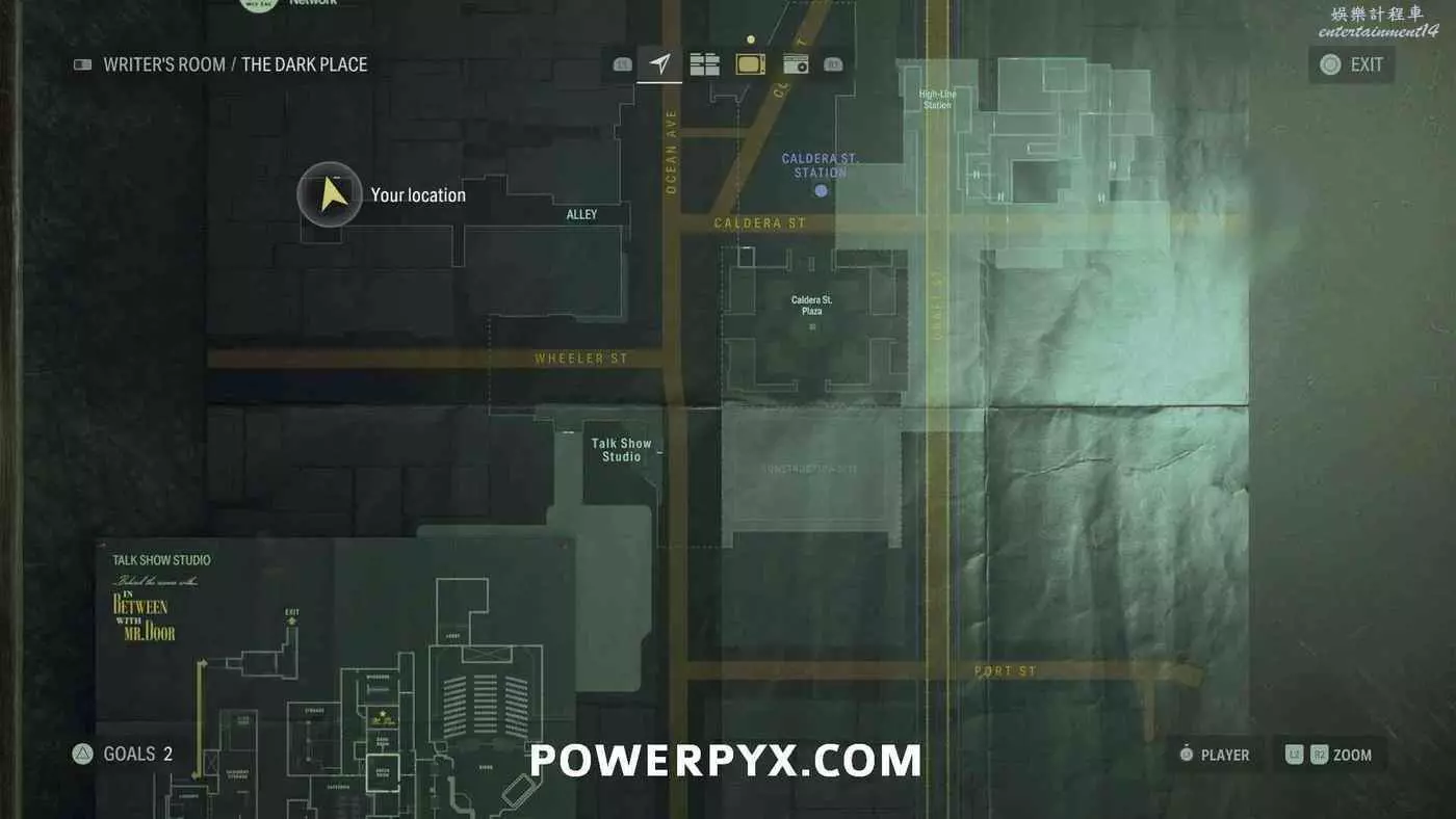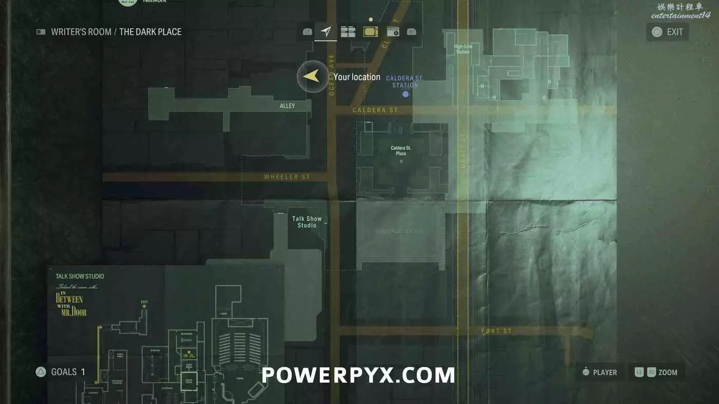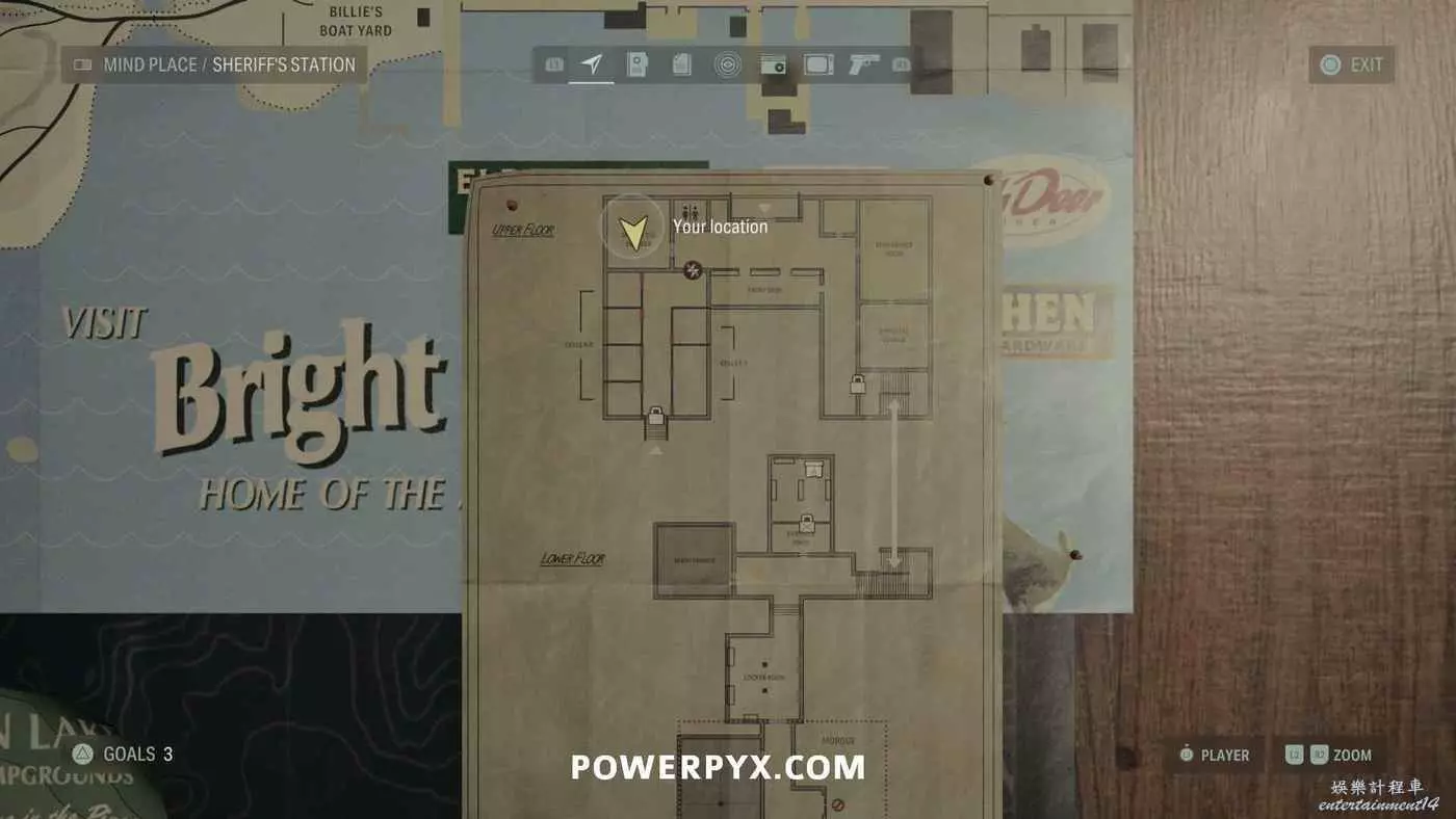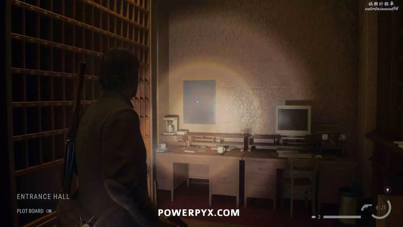 離開酒店後需要先穿過東南邊的洗車場才能到達詩人電影院,與售票處互動使用電影票開門,進入詩人電影院後,進入一層售貨亭後面一扇寫著【STAFF ONLY】的門,進入房間即可在牆上找到這張地圖。