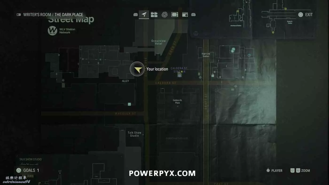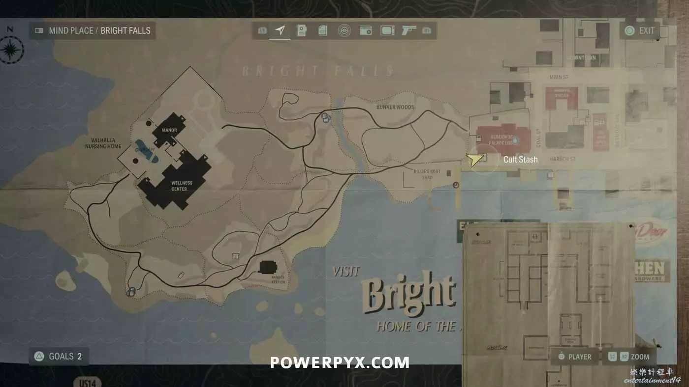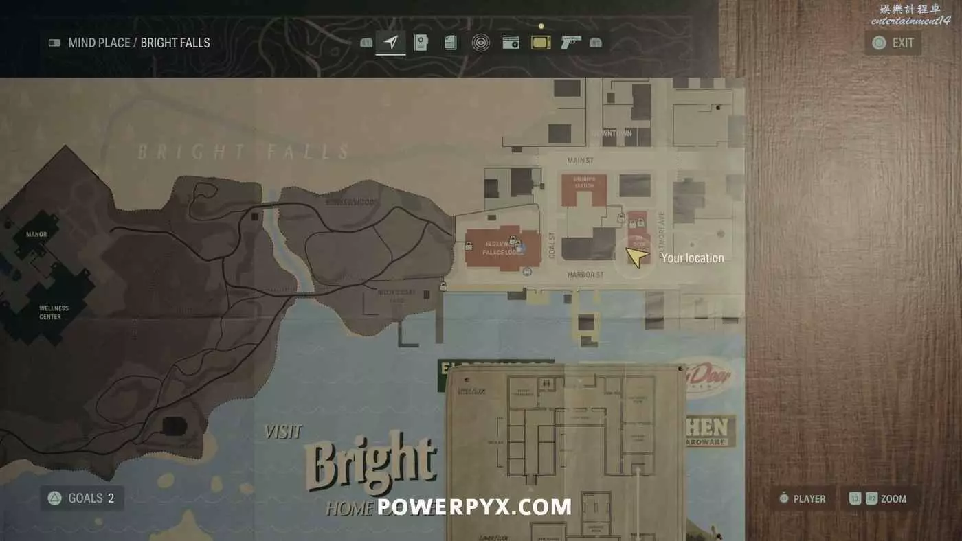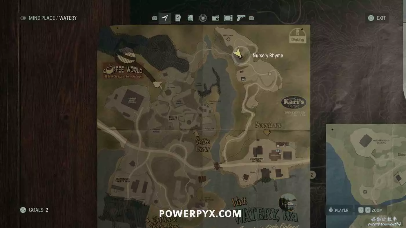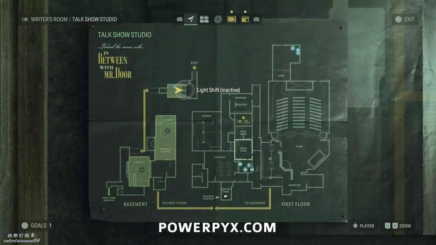 離開酒店後需要先穿過東南邊的洗車場才能到達詩人電影院,與售票處互動使用電影票開門,進入詩人電影院後,進入一層售貨亭後面一扇寫著【STAFF ONLY】的門,進入房間即可在牆上找到這張地圖。