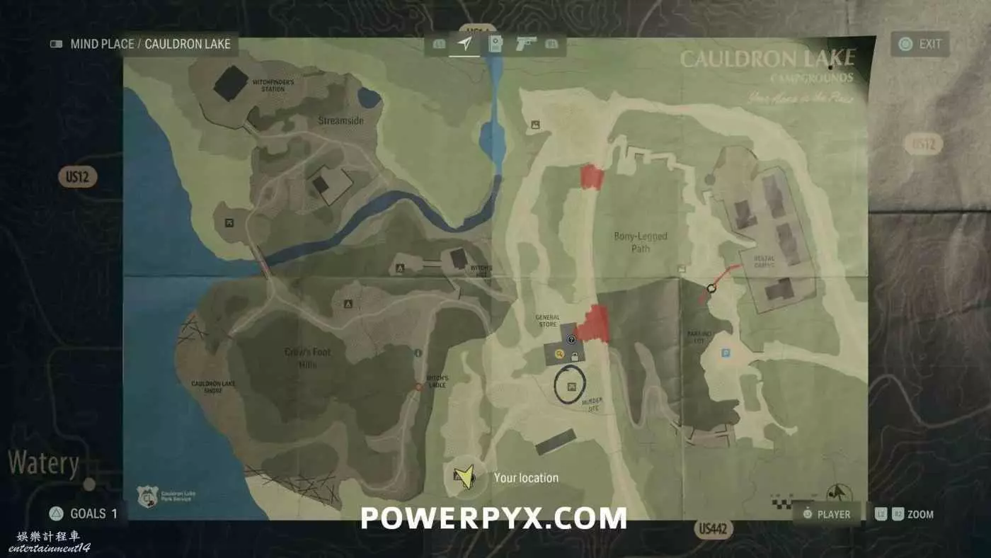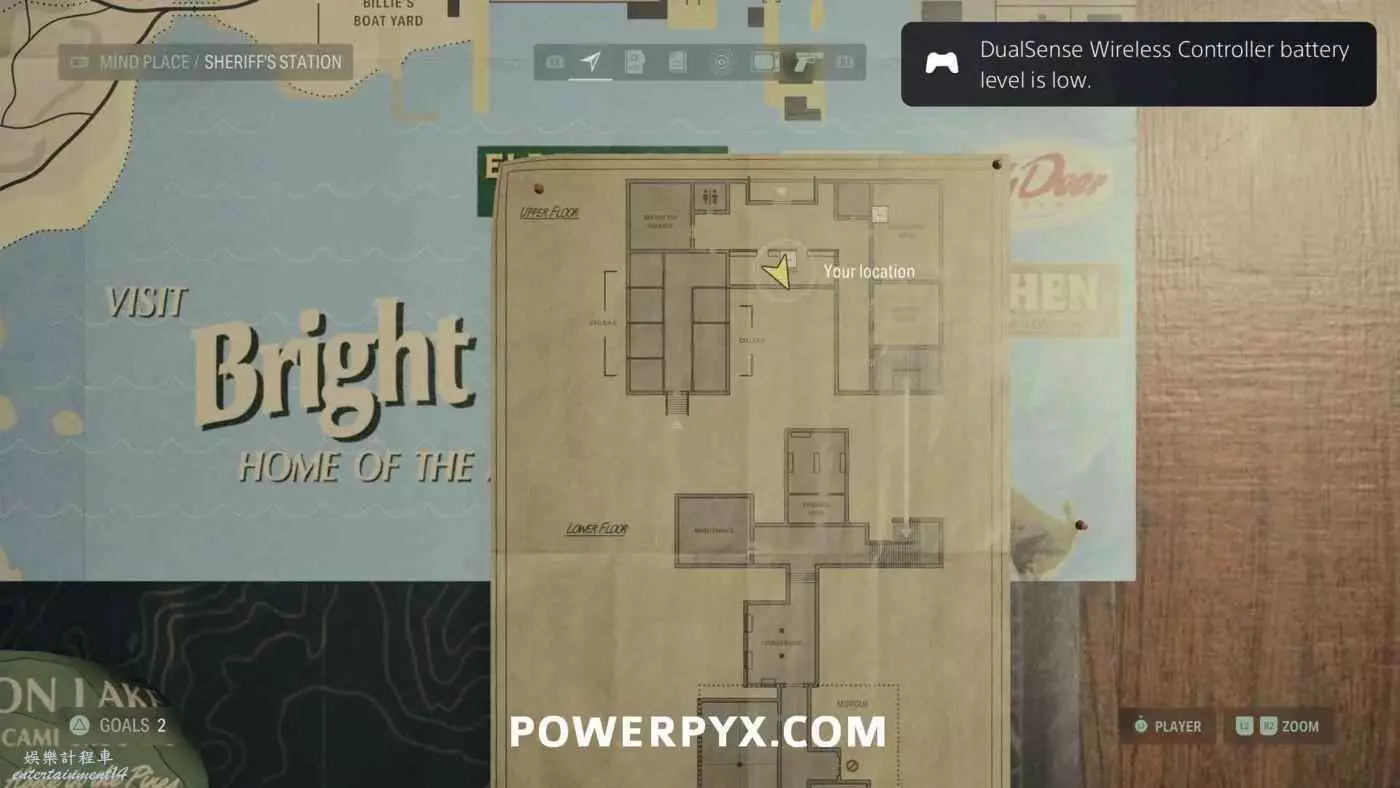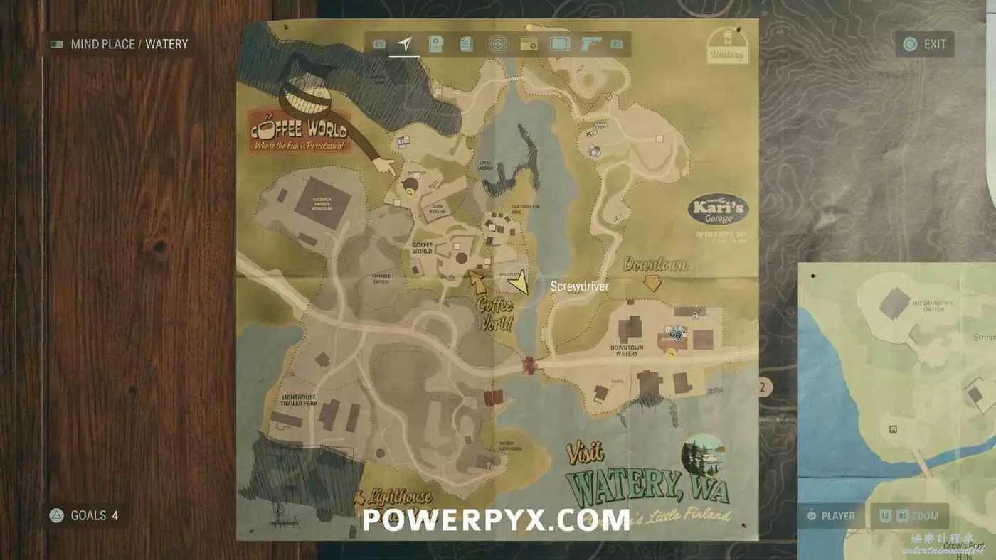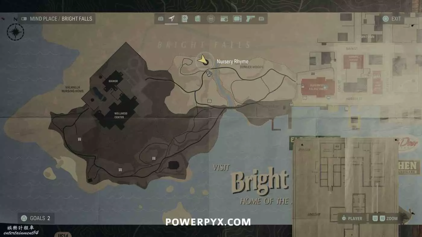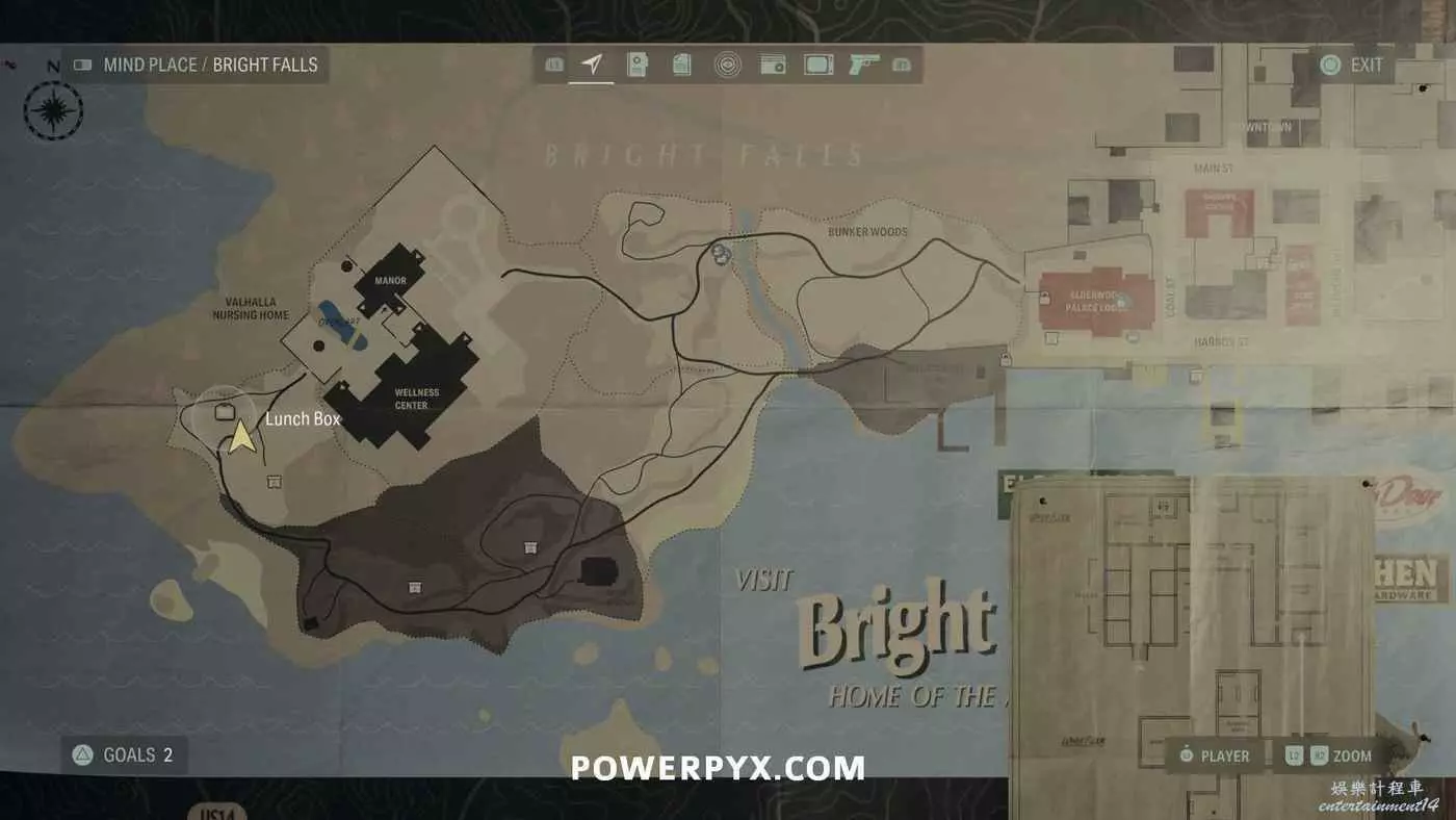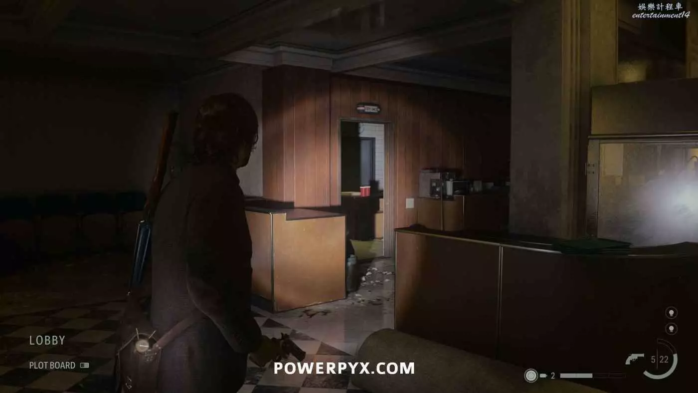 離開酒店後需要先穿過東南邊的洗車場才能到達詩人電影院,與售票處互動使用電影票開門,進入詩人電影院後,進入一層售貨亭後面一扇寫著【STAFF ONLY】的門,進入房間即可在牆上找到這張地圖。