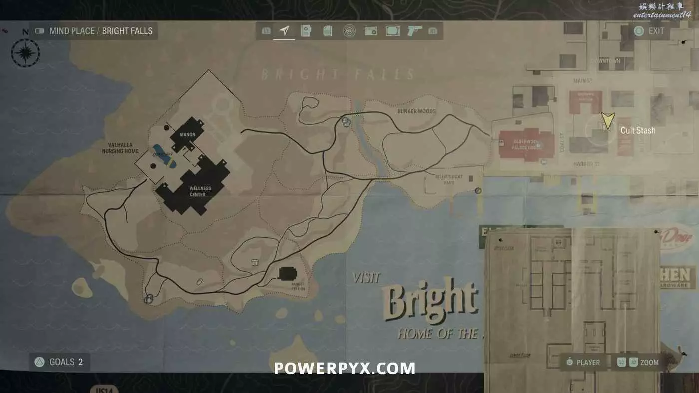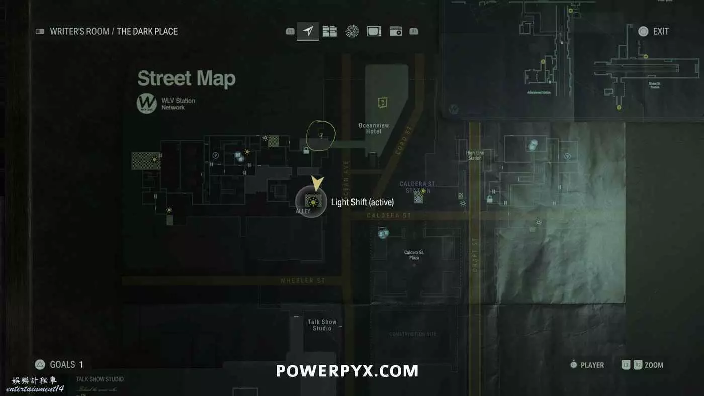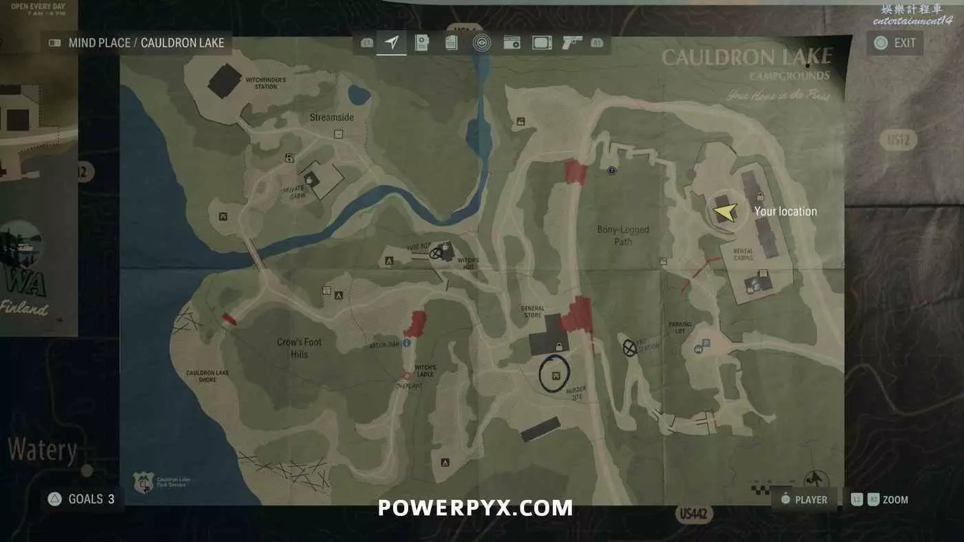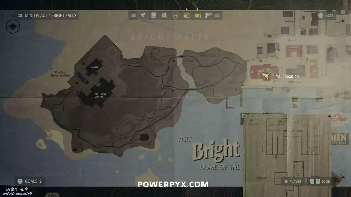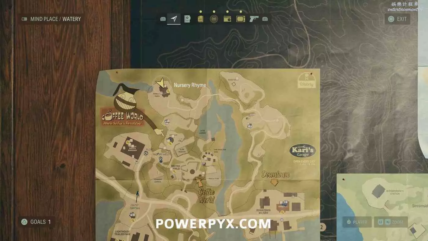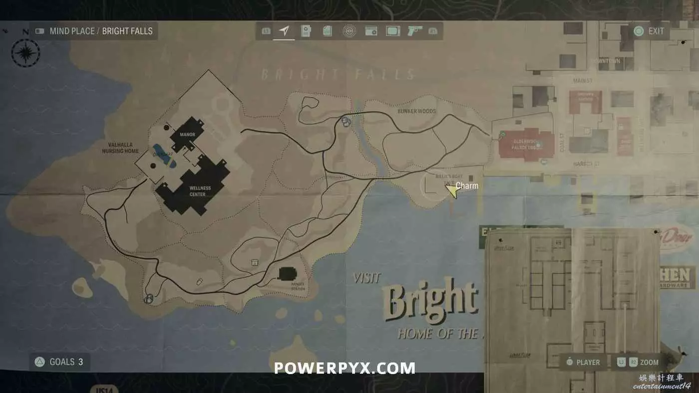 離開酒店後需要先穿過東南邊的洗車場才能到達詩人電影院,與售票處互動使用電影票開門,進入詩人電影院後,進入一層售貨亭後面一扇寫著【STAFF ONLY】的門,進入房間即可在牆上找到這張地圖。