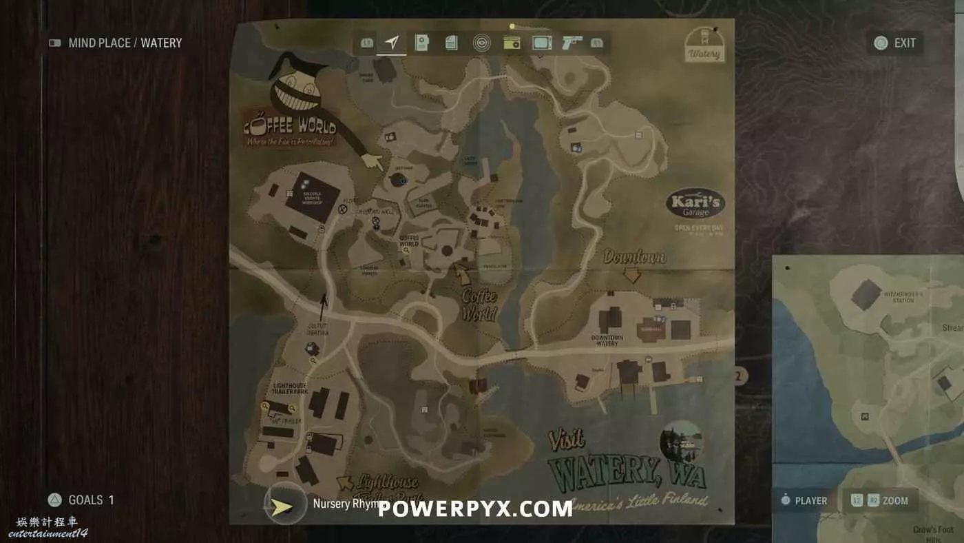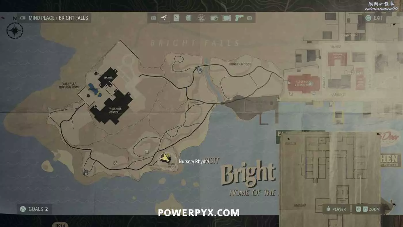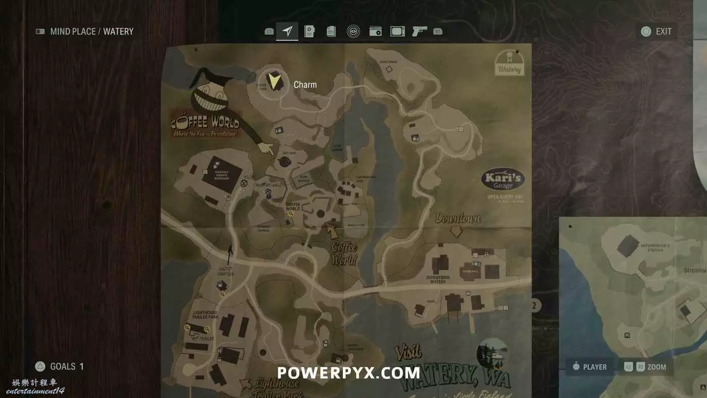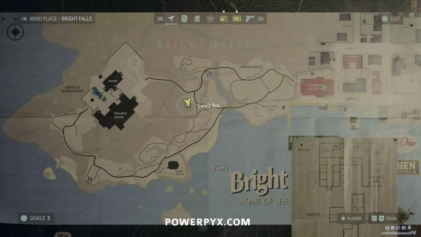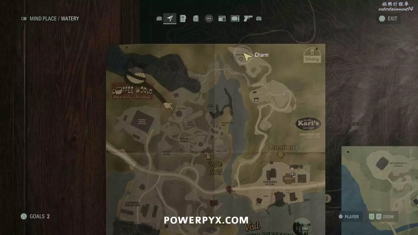 離開酒店後需要先穿過東南邊的洗車場才能到達詩人電影院,與售票處互動使用電影票開門,進入詩人電影院後,進入一層售貨亭後面一扇寫著【STAFF ONLY】的門,進入房間即可在牆上找到這張地圖。