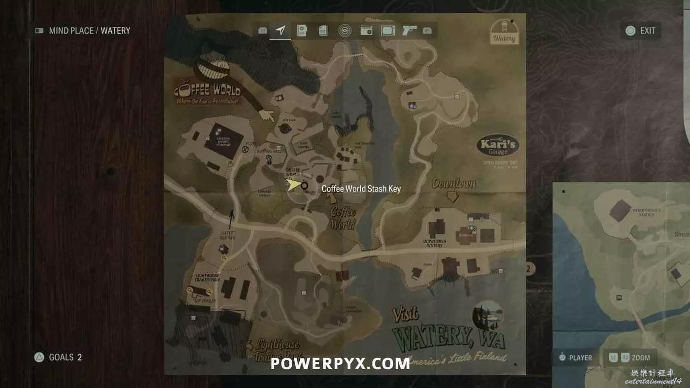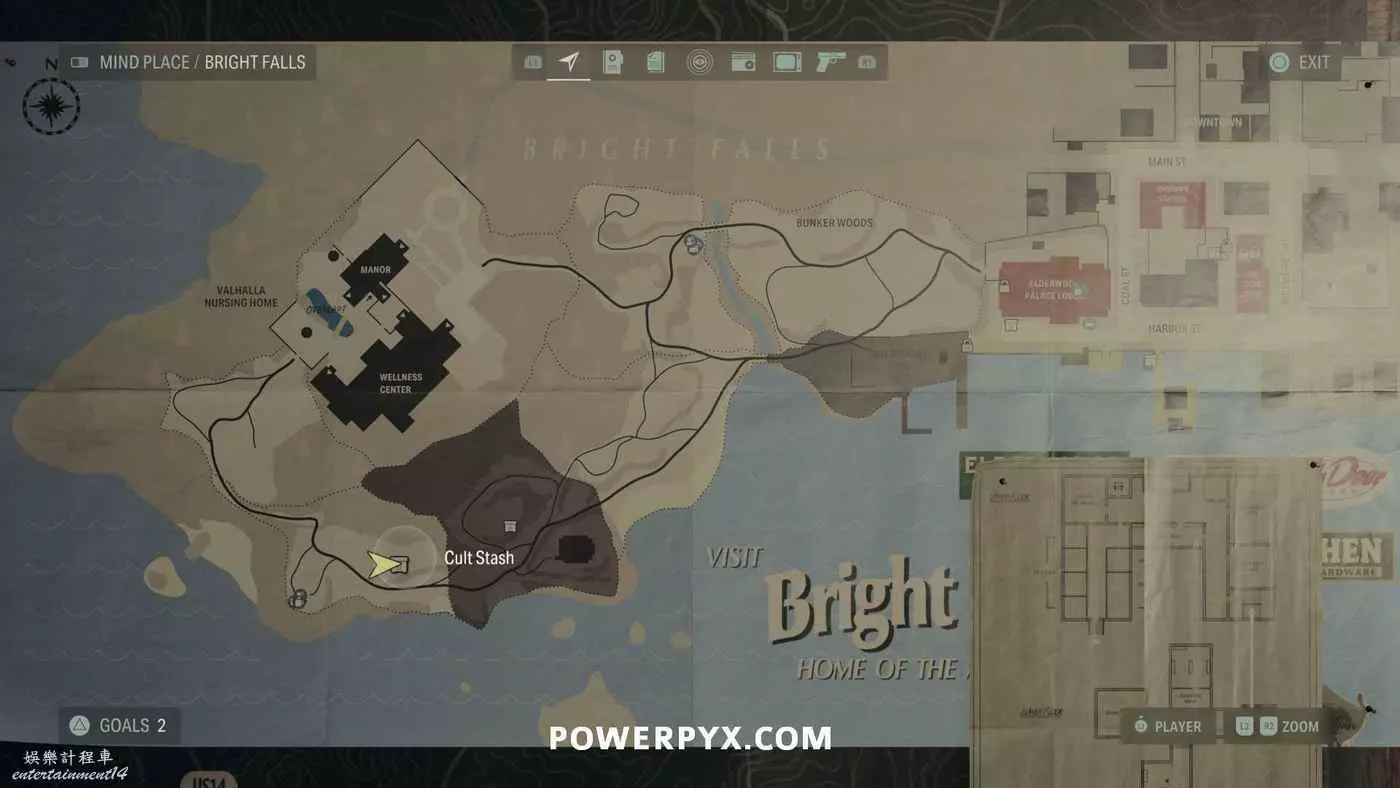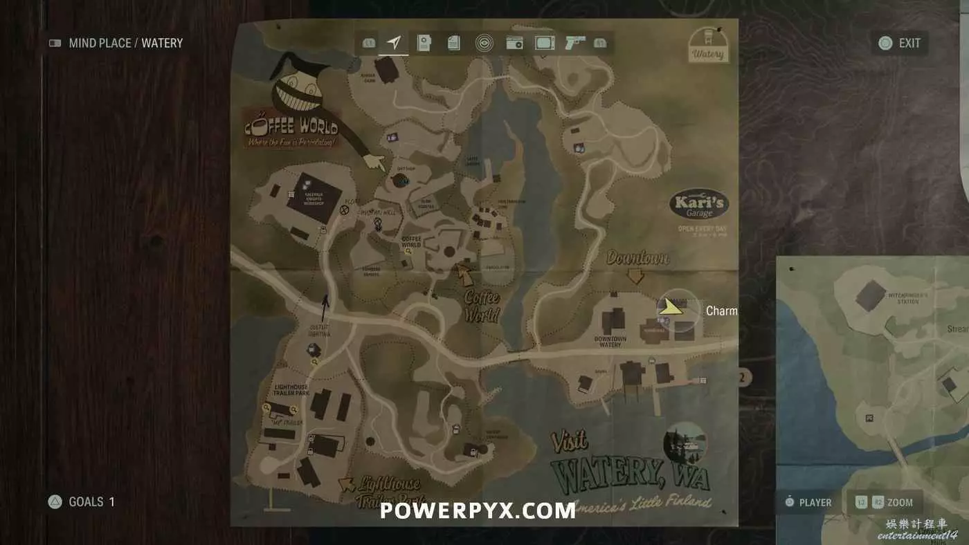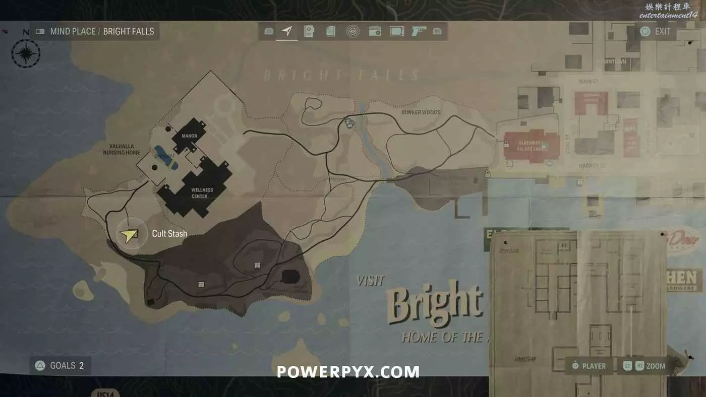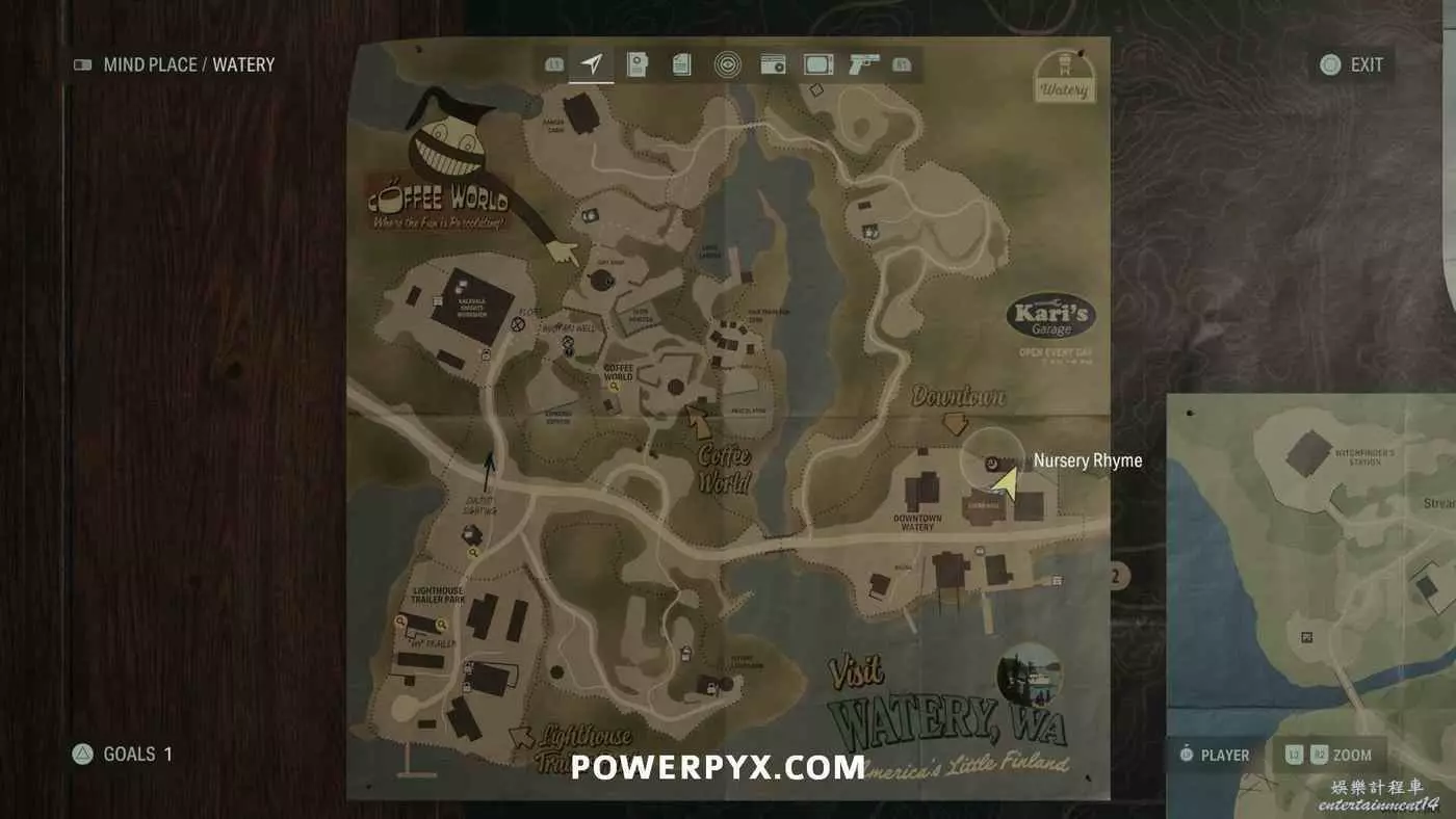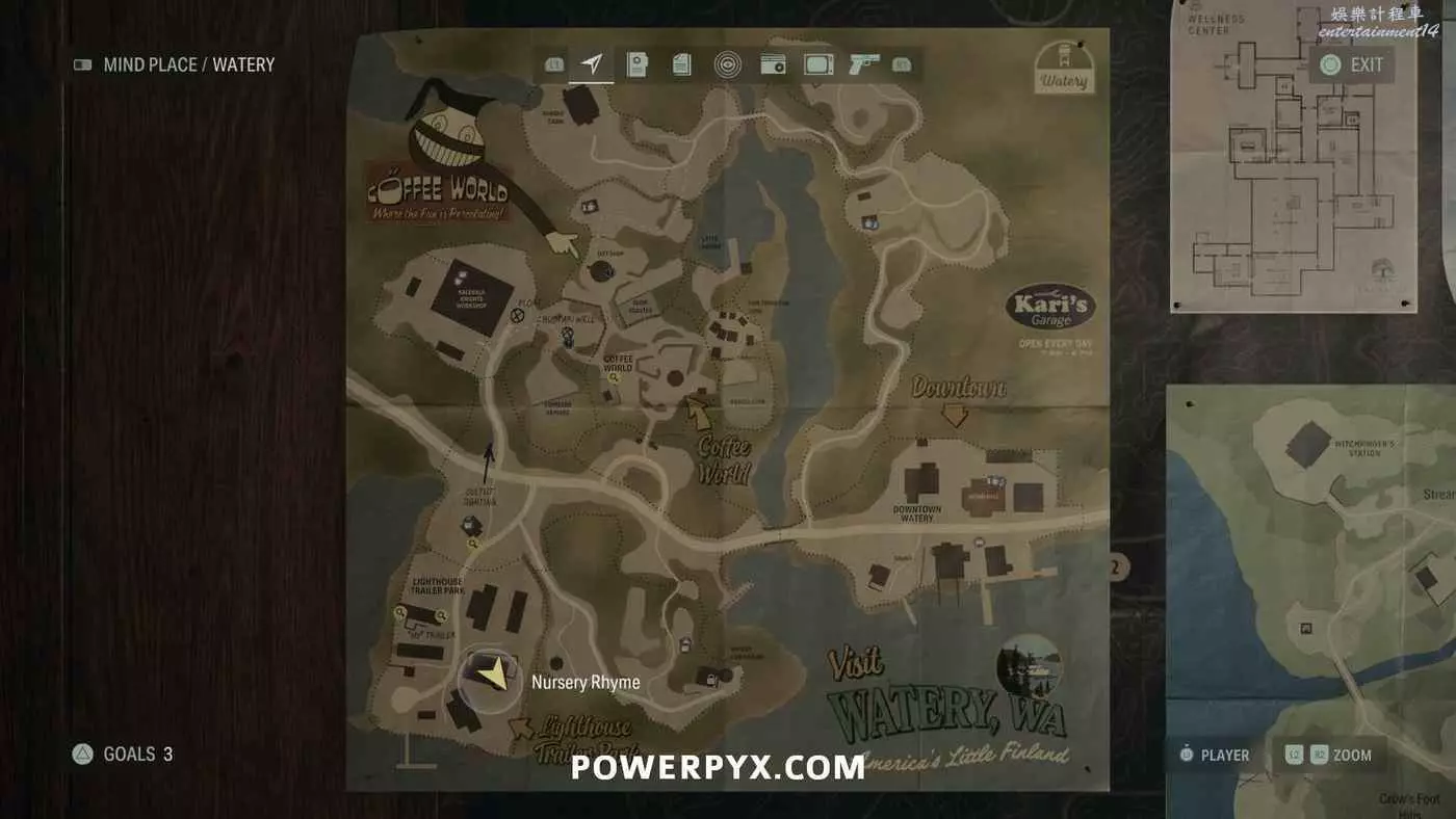 離開酒店後需要先穿過東南邊的洗車場才能到達詩人電影院,與售票處互動使用電影票開門,進入詩人電影院後,進入一層售貨亭後面一扇寫著【STAFF ONLY】的門,進入房間即可在牆上找到這張地圖。