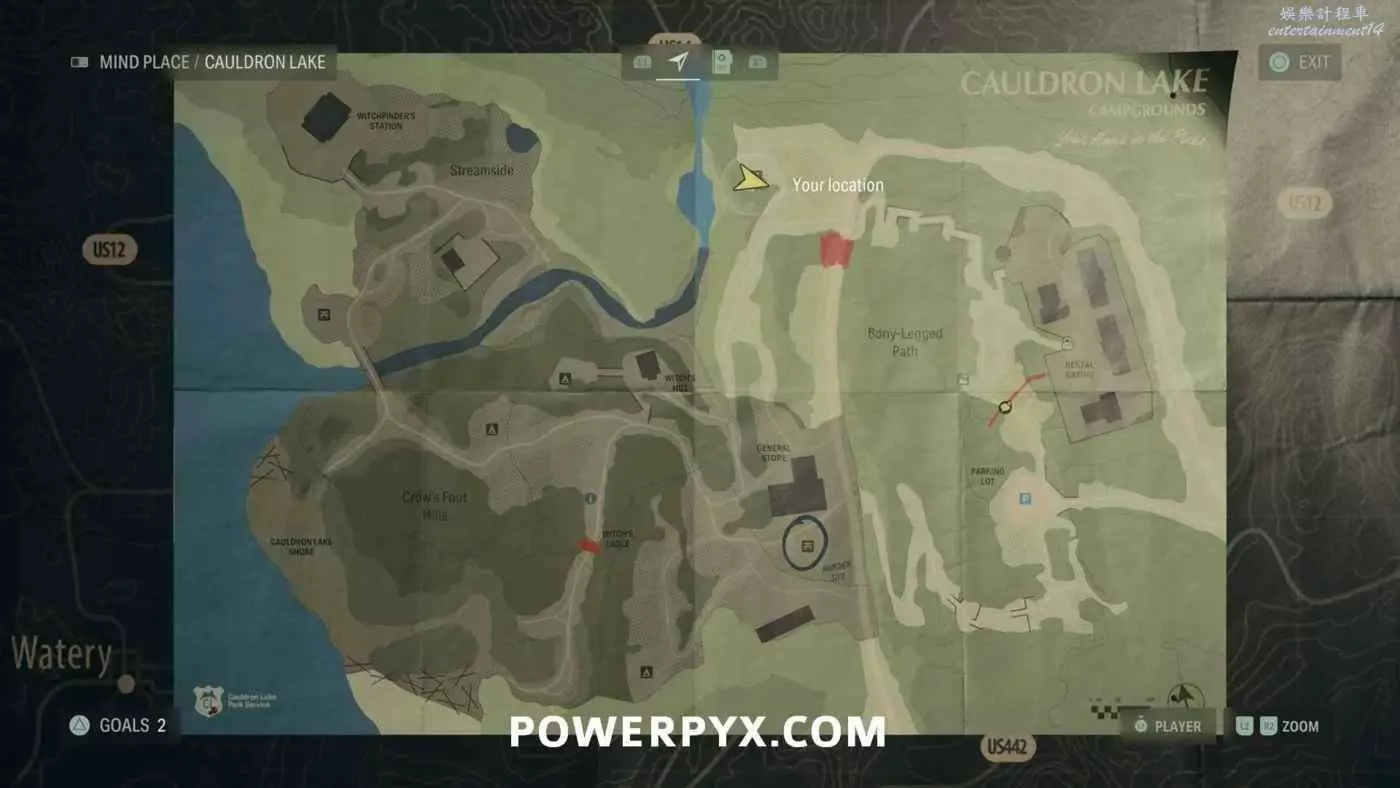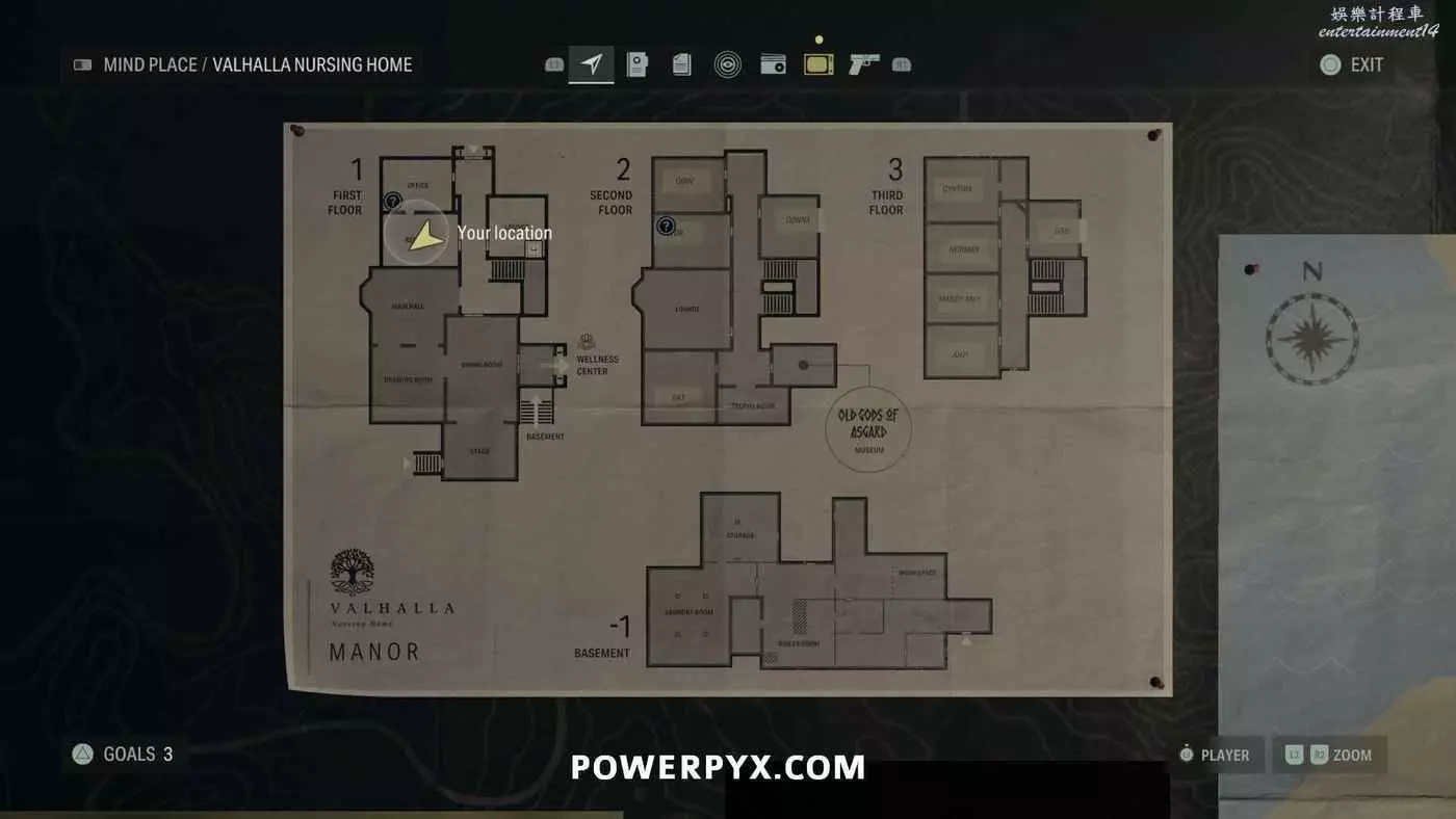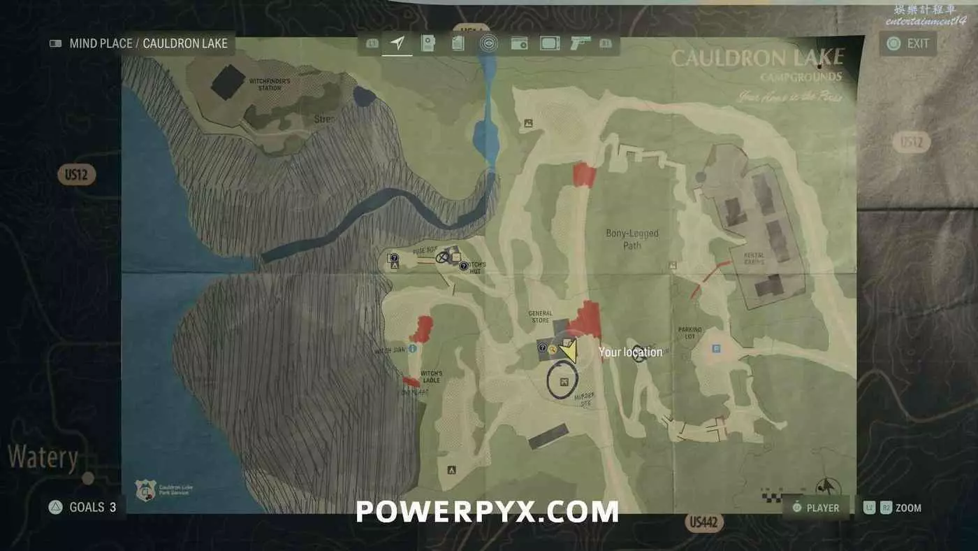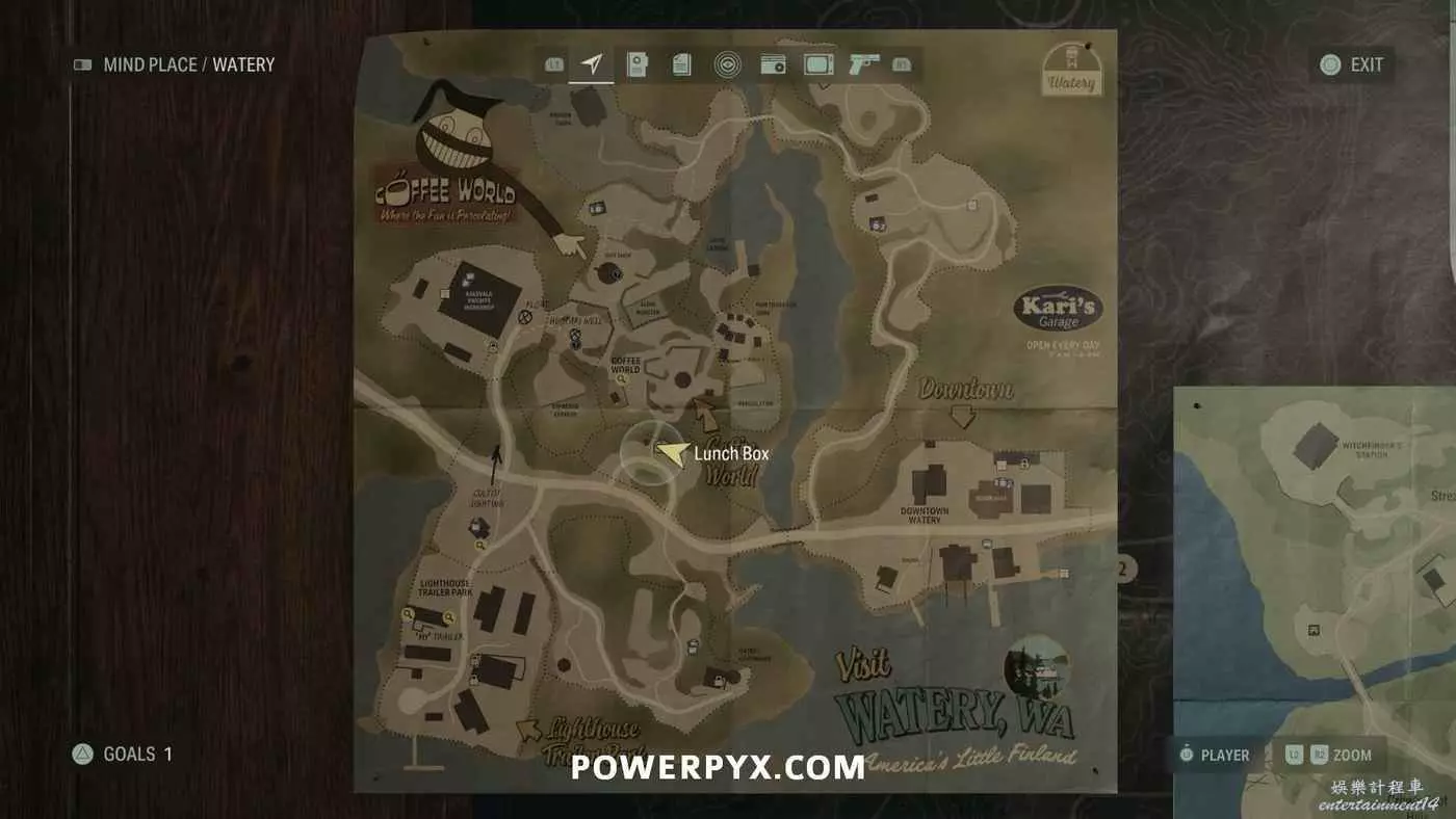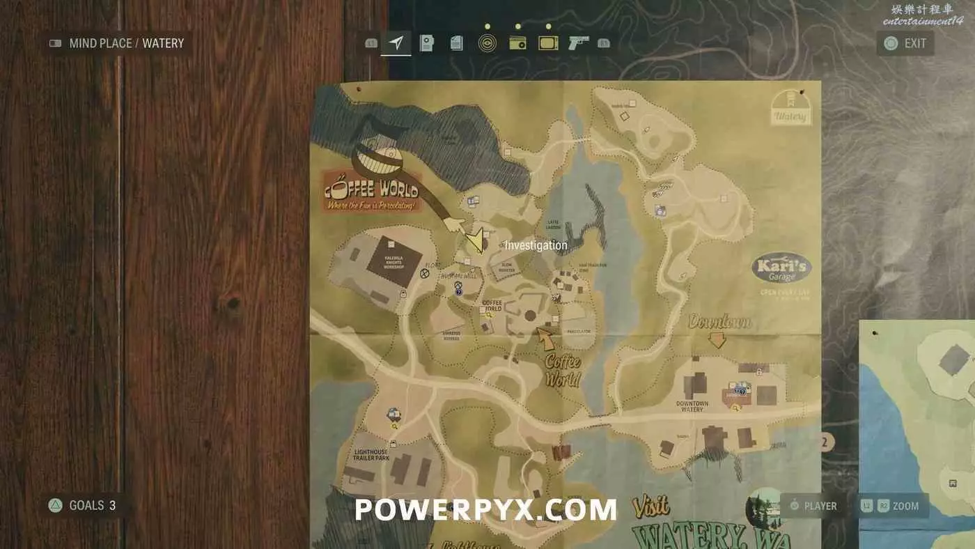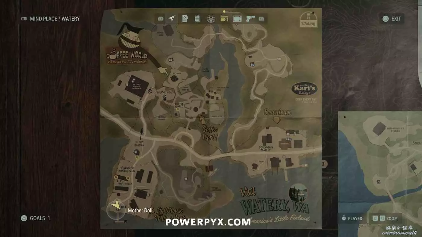 離開酒店後需要先穿過東南邊的洗車場才能到達詩人電影院,與售票處互動使用電影票開門,進入詩人電影院後,進入一層售貨亭後面一扇寫著【STAFF ONLY】的門,進入房間即可在牆上找到這張地圖。
