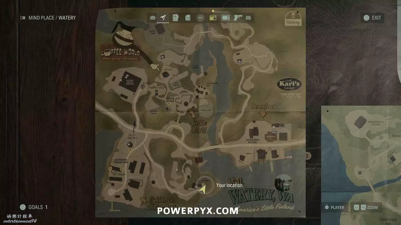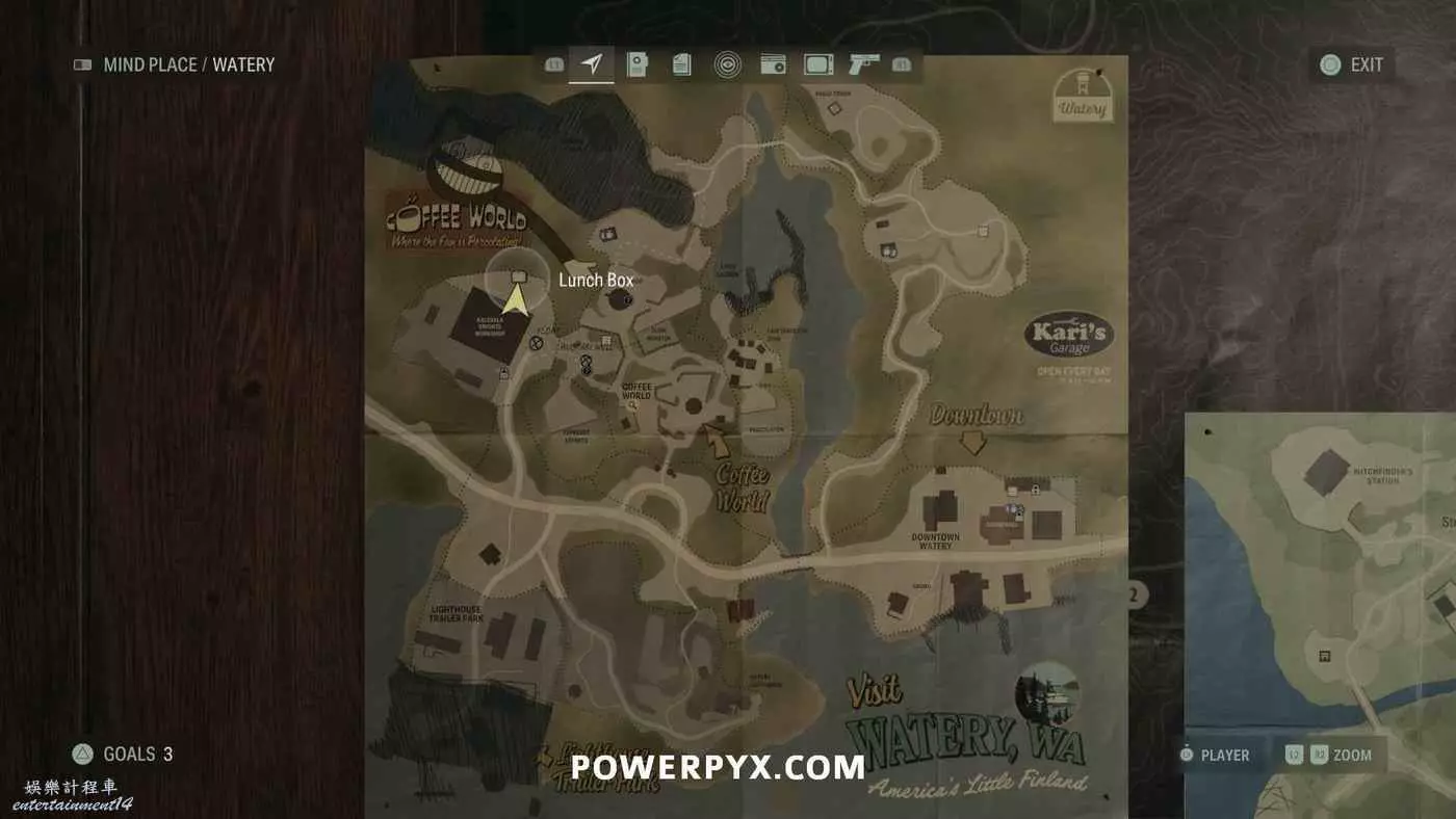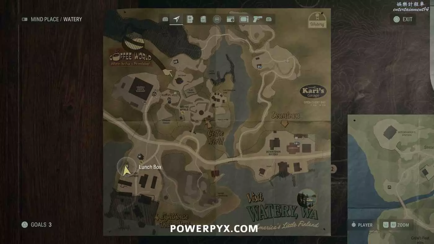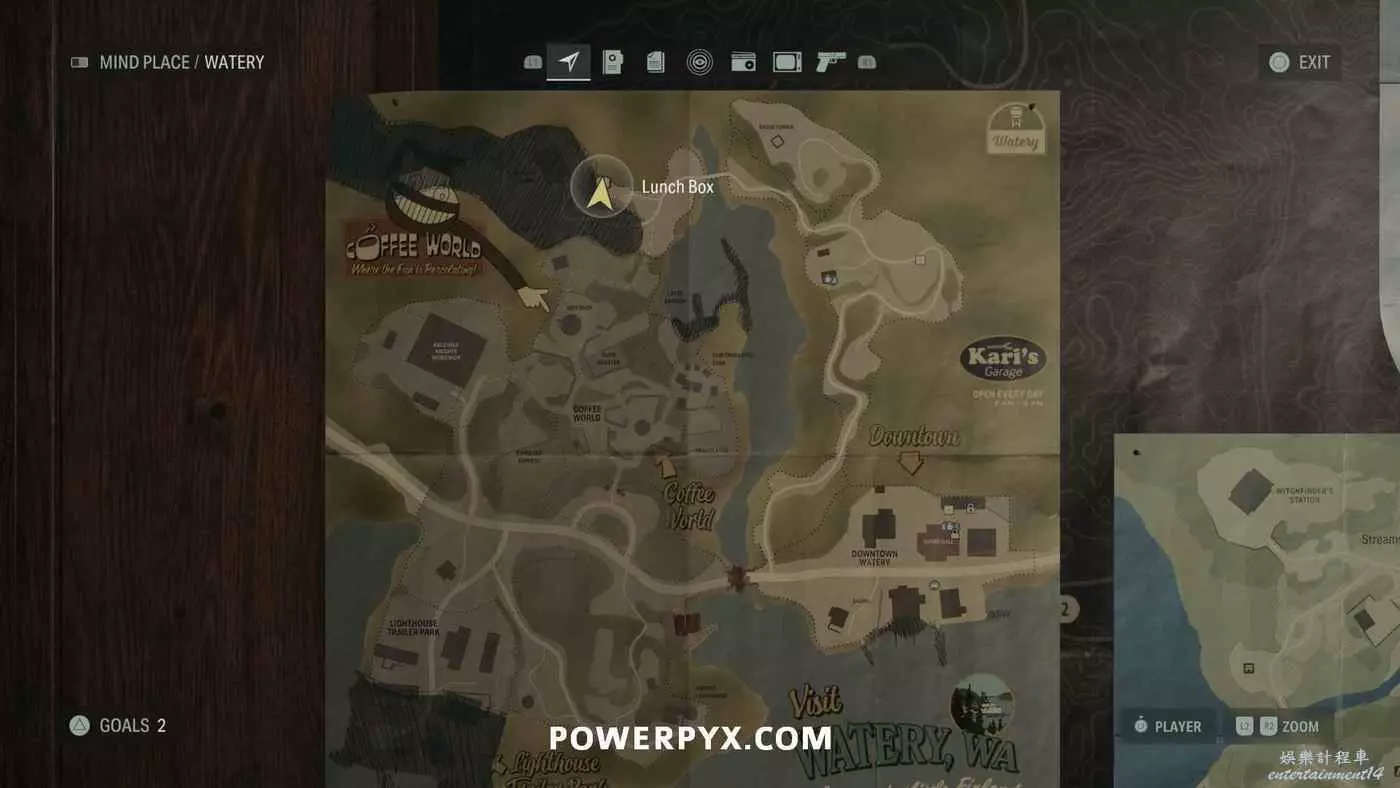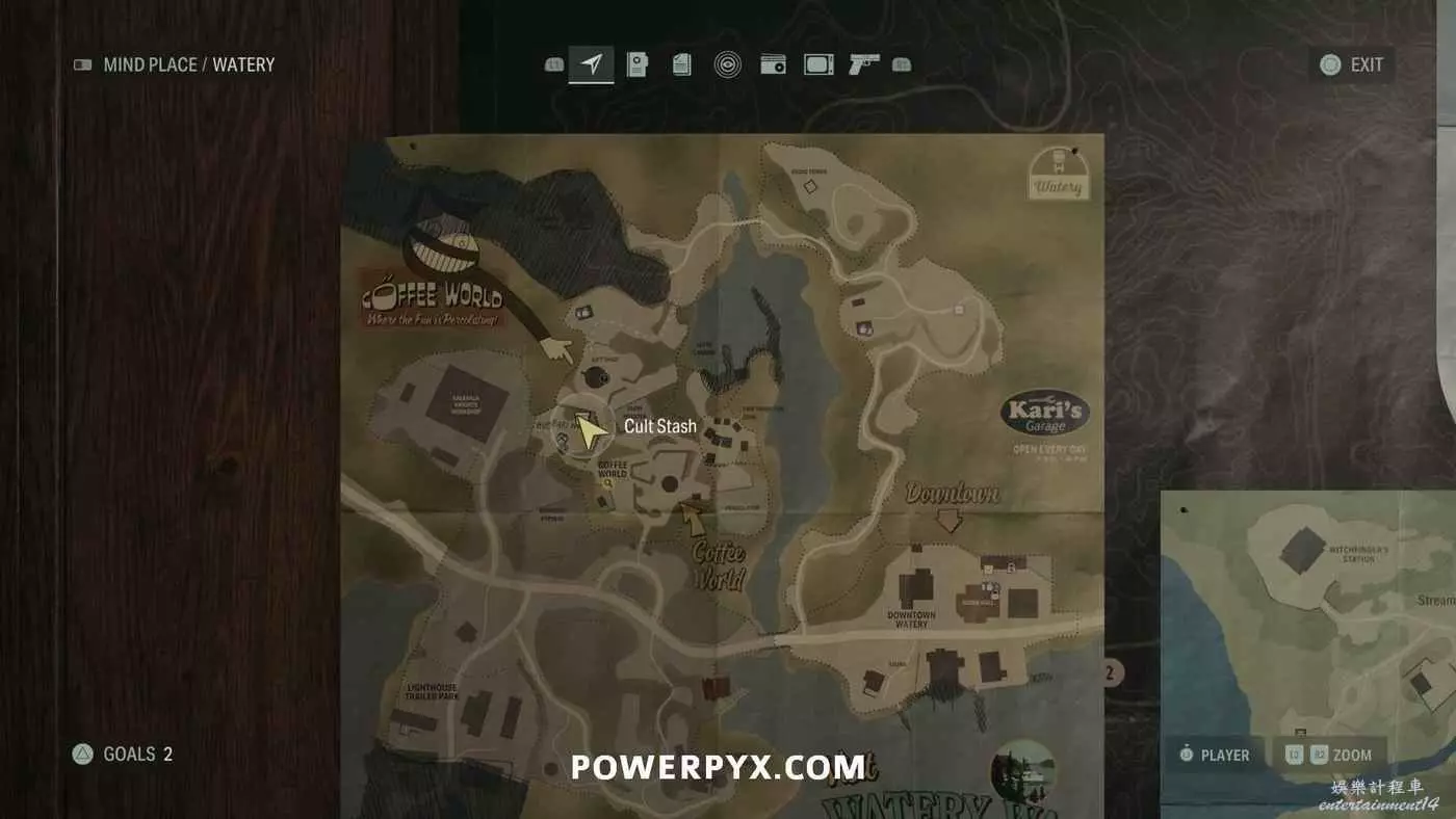 離開酒店後需要先穿過東南邊的洗車場才能到達詩人電影院,與售票處互動使用電影票開門,進入詩人電影院後,進入一層售貨亭後面一扇寫著【STAFF ONLY】的門,進入房間即可在牆上找到這張地圖。