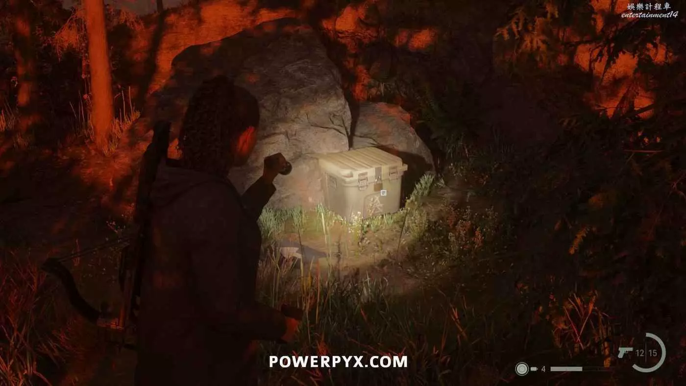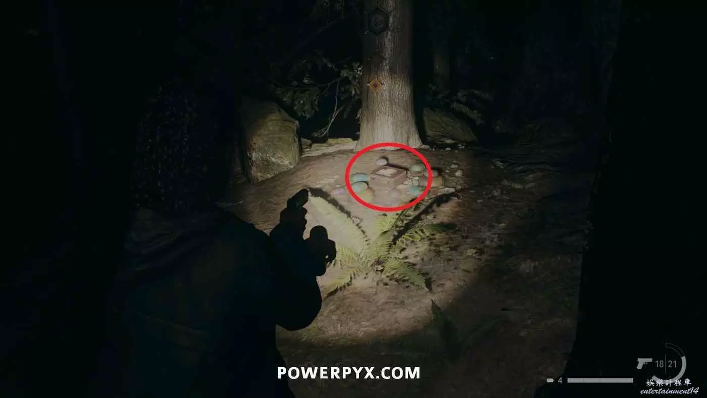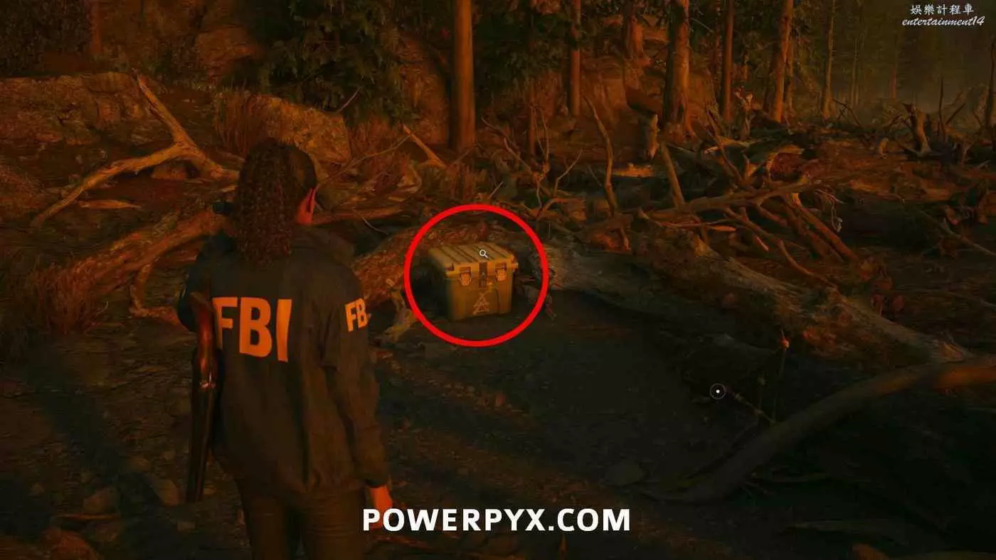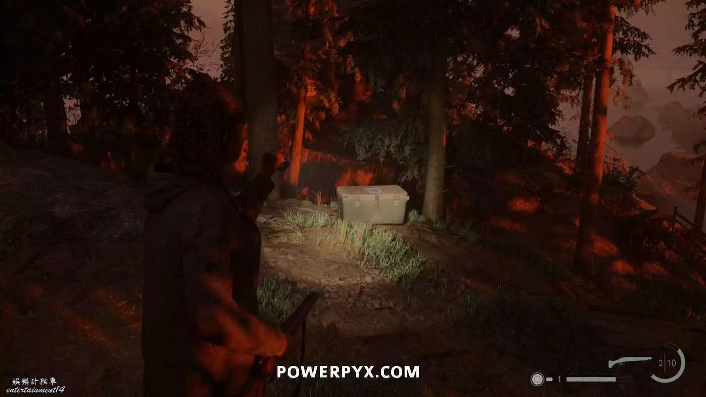 前往護林員站外面的煙囪,旁邊的地上可以找到鑰匙,拿到鑰匙後前往護林員站西邊山上即可打開藏匿物。