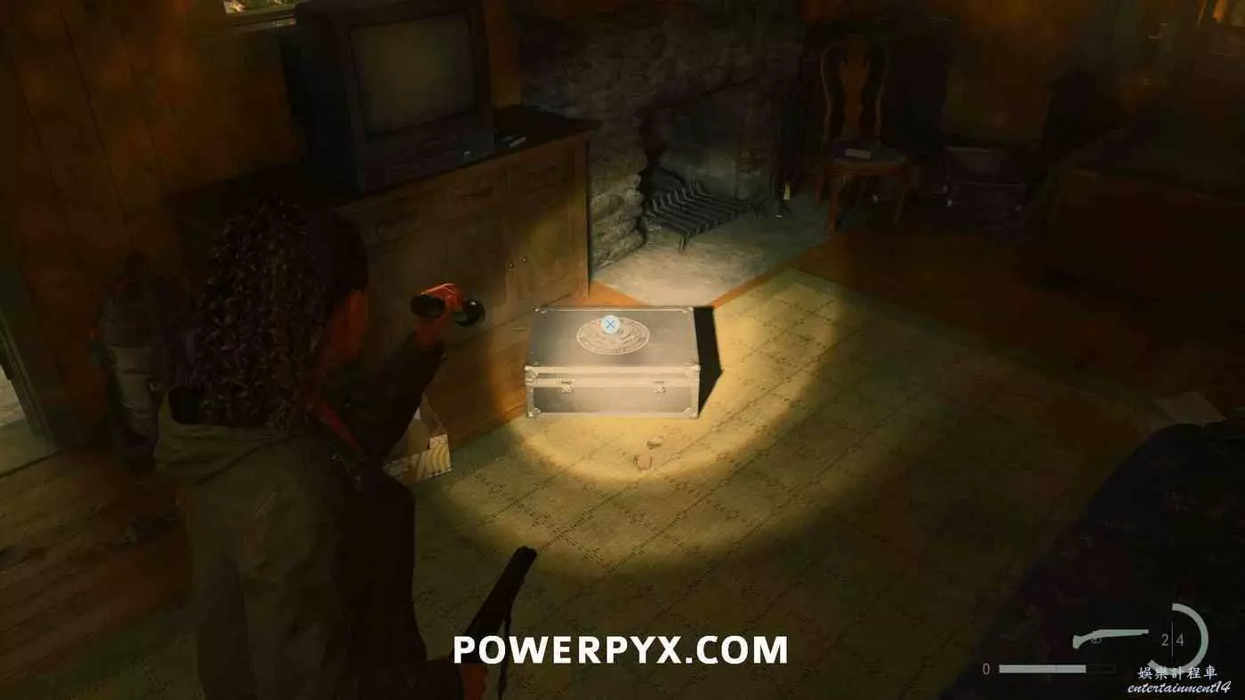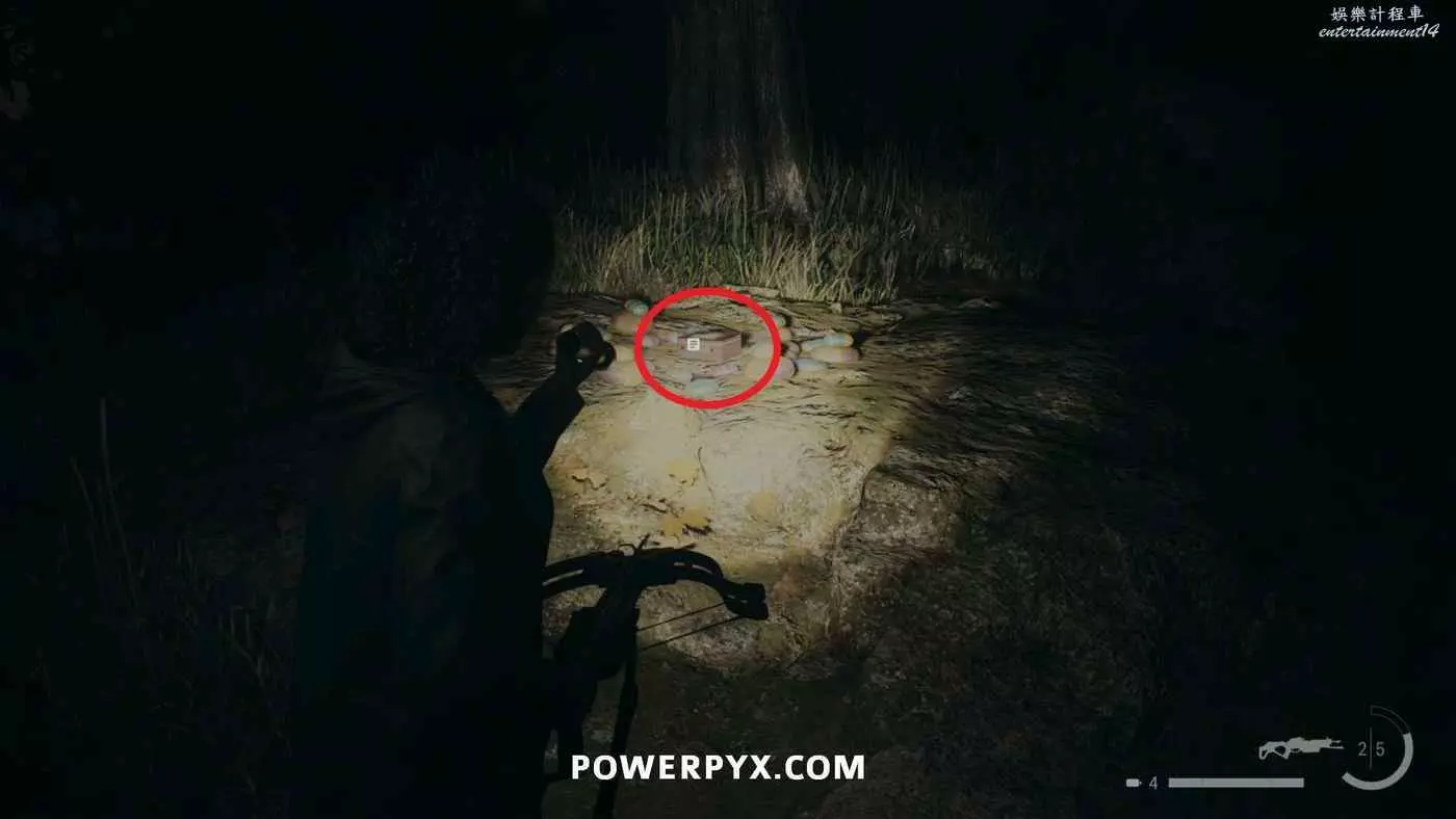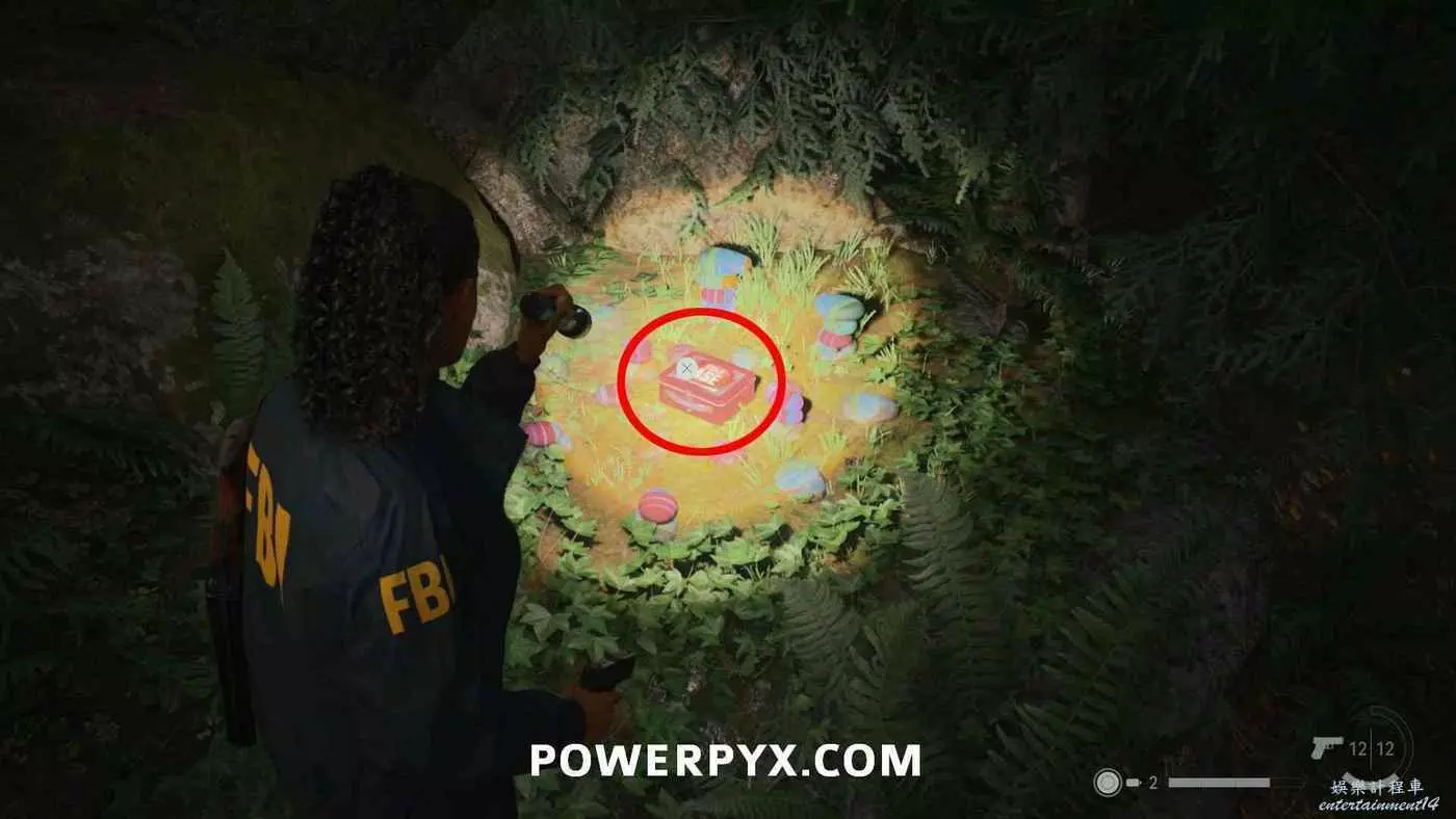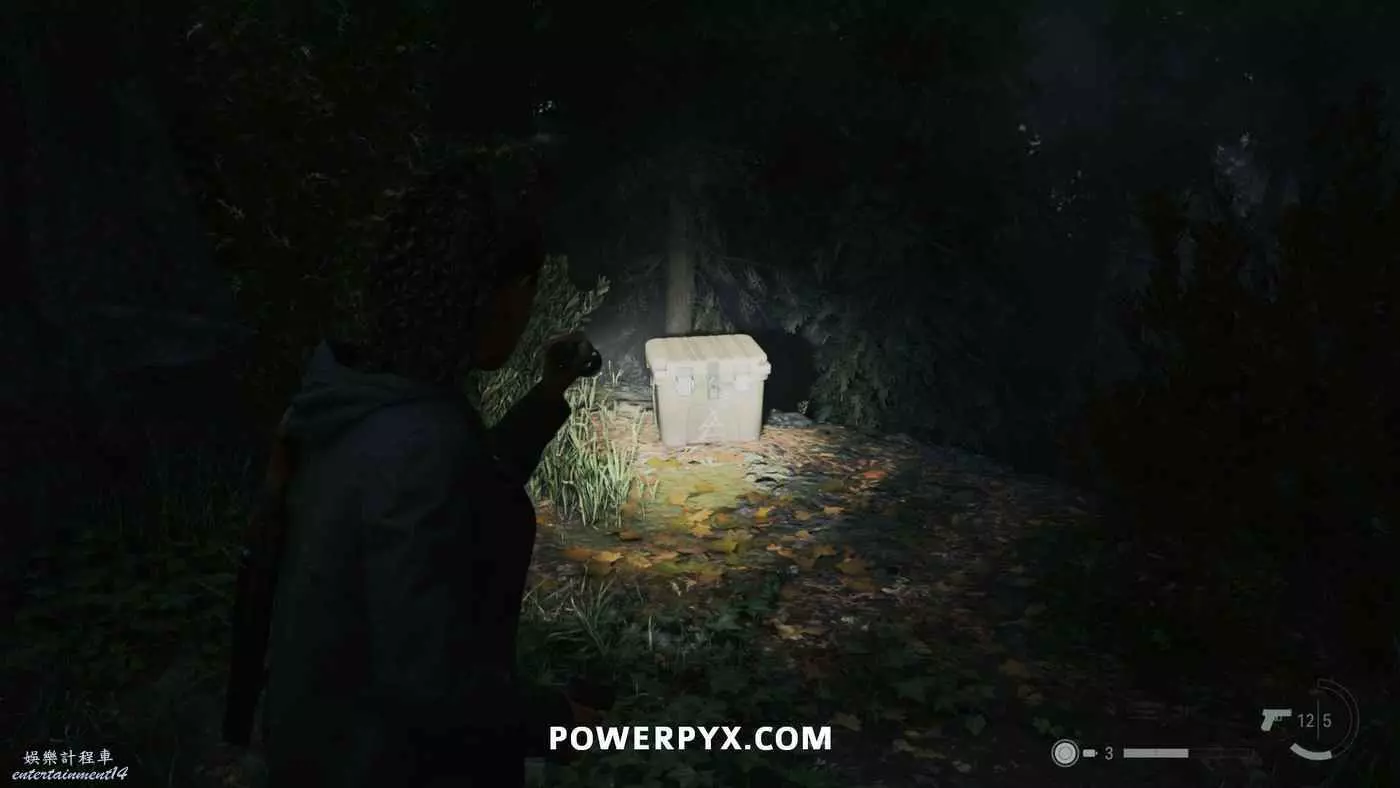 前往護林員站外面的煙囪,旁邊的地上可以找到鑰匙,拿到鑰匙後前往護林員站西邊山上即可打開藏匿物。