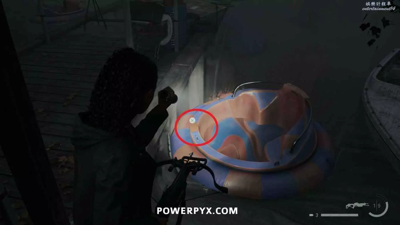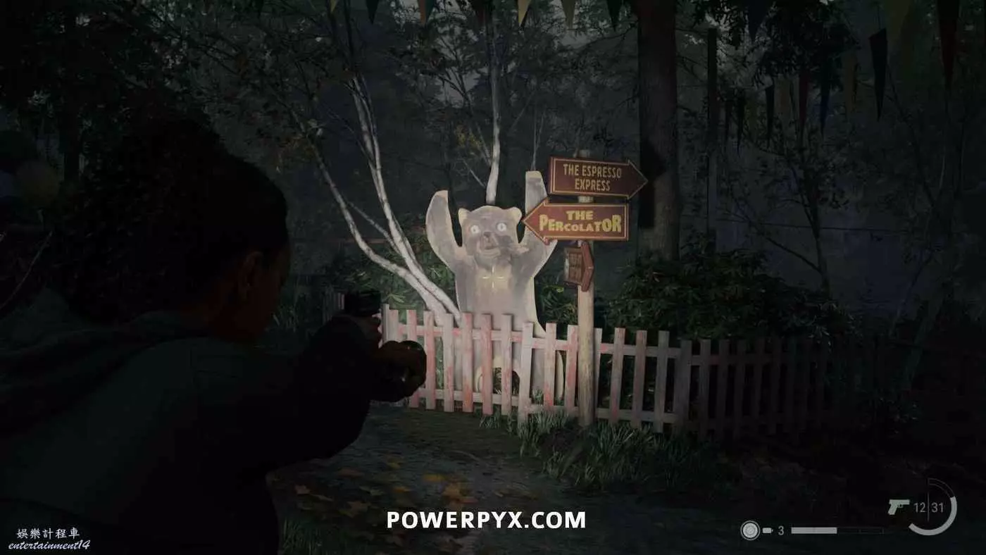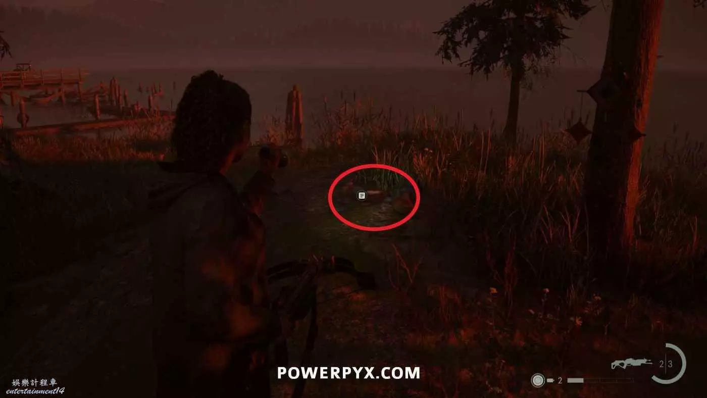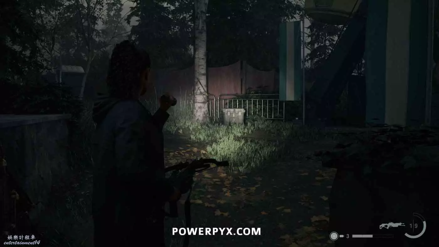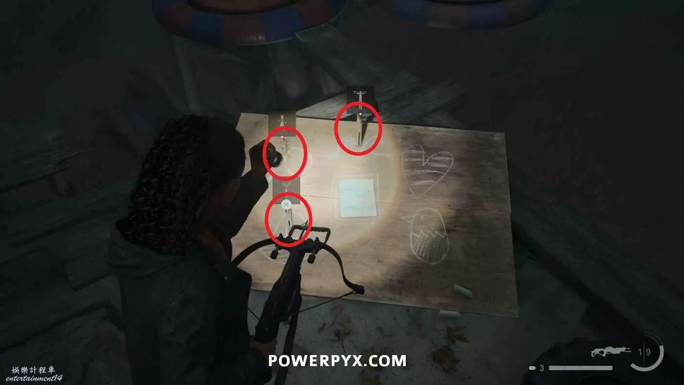 向前推進劇情直到到達屋頂酒吧,使用天使檯燈進入酒吧,再用一次天使檯燈即可拾取霰彈槍。在此前如果已經找到了所有武器,即可解鎖【武器收藏家(找到兩名角色的所有武器)】獎盃。