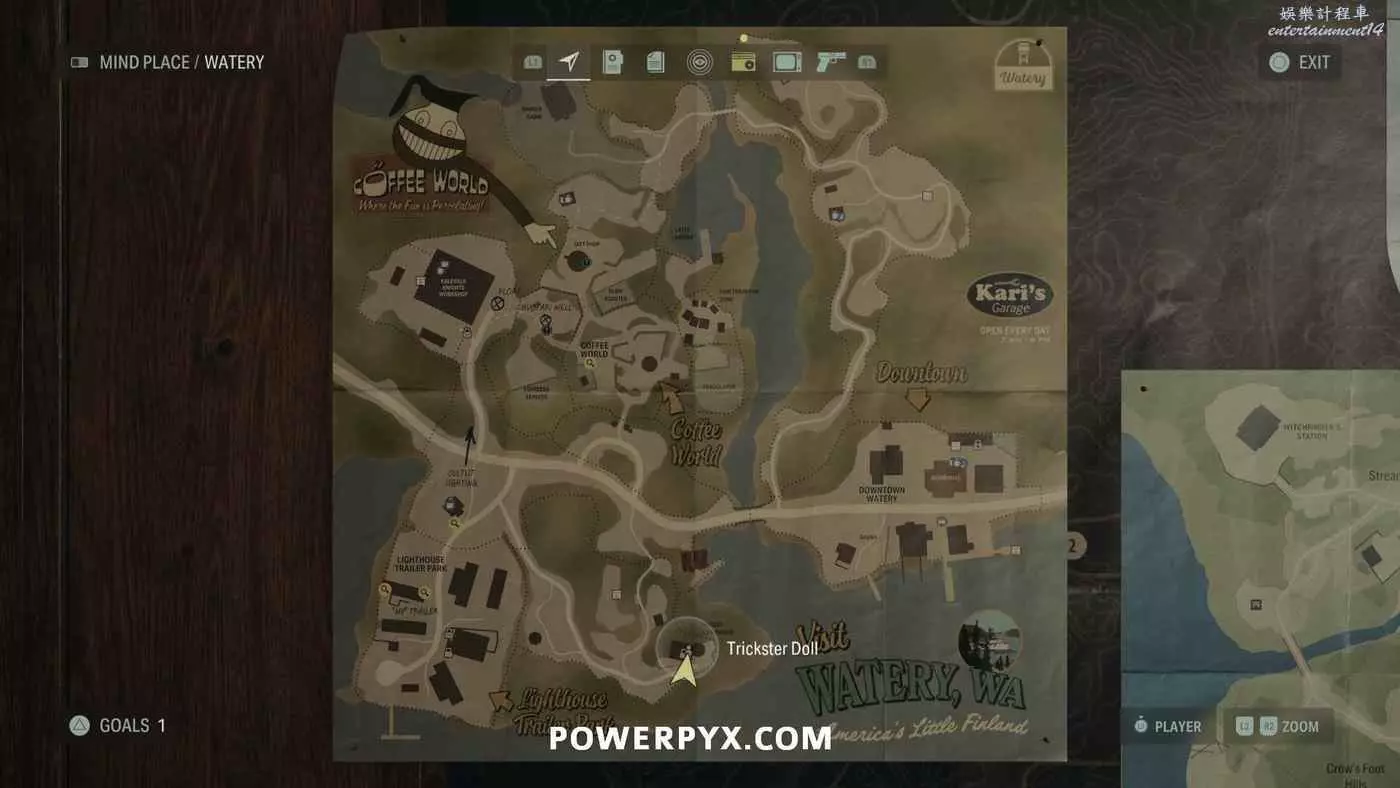 消除洪水後,穿過鴉爪嶺,過橋往北走可以在左側看到一個營地,玩偶就在面對湖泊時左手邊的野餐桌上,旁邊的桌子上還有個漢堡(地圖上會顯示營地圖示,私人小屋西邊)。