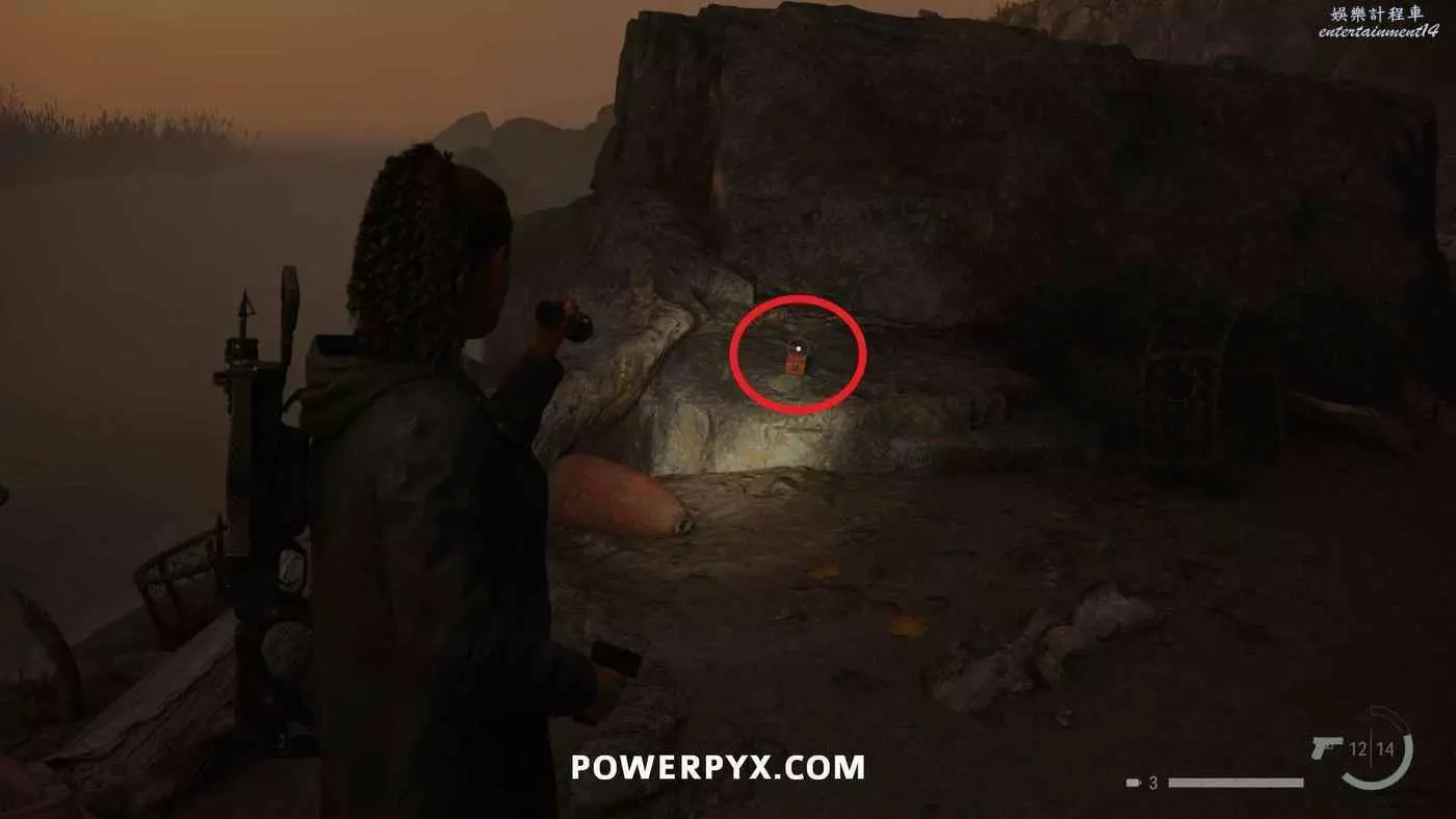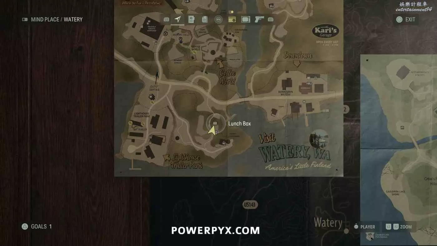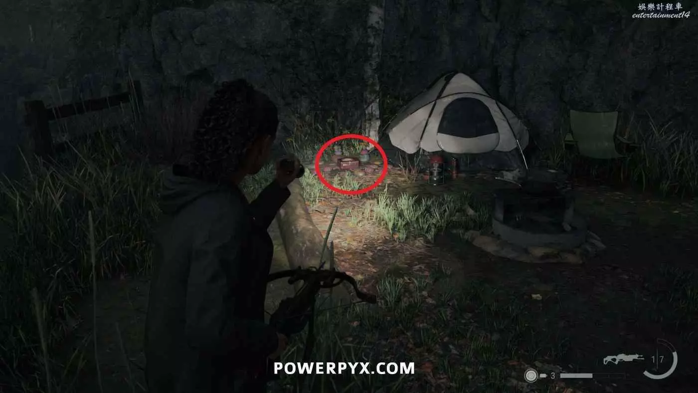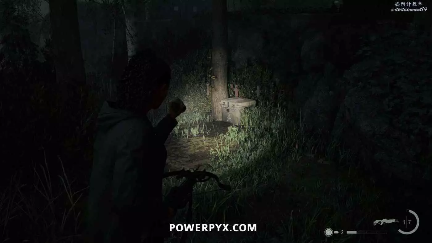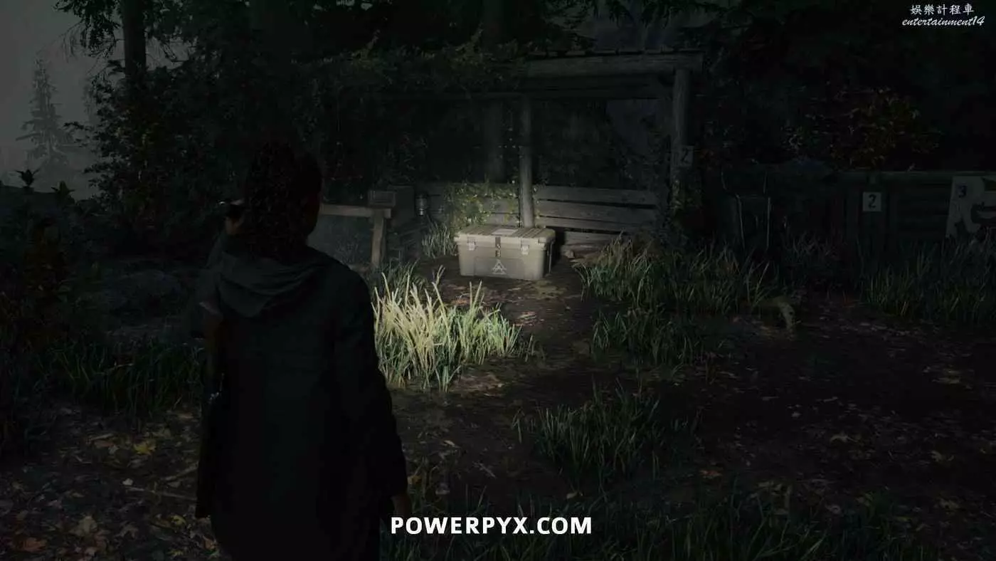 推進劇情到從副警長那裡獲得捷徑鑰匙後,需要跟著凱西上山返回本章開頭的汽車所在位置,在捷徑途中有一棟小房子,爬上小房子後面的高台即可找到這個午餐盒。