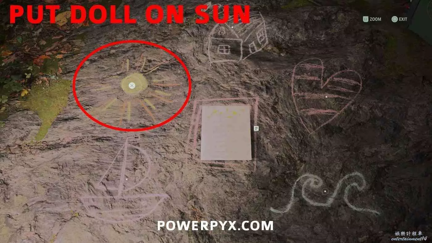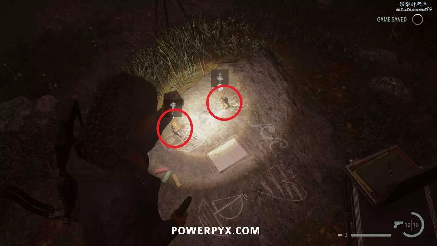 消除洪水後,穿過鴉爪嶺,過橋往北走左側可以看到一個營地。查看地上的童謠,周圍有粉筆畫的各種圖案。需要將烏鴉玩偶放在太陽圖案上即可解開謎題。解開謎題後記得把烏鴉玩偶拿走。解開謎題後可以在野餐桌上拿到這個護身符。