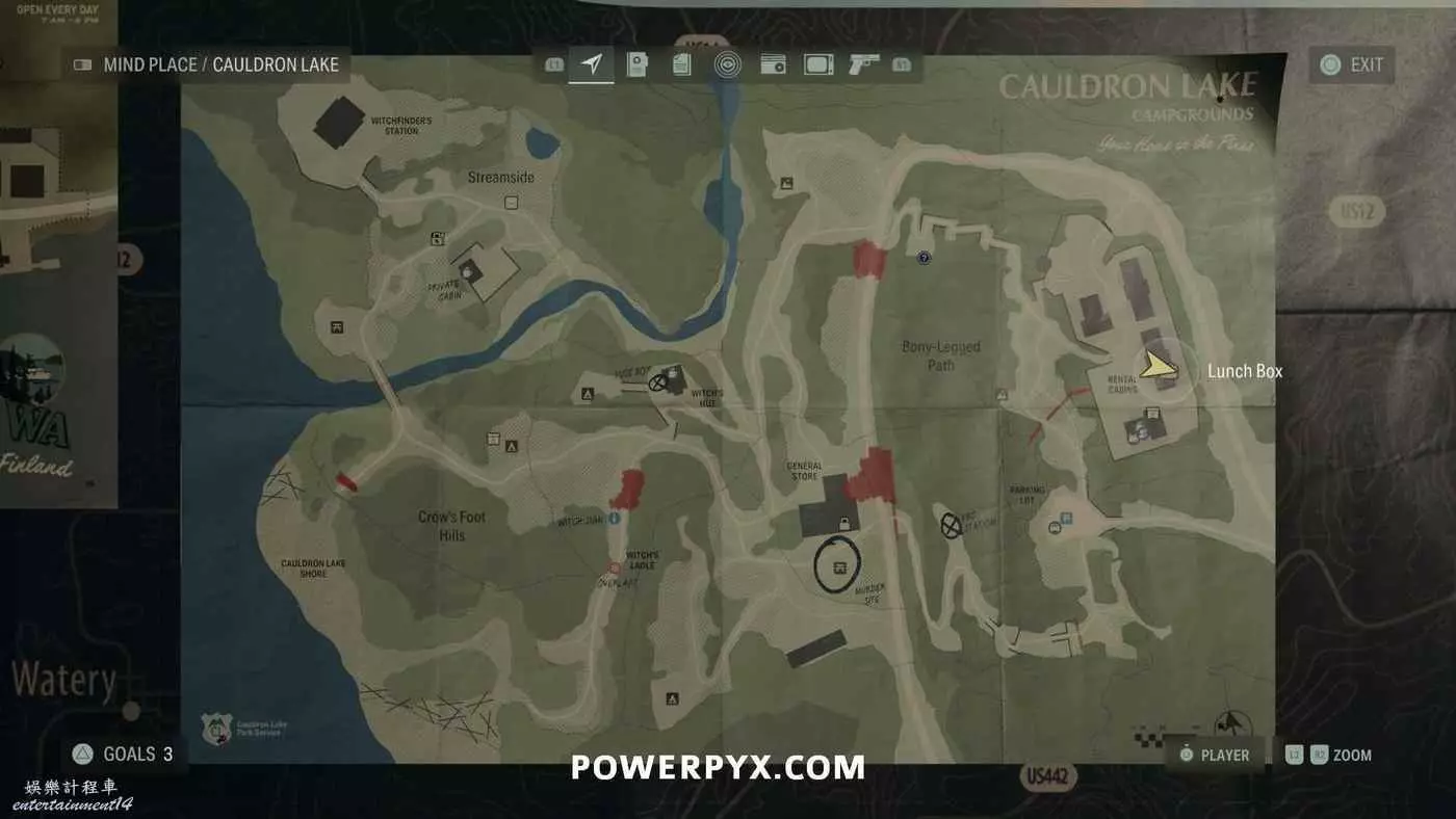 返回巨釜湖,利用斷線鉗進入北邊的出租小木屋。午餐盒在2號小屋裡,需要先穿過3號小屋才能到達。