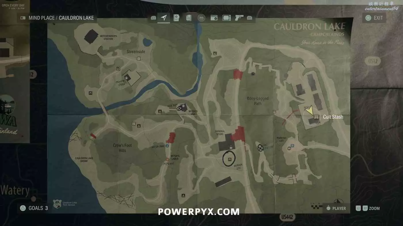 • 22個藏匿物、21個午餐盒:【銅-秘密藏匿物】發現一個邪教藏匿物和一個午餐盒、【銅-隱於林間】找到所有的邪教藏匿物和午餐盒