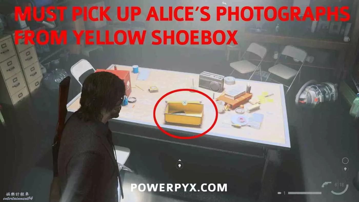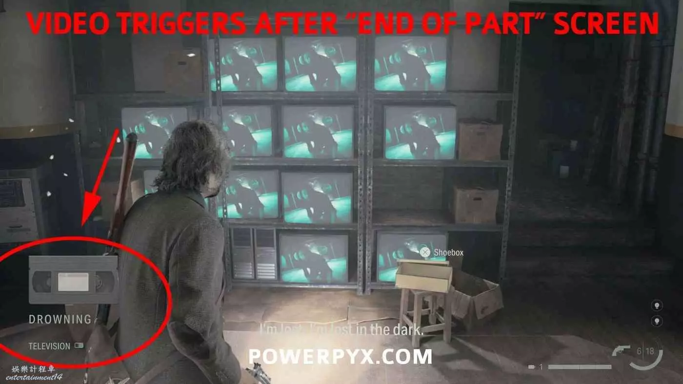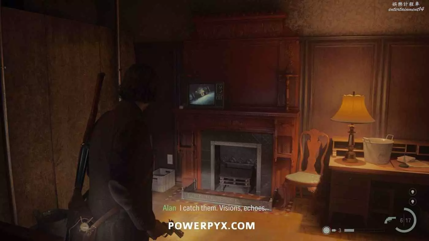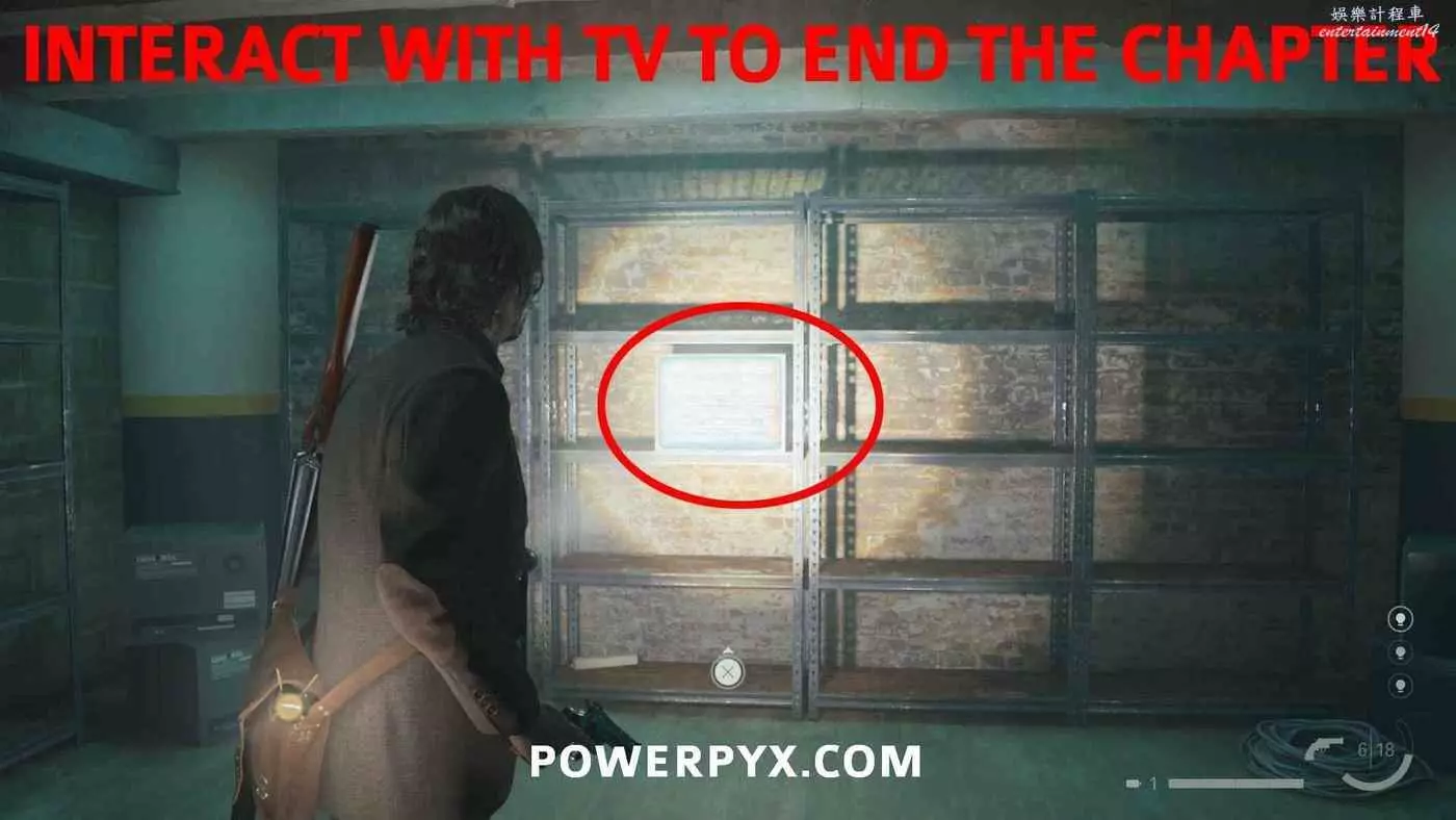 到達門衛室後穿過門衛身後的門到達地下室,在樓梯盡頭右轉,進入右邊道路盡頭的門,按住×/A轉換光影。走出房間右轉,之前有牆的地方現在可以下樓了,前往地下室的車間再次轉換光影,與鞋盒互動拾取愛麗絲的照片,這是觸發本章結尾視頻的必要條件。返回上層,前往地圖西北邊房間裡的電視,與電視互動,螢幕左下方會顯示有新視頻。注意在拿到愛麗絲照片之前先不要與電視互動,否則將無法觀看此視頻,並且之後也無法查漏補缺。如果此時已經錯過了,可以重新讀取之前的自動封存,檢查艾倫房間的電視以確保正確計數。