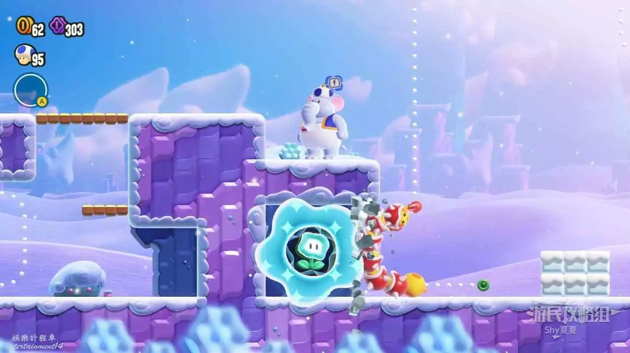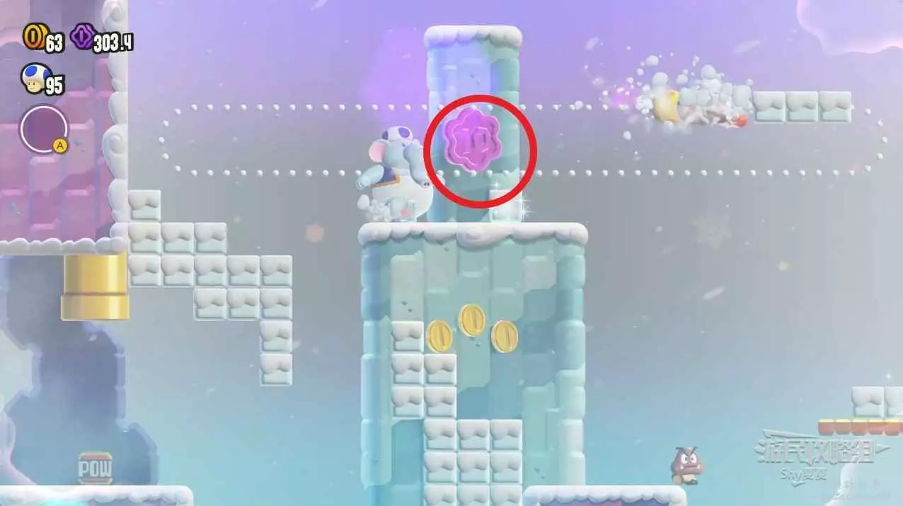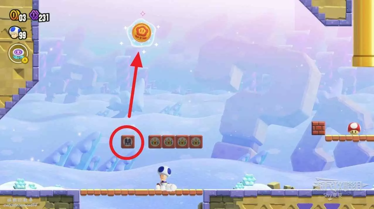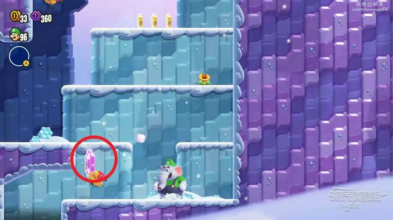 過了中間旗,會有一個推大冰塊的敵人,在大冰塊上往右走。碰到一個小藍花,就能在盡頭獲得第三個紫幣了。如果你覺得難度大,可以攜帶【徽章-出現!磚塊】。