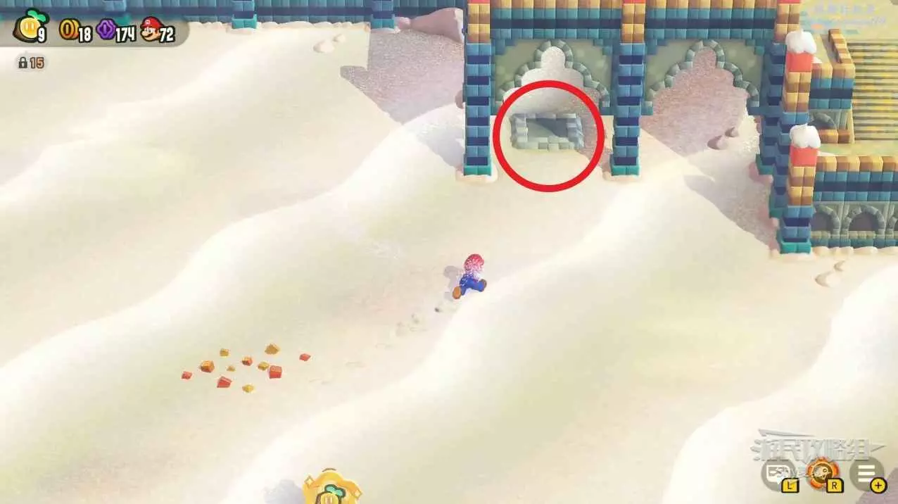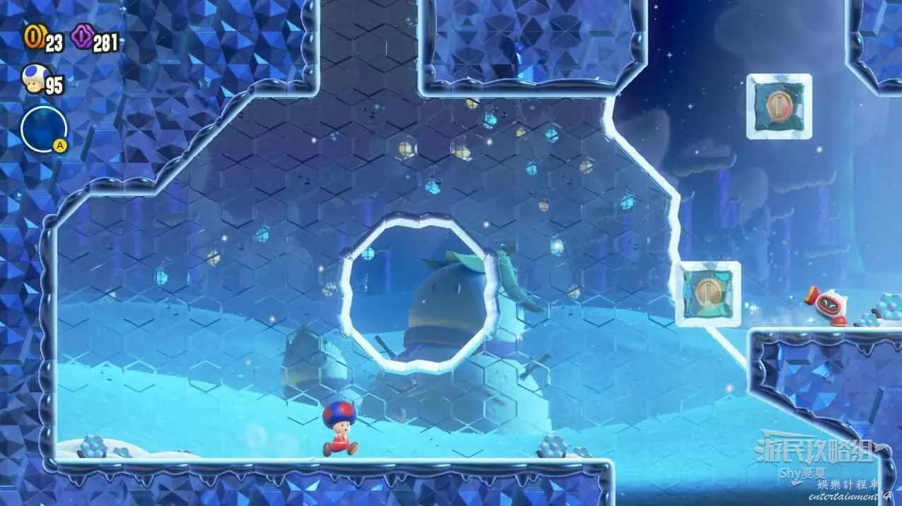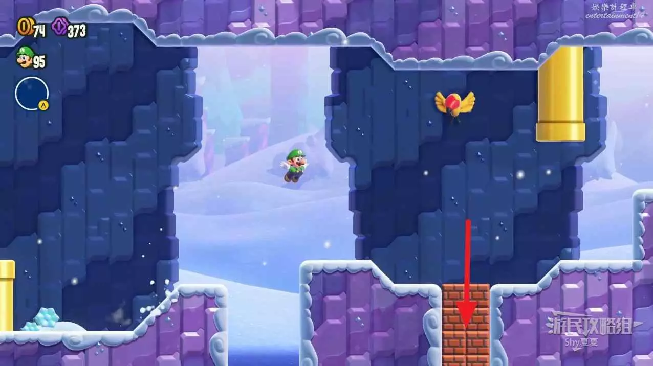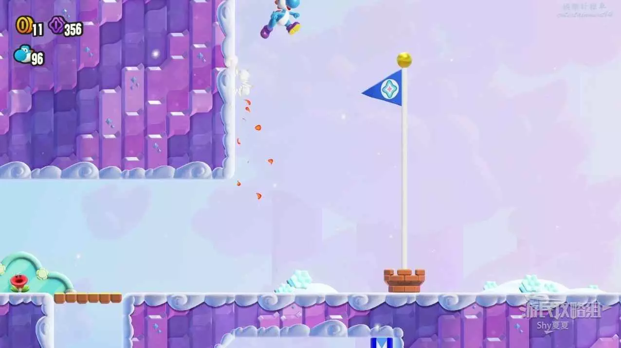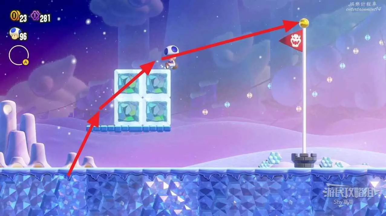 過了中間旗,會有一個推大冰塊的敵人,在大冰塊上往右走。碰到一個小藍花,就能在盡頭獲得第三個紫幣了。如果你覺得難度大,可以攜帶【徽章-出現!磚塊】。