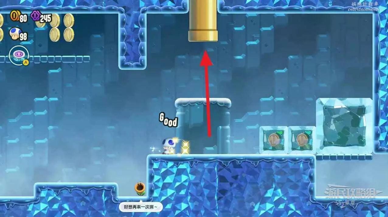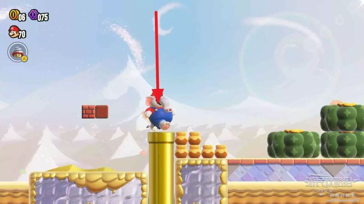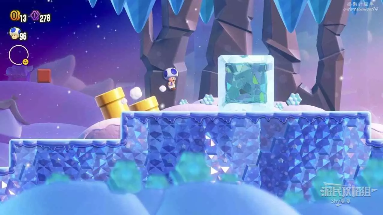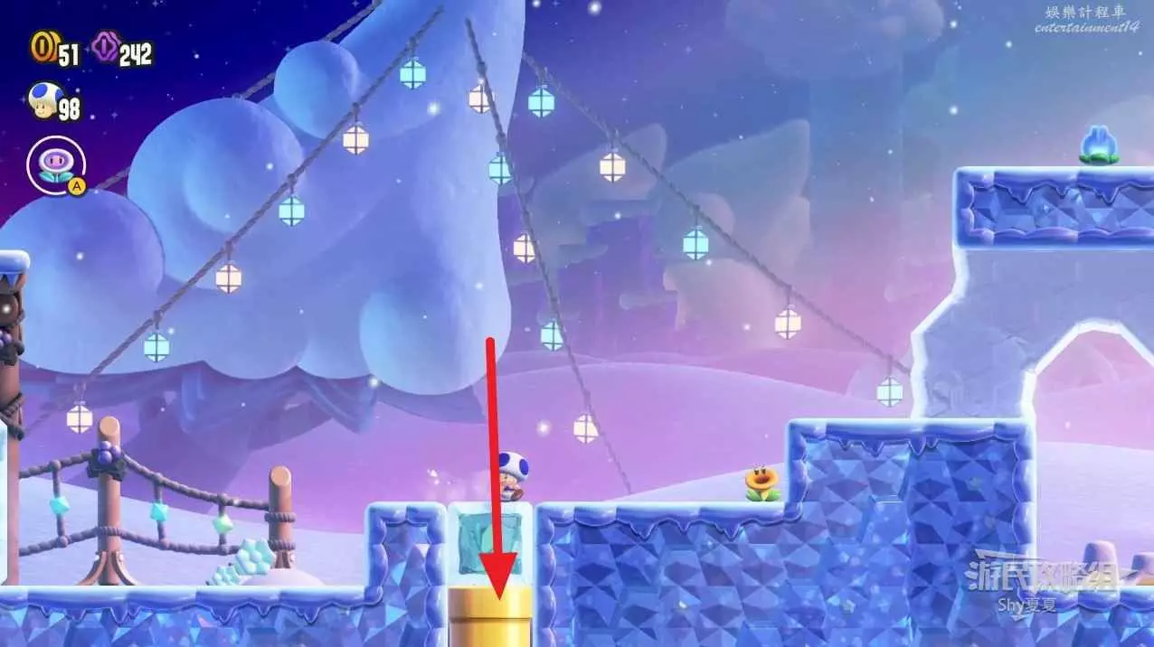 拿到第一個紫幣後,往右走,會看到有一個黃色管子,上面有一個小冰塊,直接坐兩次把冰塊坐碎,進入管子。