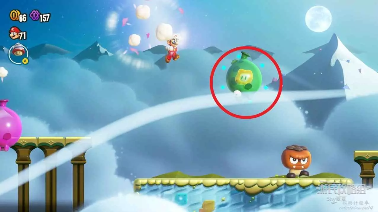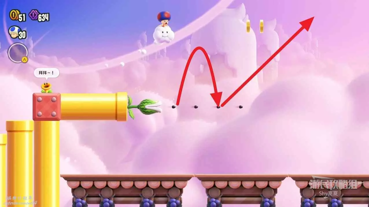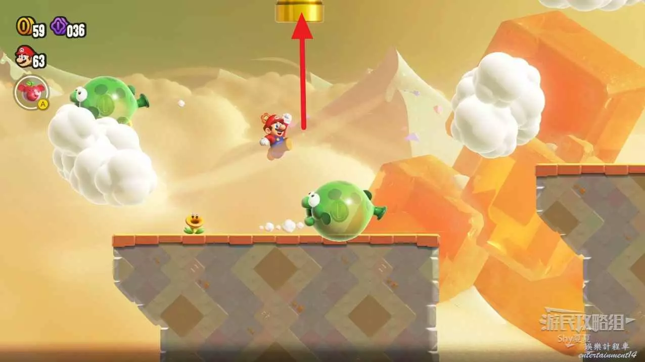 通過中間旗後,右側雲裡藏著驚奇花,跳躍進入驚奇世界。
