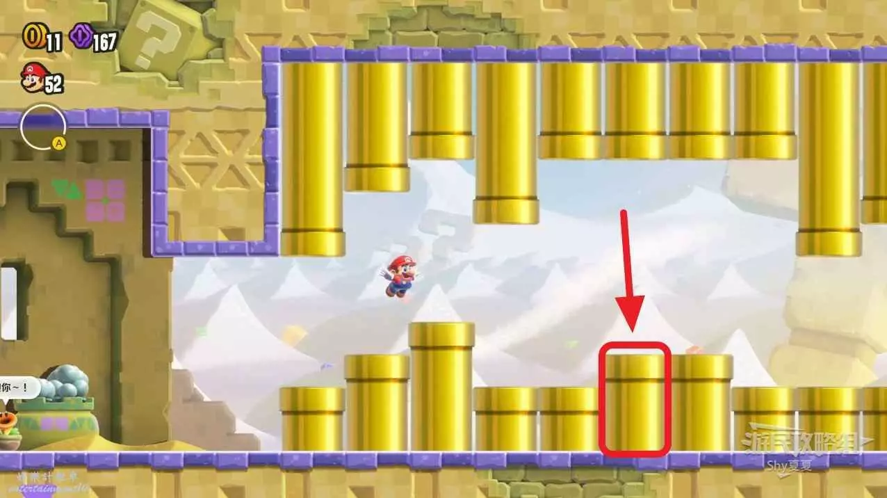 第二個中間旗右側,會有推炮臺車的敵人,第一個炮臺車不用管,第二個把車推到最右側的凹槽中。然後進入銀色管道。在管道獲得第三個紫幣。