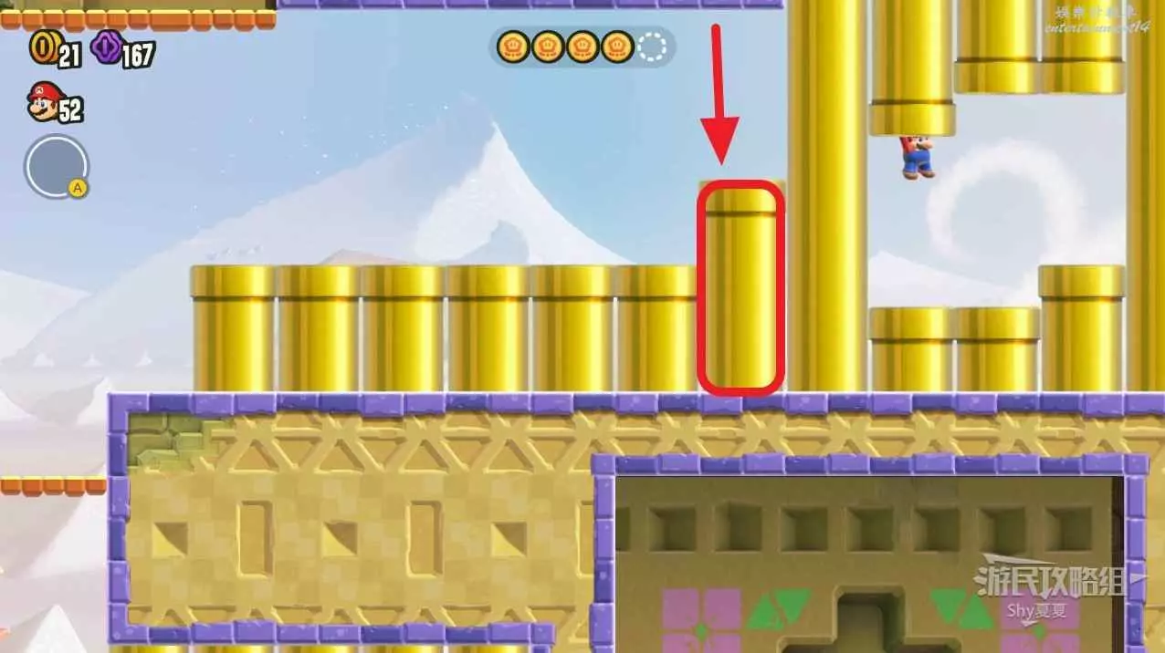 一樣收集5個硬幣,本關建議攜帶【徽章-下蹲跳】。第一個在下圖紅框的管道內。