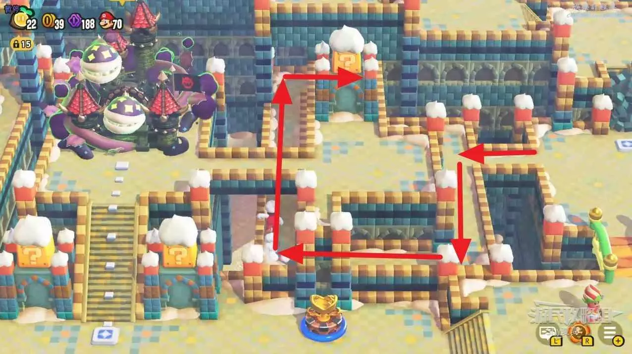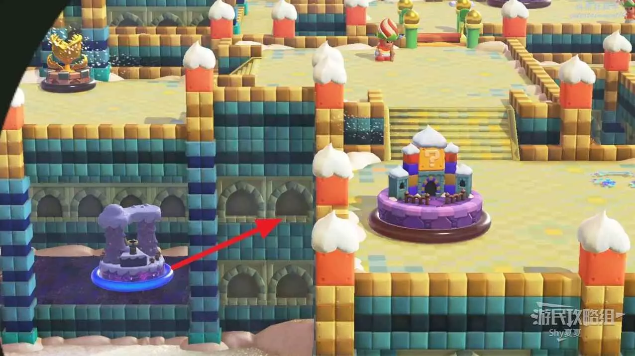 從驚奇世界出來後,頂碎最左邊的兩個冰塊,就能調到上層拿取滿分旗了。