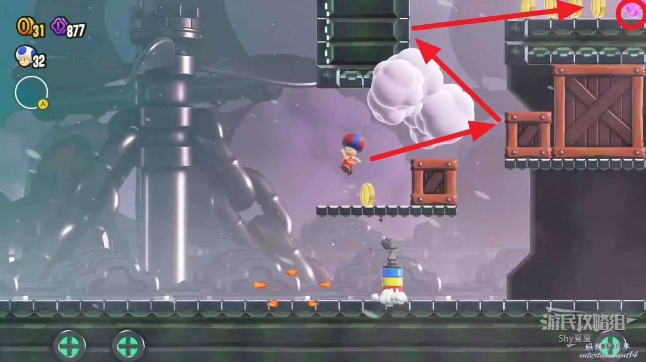 來到上層後,會看到第一個紫幣,需要將開關變為紅色才能拾取。
