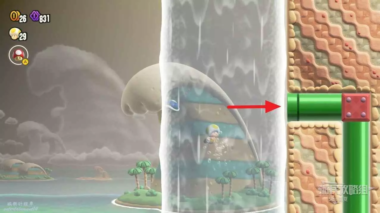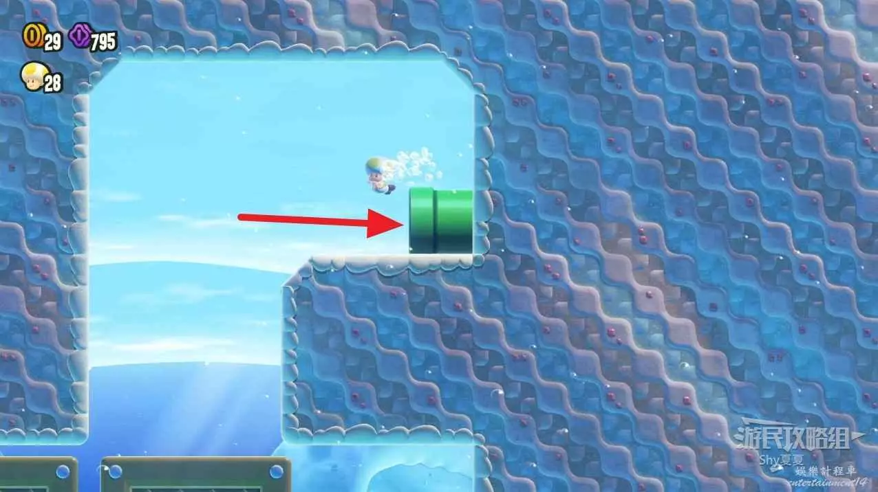 獲得第一個紫幣後,利用綠色氣球魚跳到上方的管道,裡面可以獲得第二個紫幣。