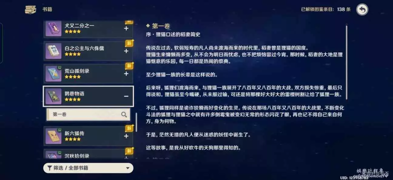 十處殘頁集齊後,在背包裡合成《鹮巷物語·序》,可以書籍查詢鹮巷物語第一卷