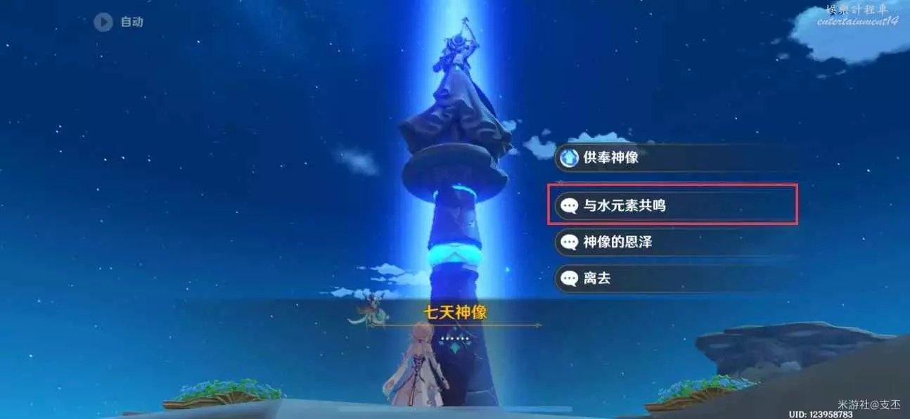 主角接觸楓丹七天神像,互動,選擇“與水元素共鳴”
