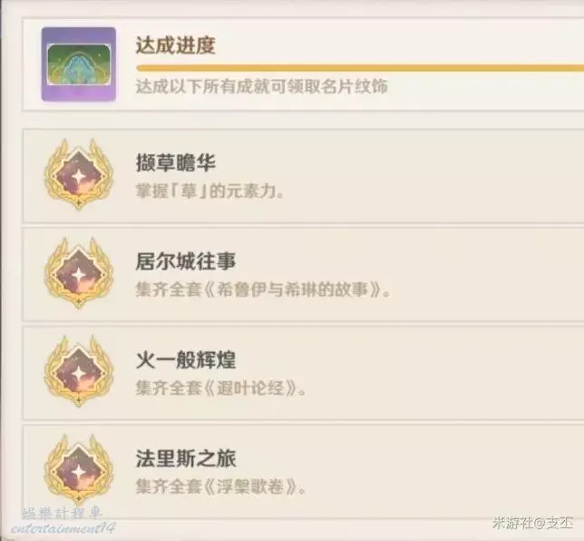 需要達成居爾城往事、火一般輝煌、法裡斯之旅、擷草瞻華四個成就。