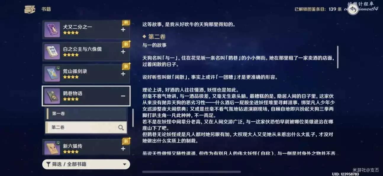 十處殘頁集齊後,在背包裡合成《鹮巷物語·一》,可以書籍查詢鹮巷物語第二卷