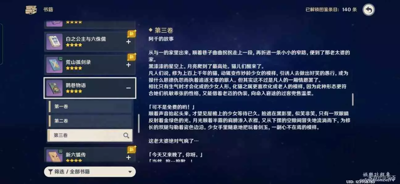 十處殘頁集齊後,在背包裡合成《鹮巷物語·二》,可以書籍查詢鹮巷物語第三卷