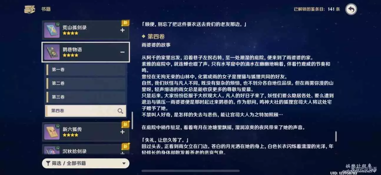 十處殘頁集齊後,在背包裡合成《鹮巷物語·三》,可以書籍查詢鹮巷物語第四卷