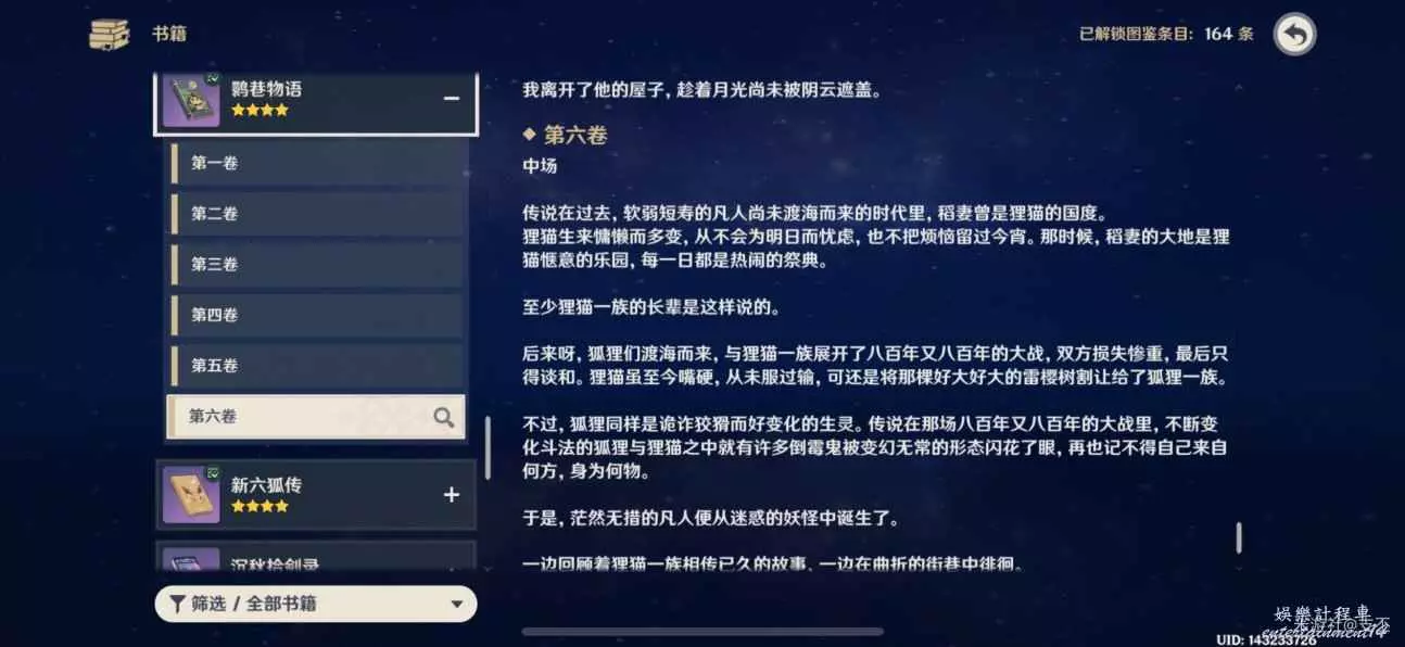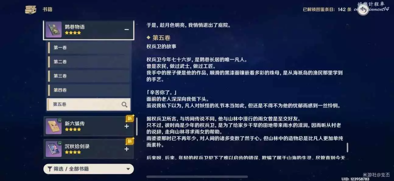十處殘頁集齊後,在背包裡合成《鹮巷物語·五》,可以書籍查詢鹮巷物語第六卷