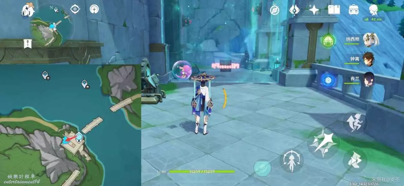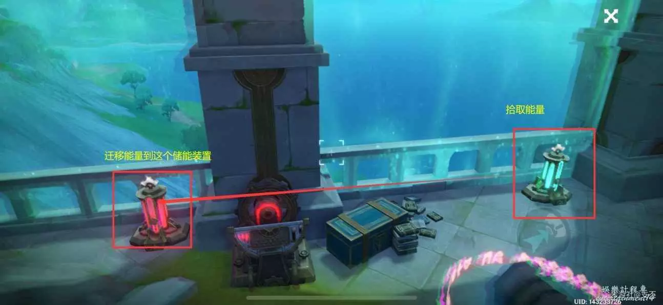 1、先啟動「遷能終端」,視野往下移,拾取綠色儲能裝置的能量,遷移至紅色的儲能裝置,至此屏障解除