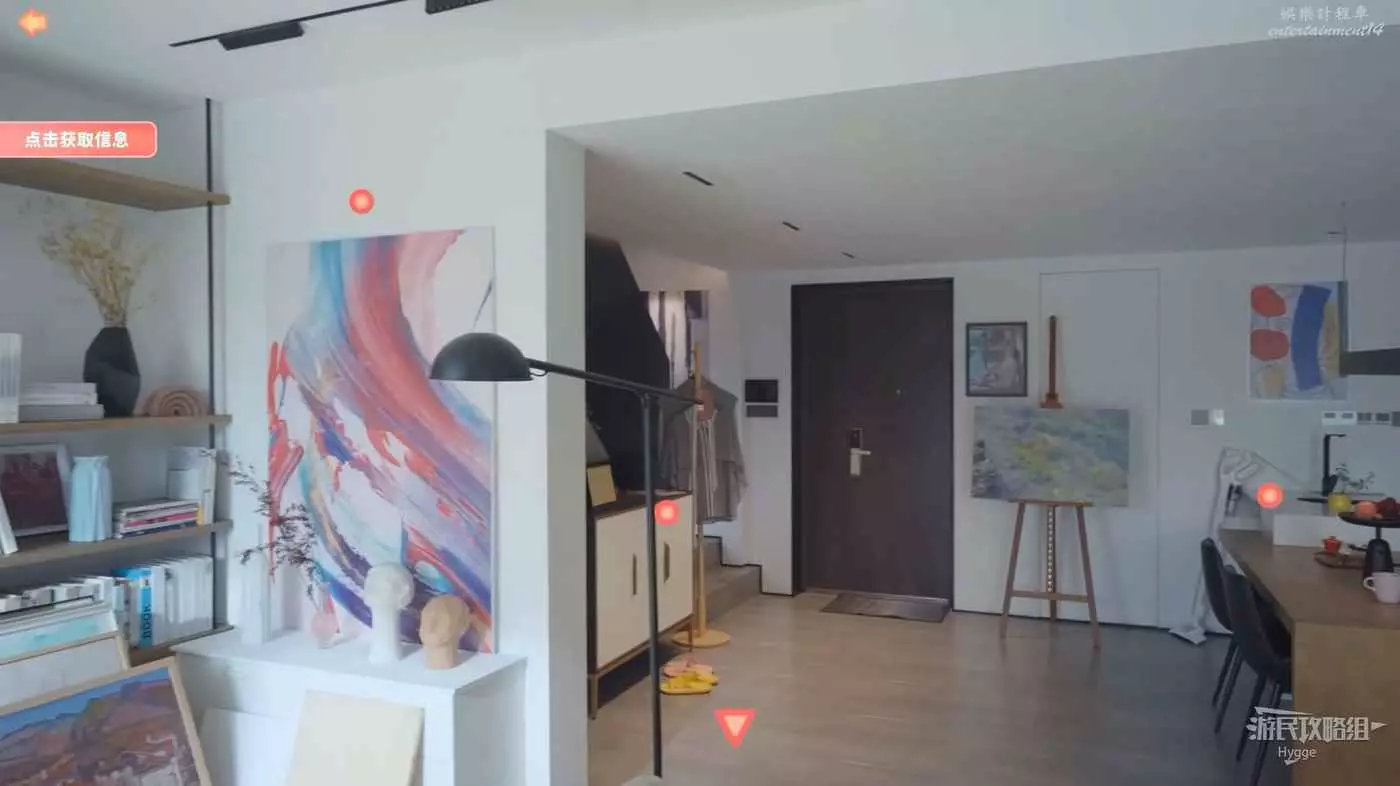 進入遊戲後點擊遊戲內的紅點區域對房間進行探索。關鍵線索是牆壁上的畫、鞋櫃上的日曆、水槽旁的洗地機和茶几上的杯子,將上述幾個物品都調查一遍後繼續觀看劇情。