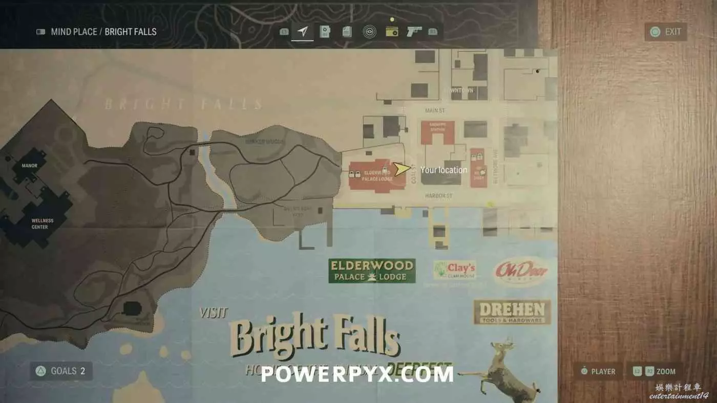 返回汽車,與左側車門互動開車前往輝落鎮,到達古木宮殿旅館後,進入宮殿與右後方的私人房間內的鹿頭互動。