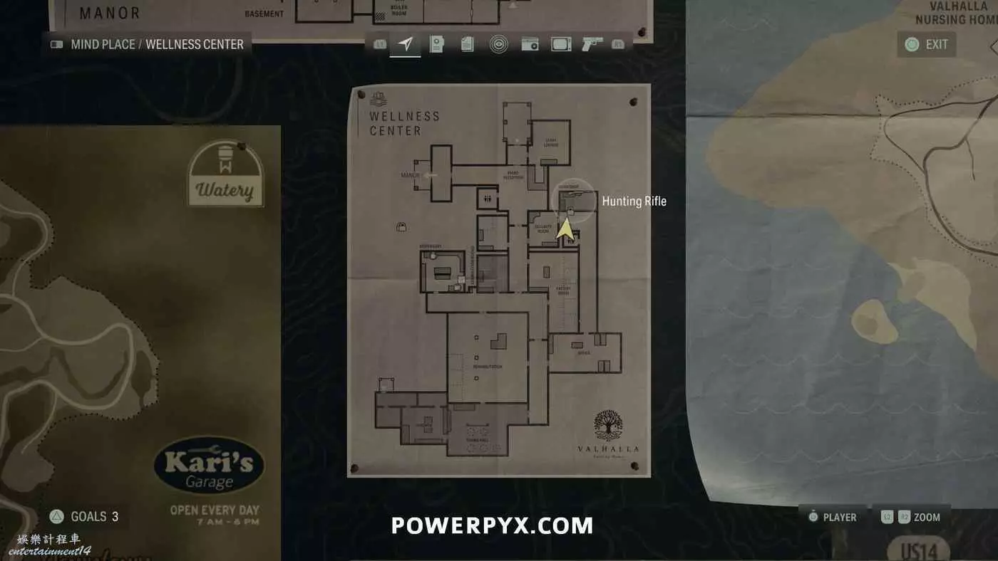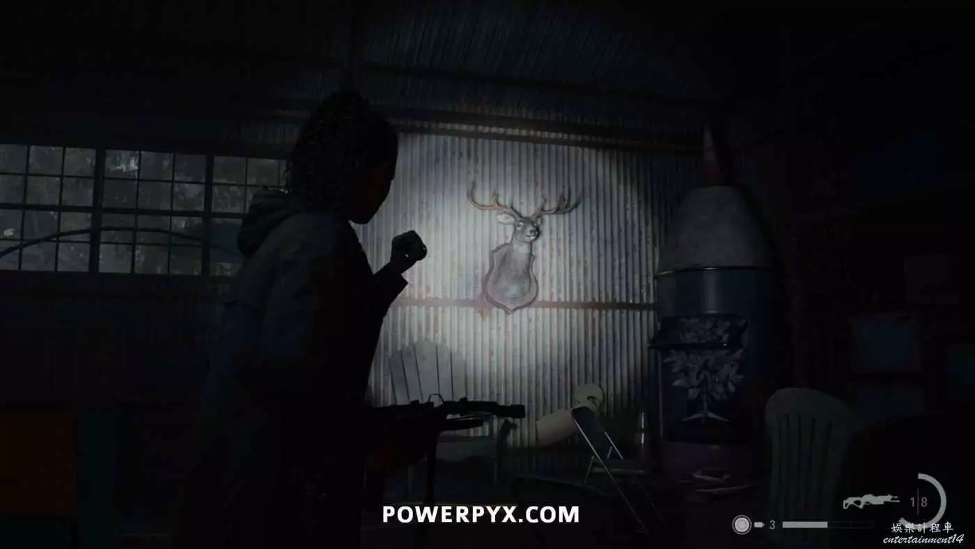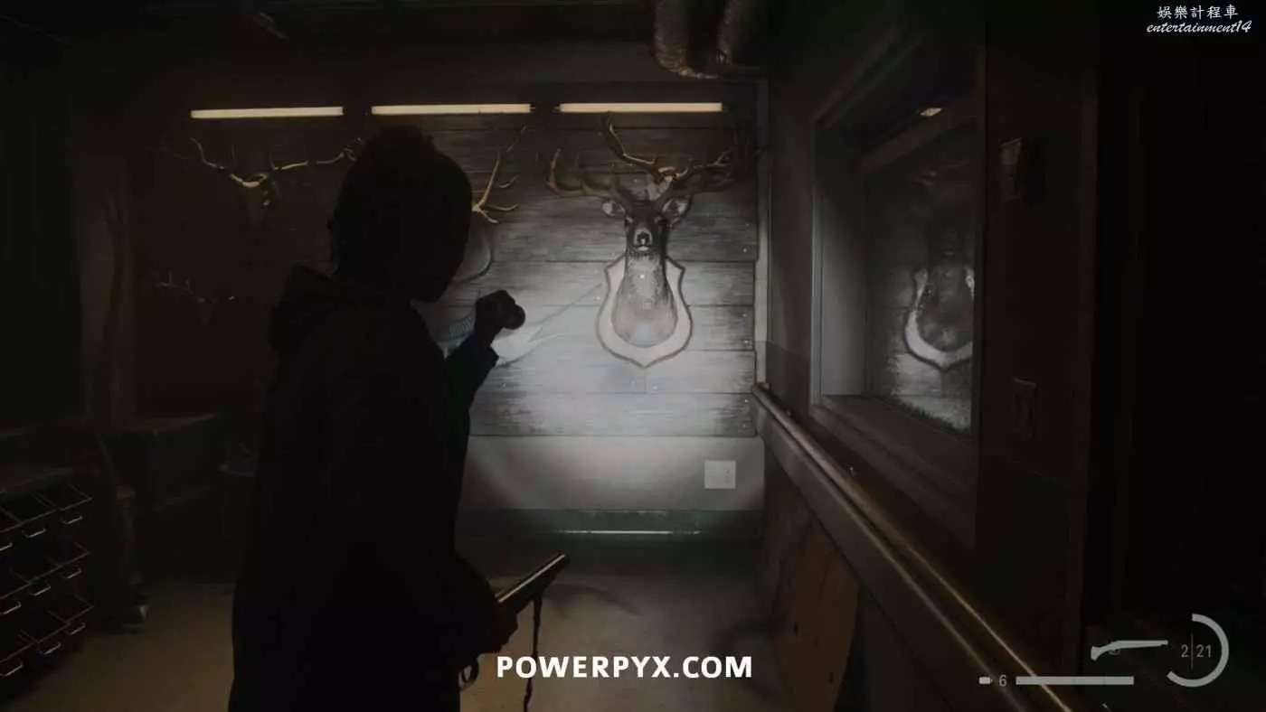 到達保健中心的保安室後,輸入密碼170823或081723通過電腦打開大門。往北走到員工休息室和接診台後方,打開接診台後面的一個箱子,然後返回保安室,打開保安室右邊的門即可找到獵槍,鹿頭就和獵槍在同一個房間裡。