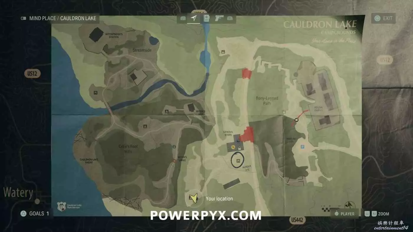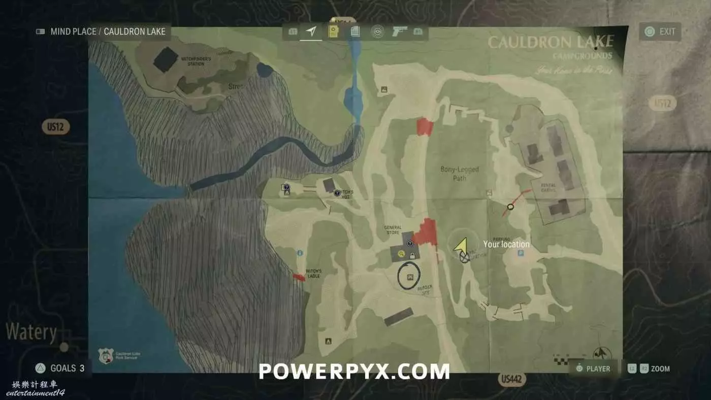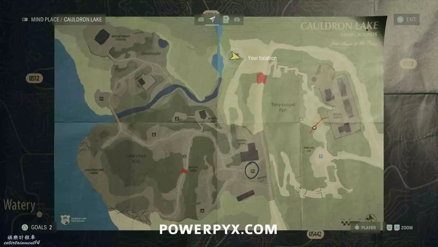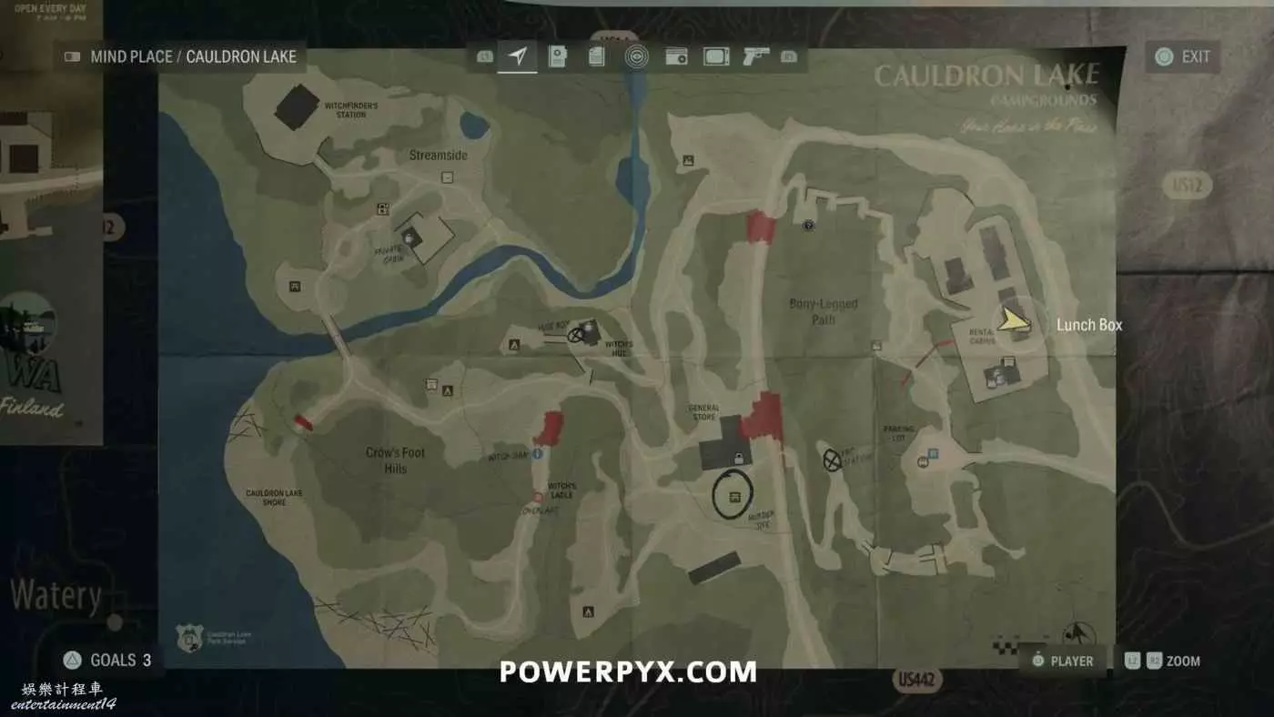 返回巨釜湖,利用斷線鉗進入北邊的出租小木屋。午餐盒在2號小屋裡,需要先穿過3號小屋才能到達。
