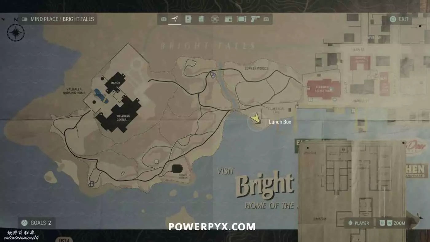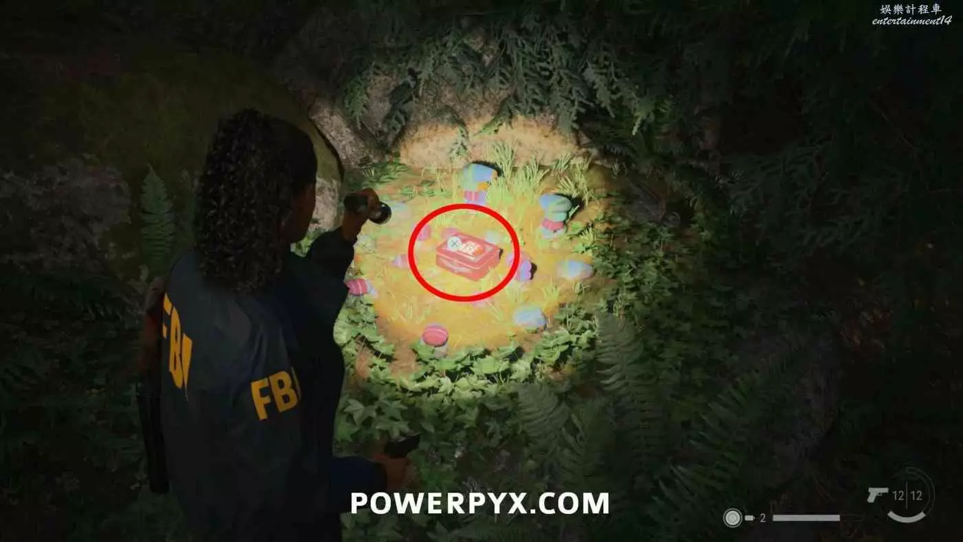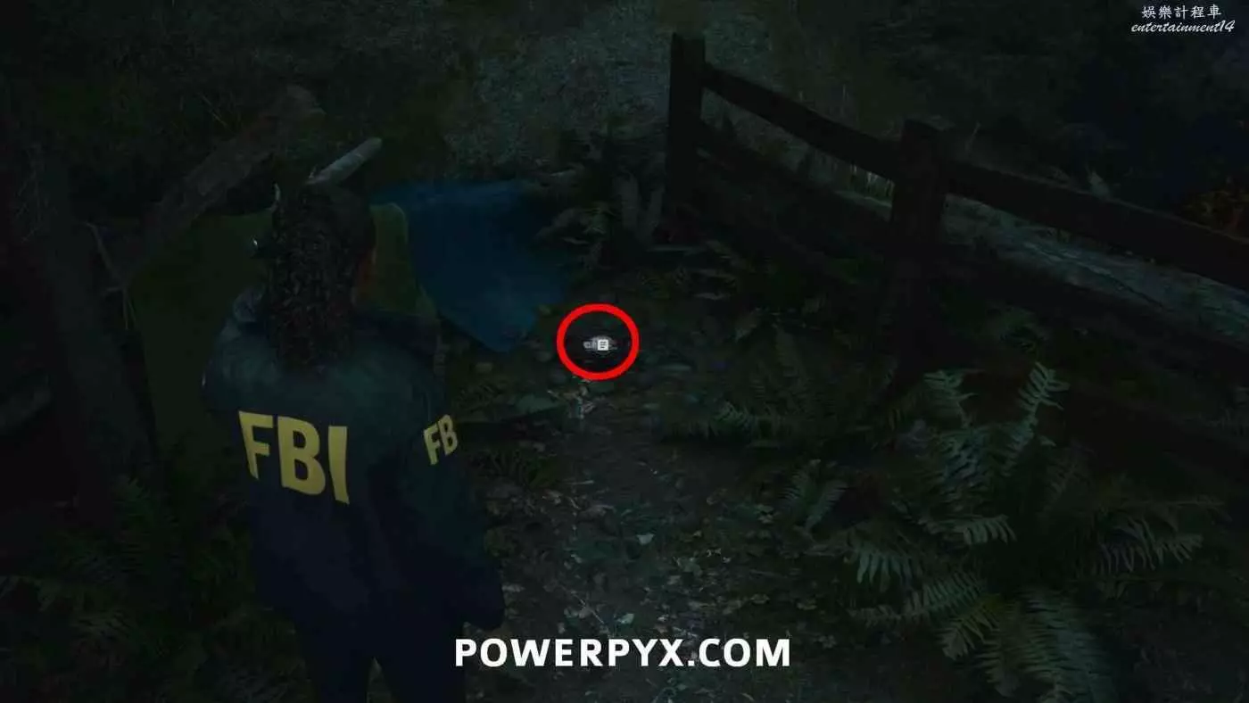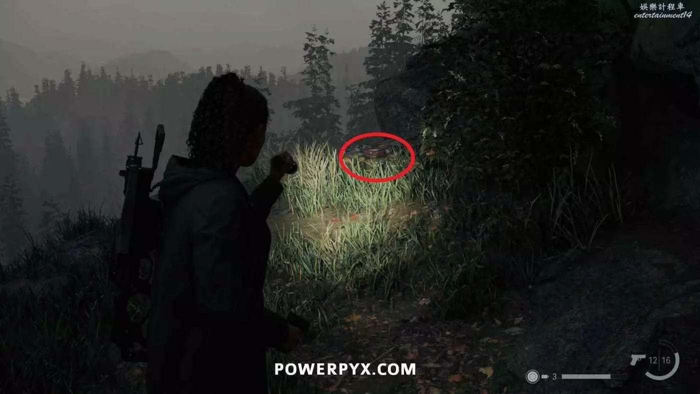 推進劇情到從副警長那裡獲得捷徑鑰匙後,需要跟著凱西上山返回本章開頭的汽車所在位置,在捷徑途中有一棟小房子,爬上小房子後面的高台即可找到這個午餐盒。