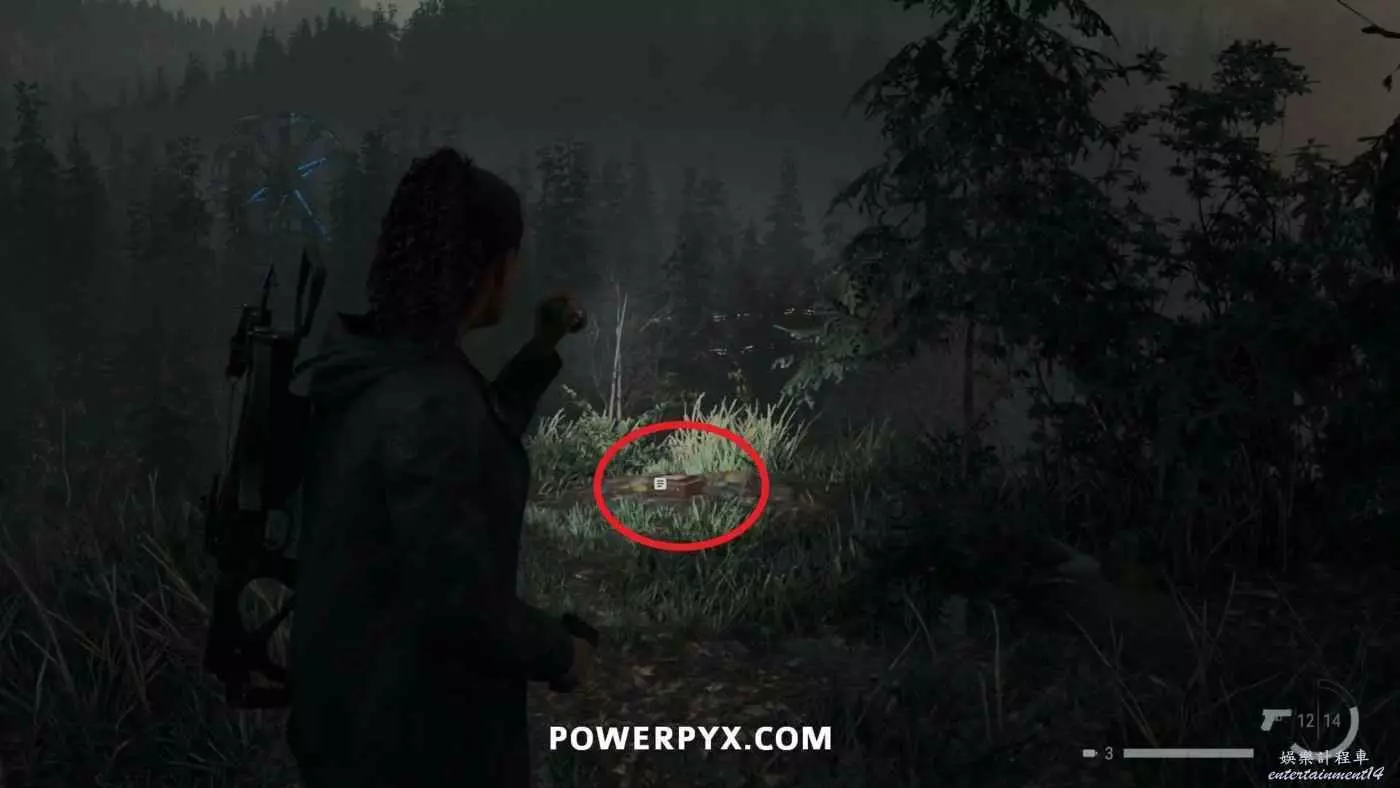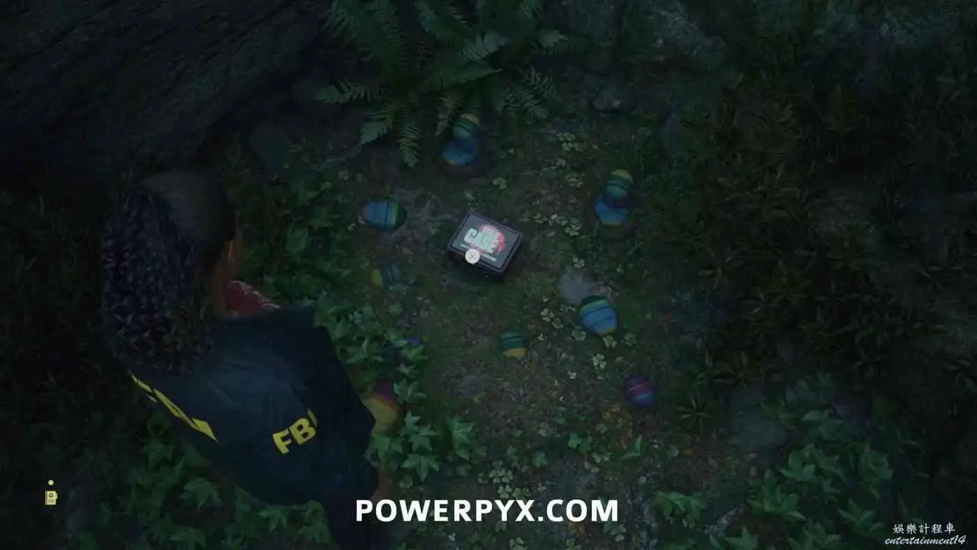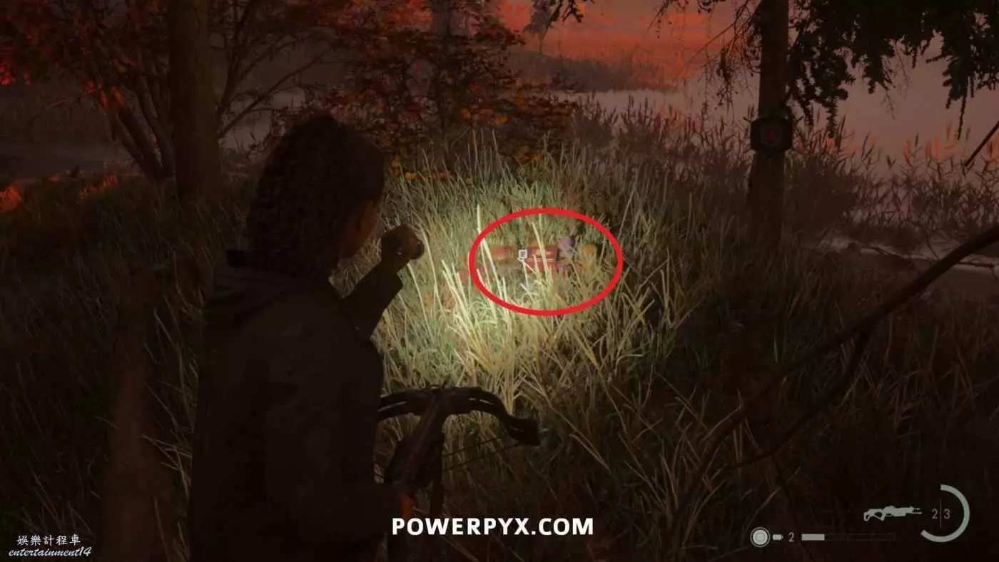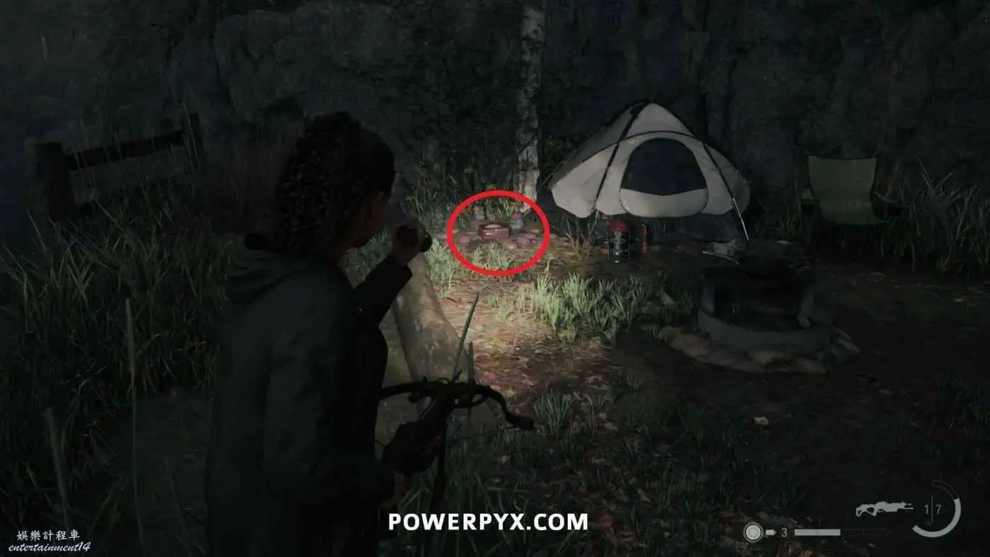 推進劇情到從副警長那裡獲得捷徑鑰匙後,需要跟著凱西上山返回本章開頭的汽車所在位置,在捷徑途中有一棟小房子,爬上小房子後面的高台即可找到這個午餐盒。