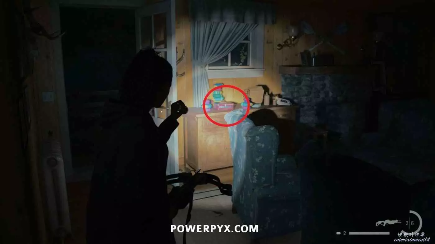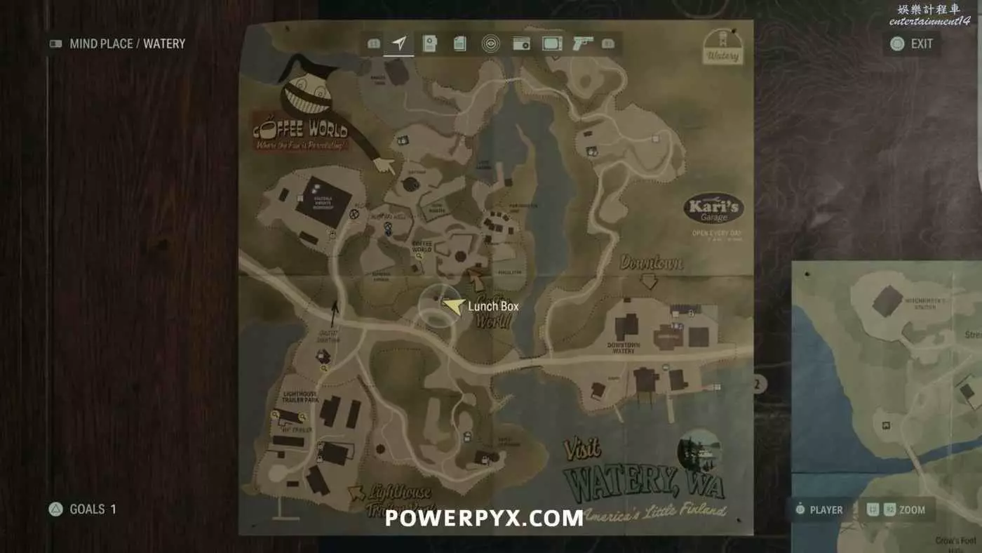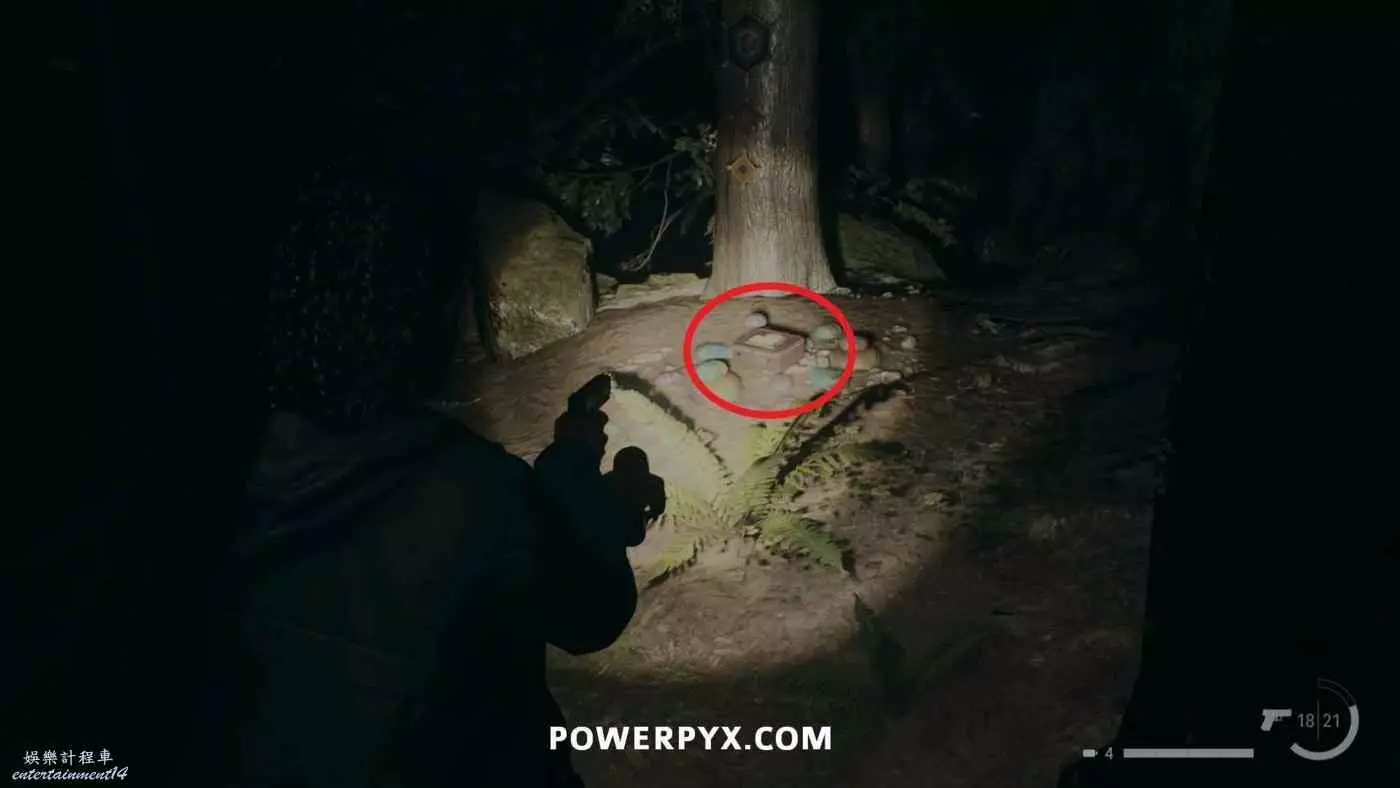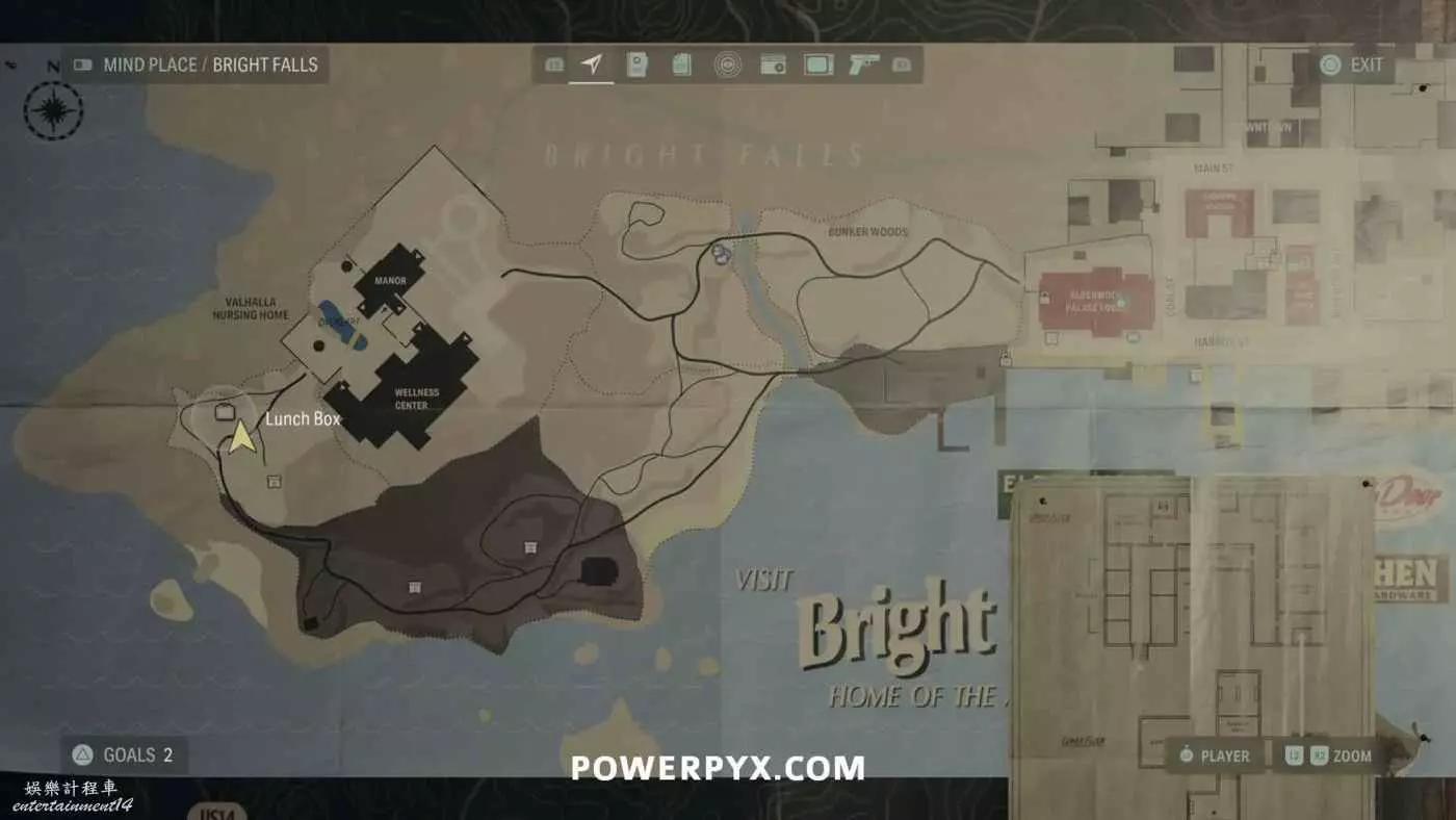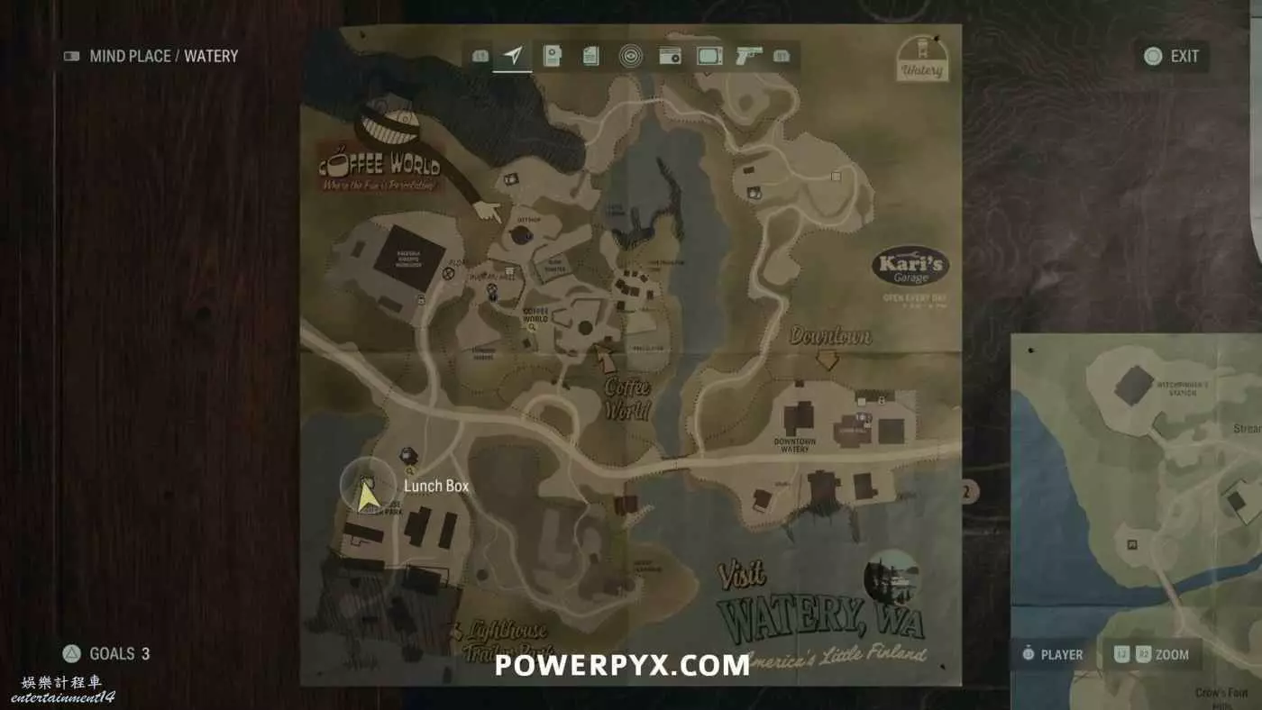 推進劇情到從副警長那裡獲得捷徑鑰匙後,需要跟著凱西上山返回本章開頭的汽車所在位置,在捷徑途中有一棟小房子,爬上小房子後面的高台即可找到這個午餐盒。