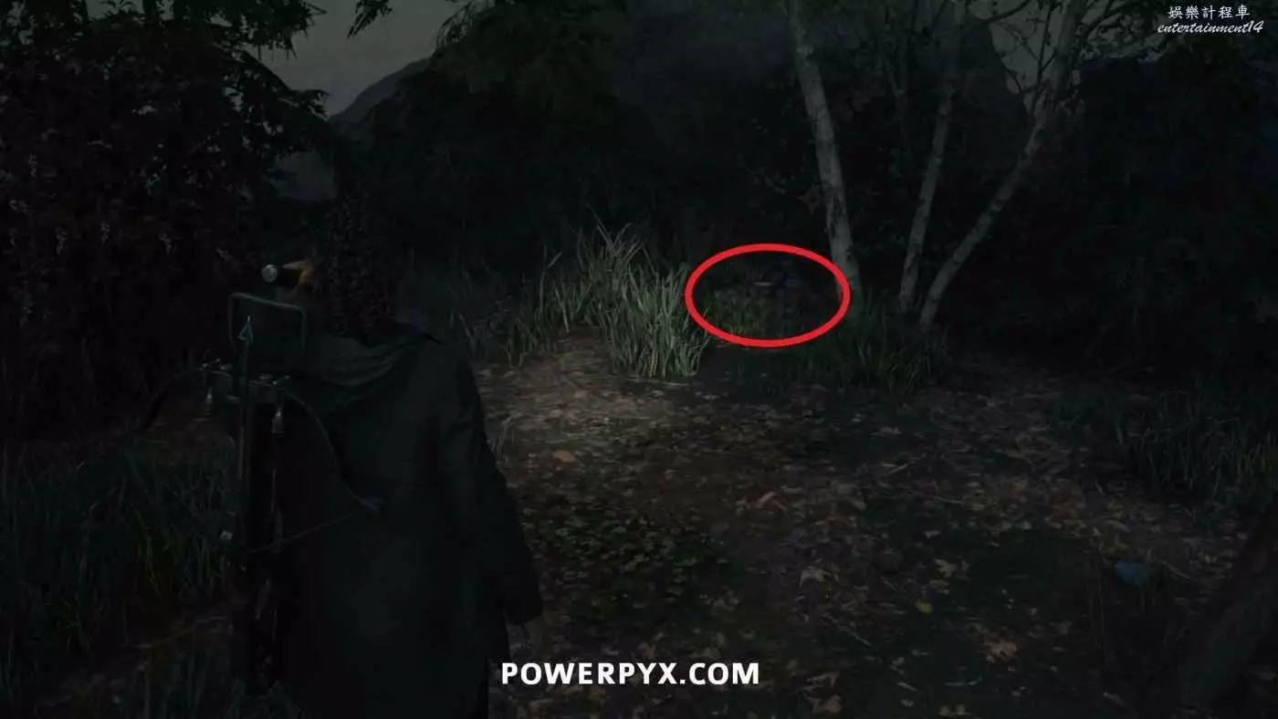 消除洪水後,在獵巫人小屋東北邊的灌木叢中,位於通往河濱的小路左側。