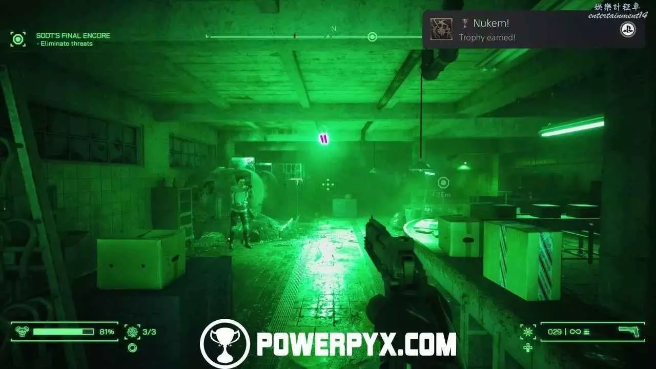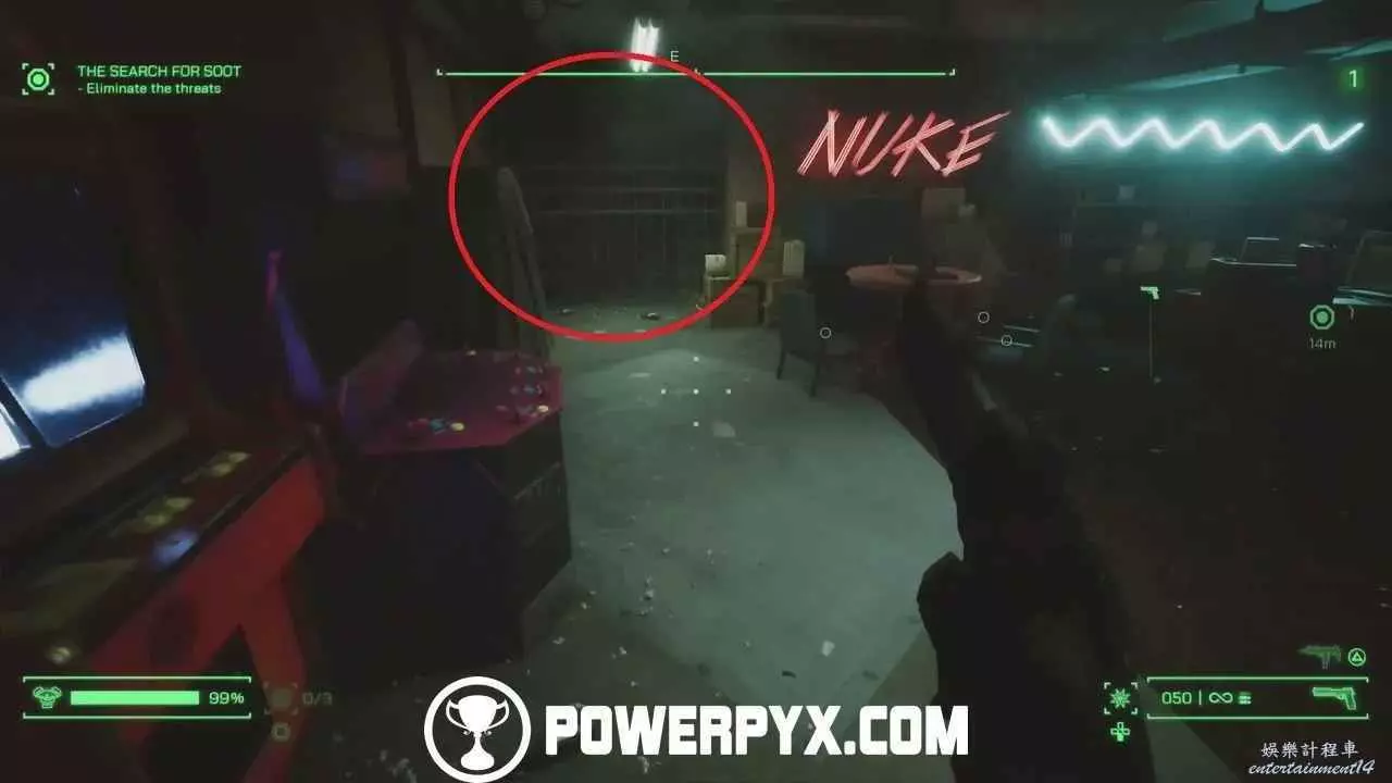 在【主線任務03搜尋蘇特】期間進入街機廳,跟隨劇情指引前往地下室尋找街機廳老闆。在老闆所在位置之前的房間裡掛著巨大的核彈標誌,還有許多敵人: