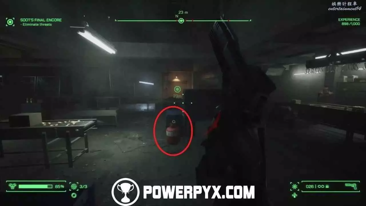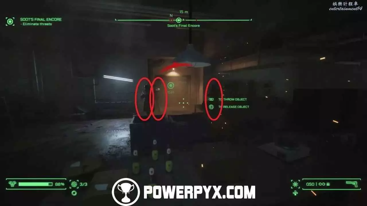 再往前走幾步就會有三個敵人從一扇門裡出來,把煤氣罐扔在敵人之間即可跳杯。建議選擇簡單難度,如果沒跳杯的話建議重新載入檢查點。也可以繼續嘗試使用這個房間裡的其他罐子應對新出現的敵人。