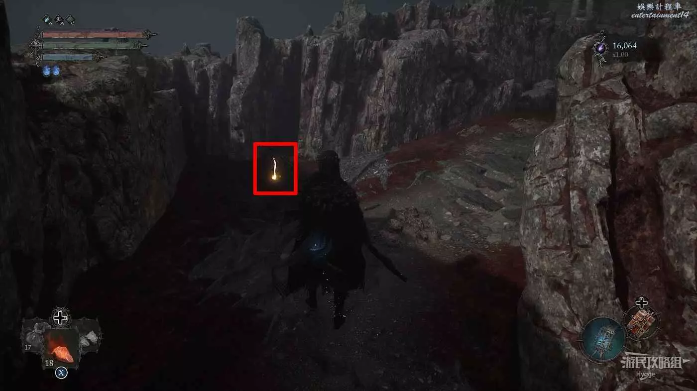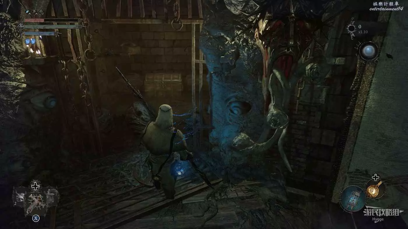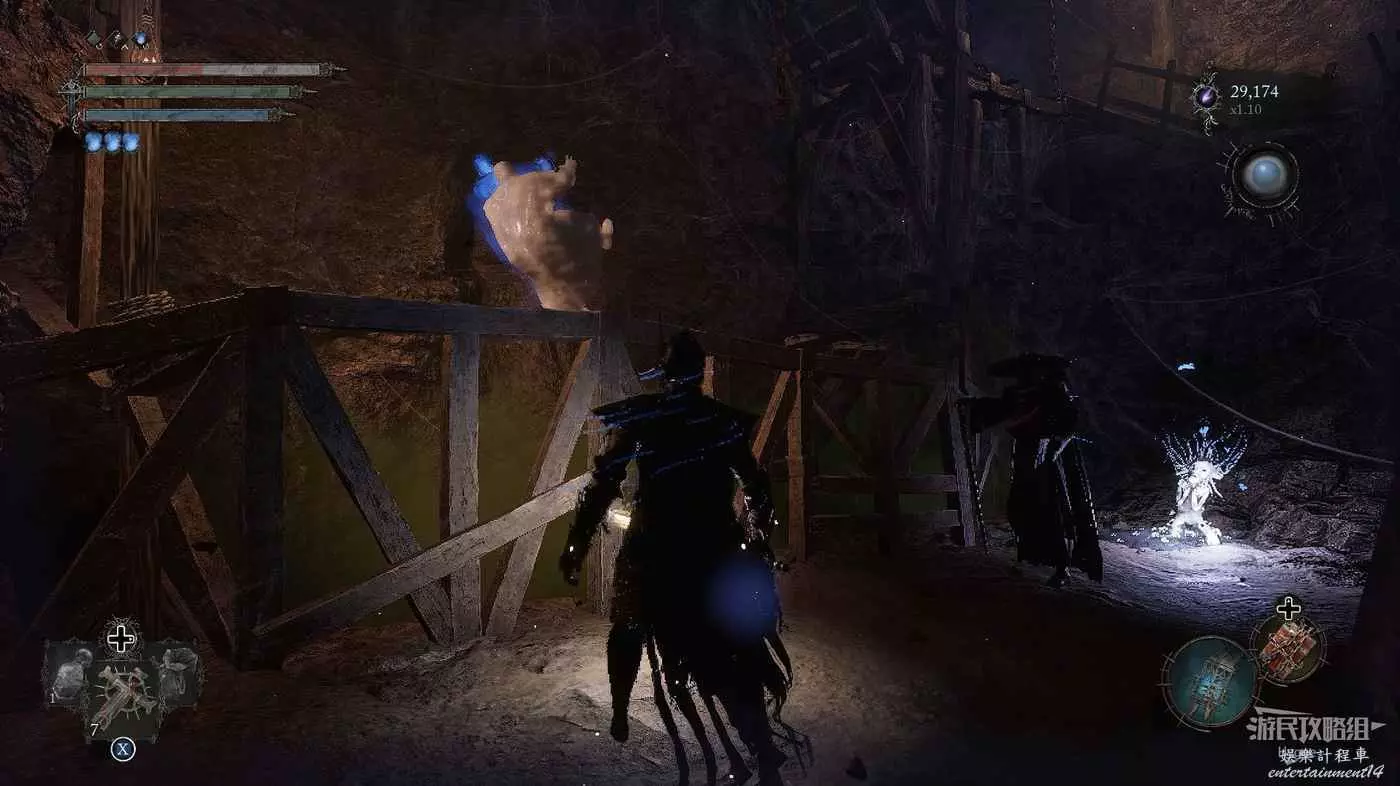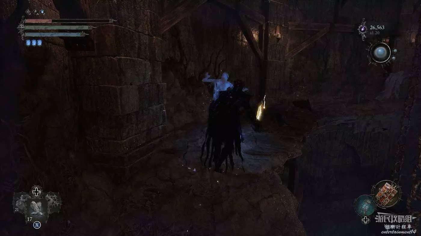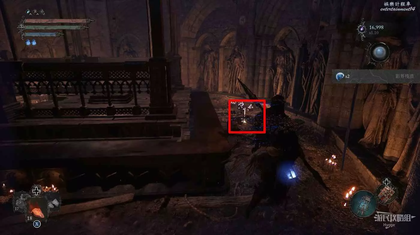 在上層進入影界,從右側平臺旁牆壁上的靈魂處可以獲得【麻木女巫莉蒂亞的影界之眼】。旁邊的道具是影界陷阱。